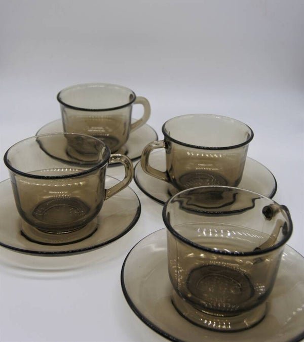 Vintage kop en schotel set in mooi rookglas van het Franse merk Arcoroc uit de 70's. Door het tijdloze kleur en materiaalgebruik zijn deze serviezen weer helemaal van nu!