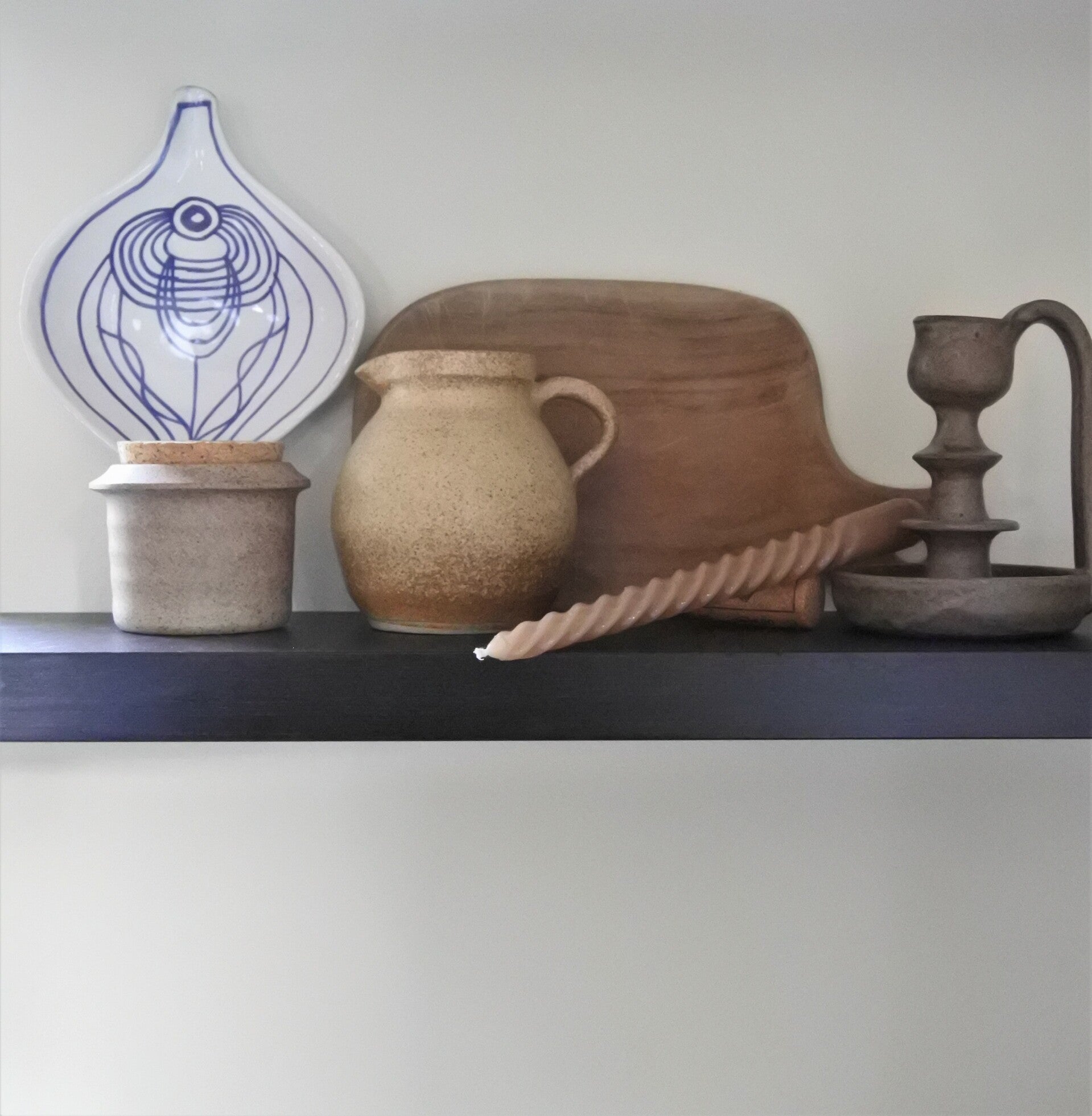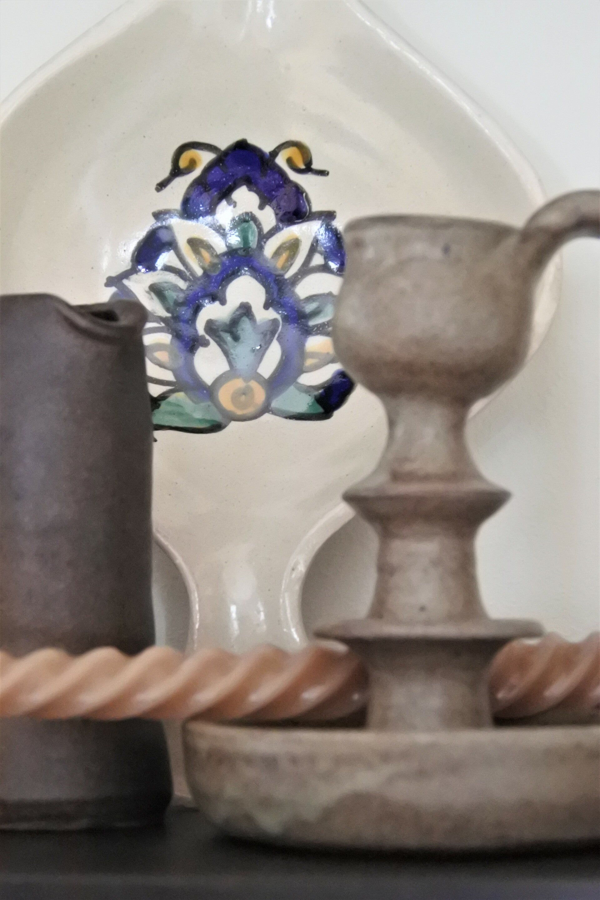 Vintage kandelaar in mooie taupe-groenachtige kleur met bruine accenten en bijzondere vorm. Deze kandelaar heeft een mooi tijdloos ontwerp, een blijvertje dus!