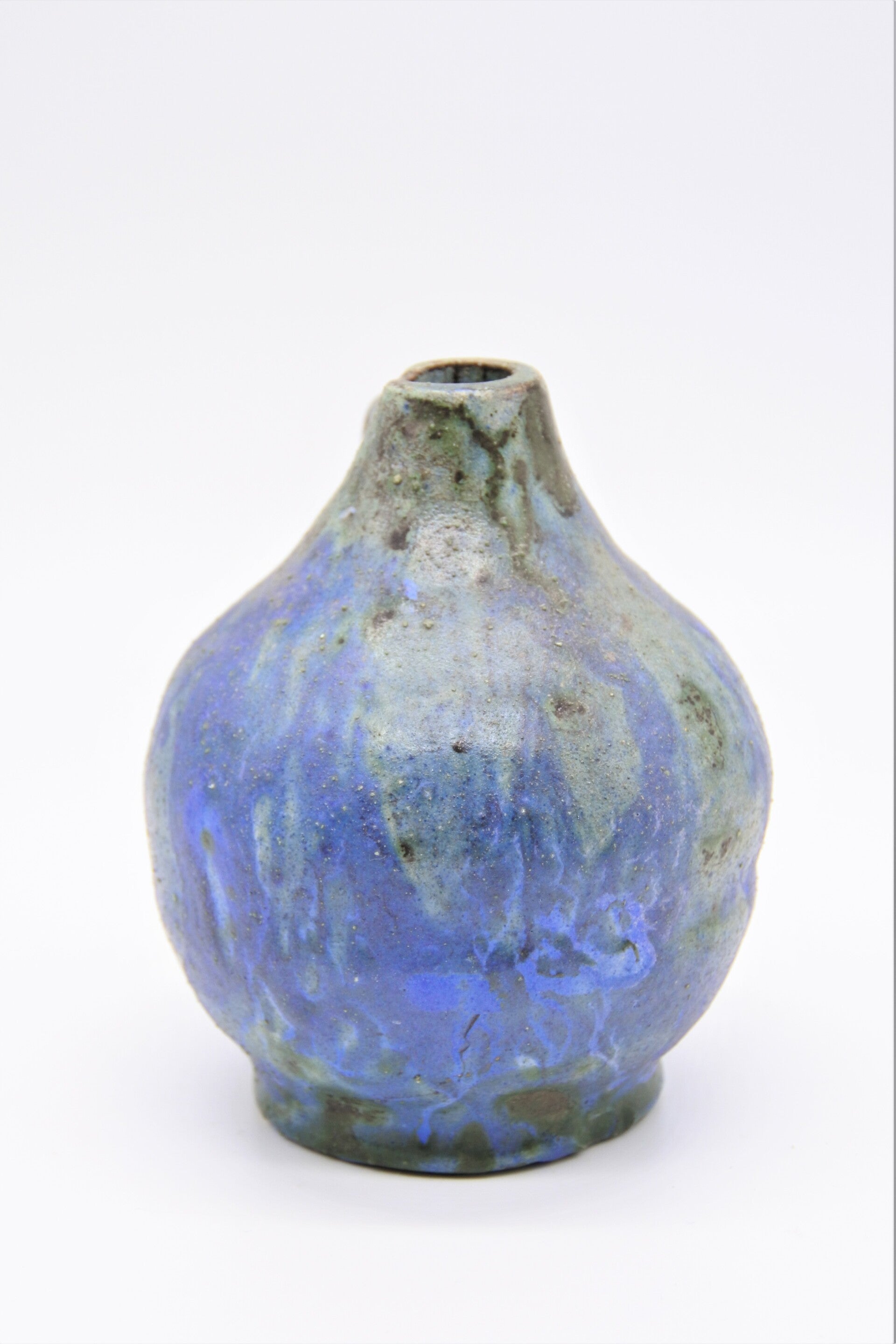 Vintage handgebakken en beschilderd vaasje met prachtig kleurgebruik in blauw, grijs en groen.