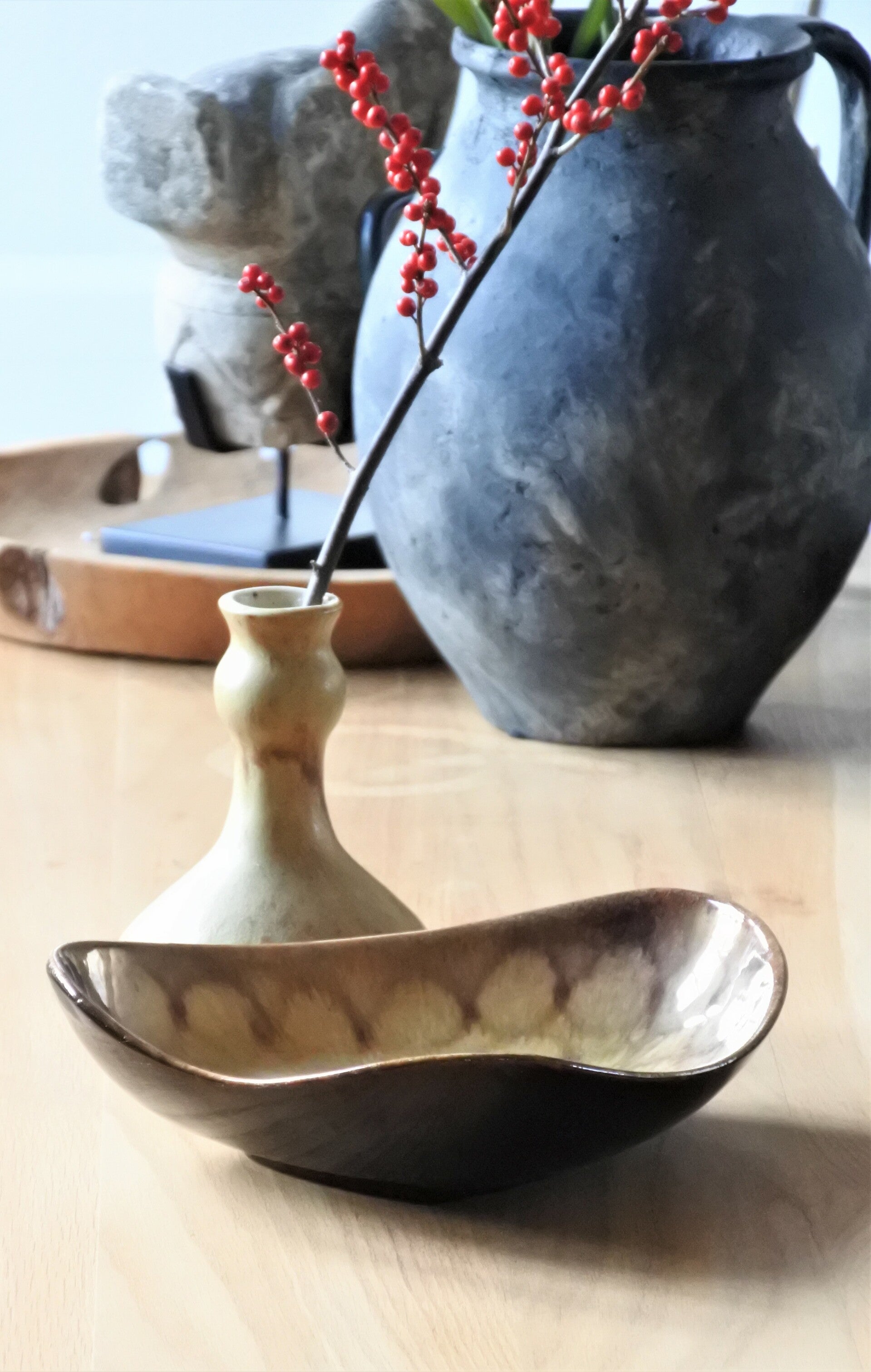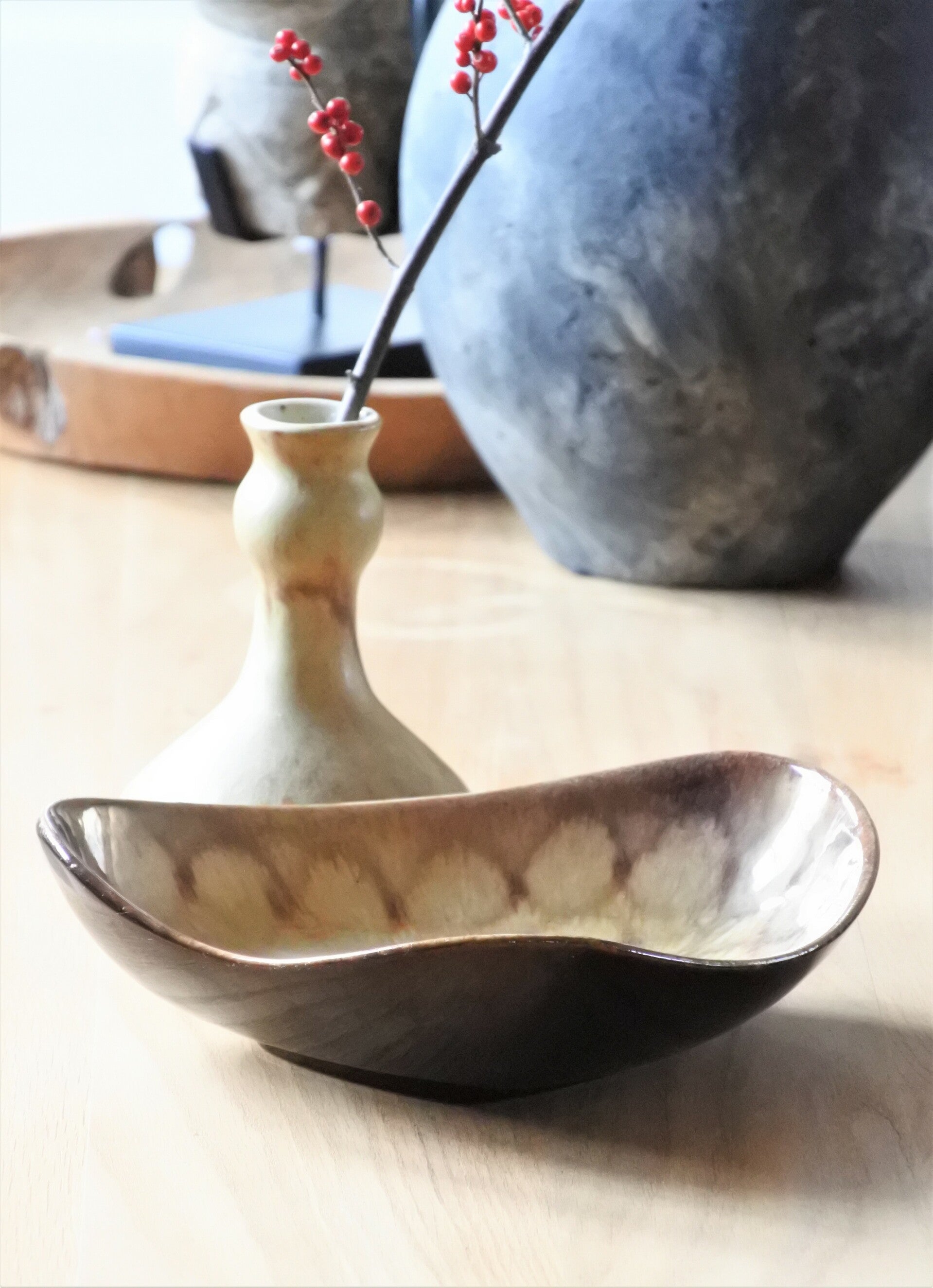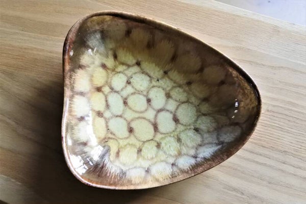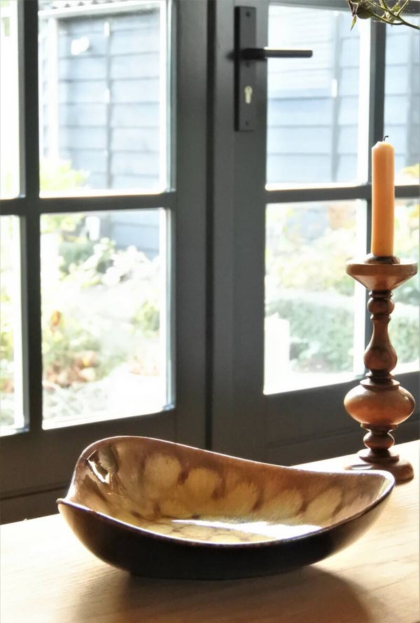Wat een beauty deze vintage sierschaal met golvend design van West Germany en met een bijzonder mooi gemaakt cirkelpatroon in aardetinten op een zacht geel-cremekleurige ondergrond. Mooi als decoratief design stuk in je huis of lekker gebruiken als fruitschaal of iets in serveren op je mooi gedekte tafel. Genoeg opties met deze beauty!