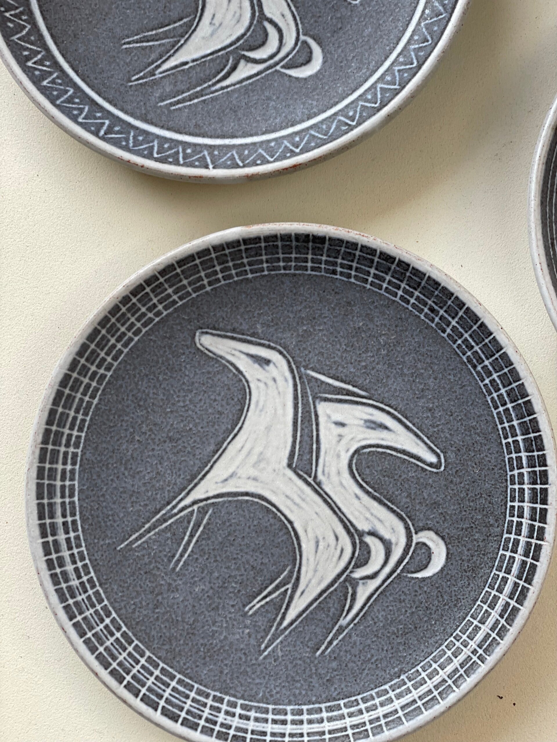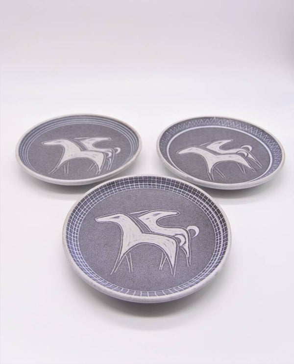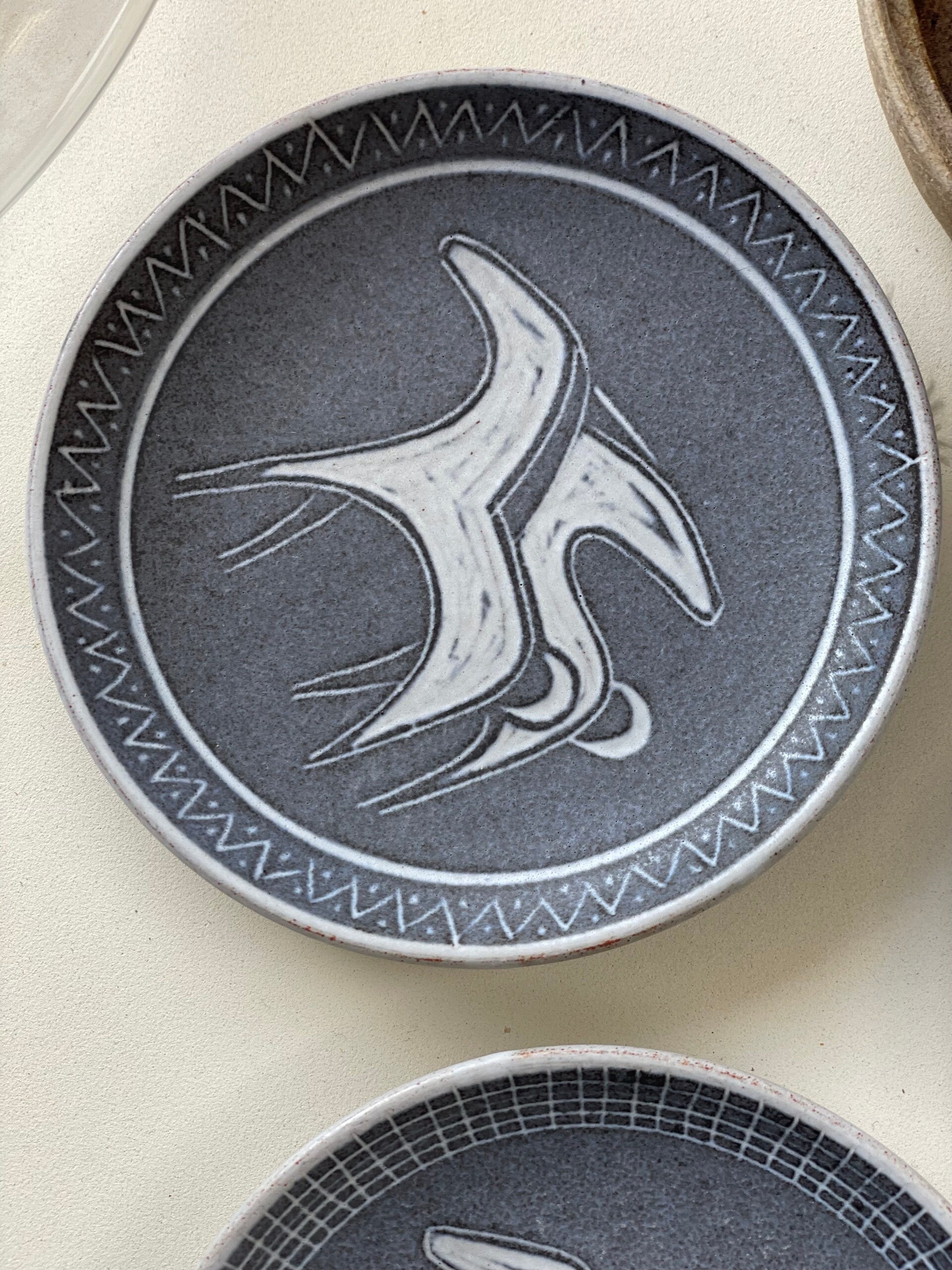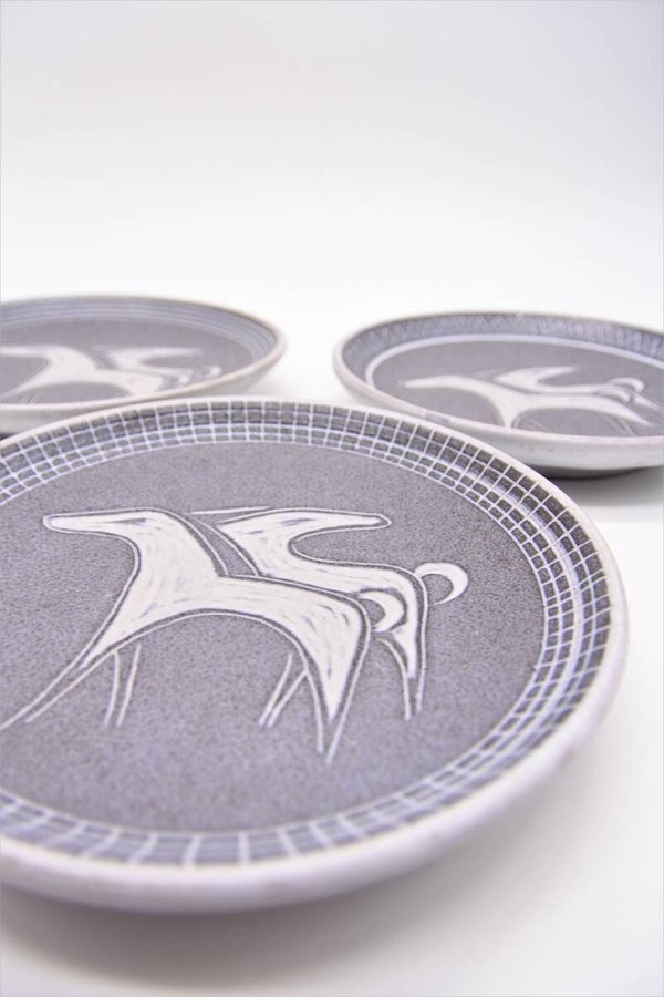 Leuke set mid century modern wandbordjes van keramiek in grijs met lichtgrijs design. Het design lijkt gelijk maar de rand is bij alle 3 de bordjes net even anders, leuk!