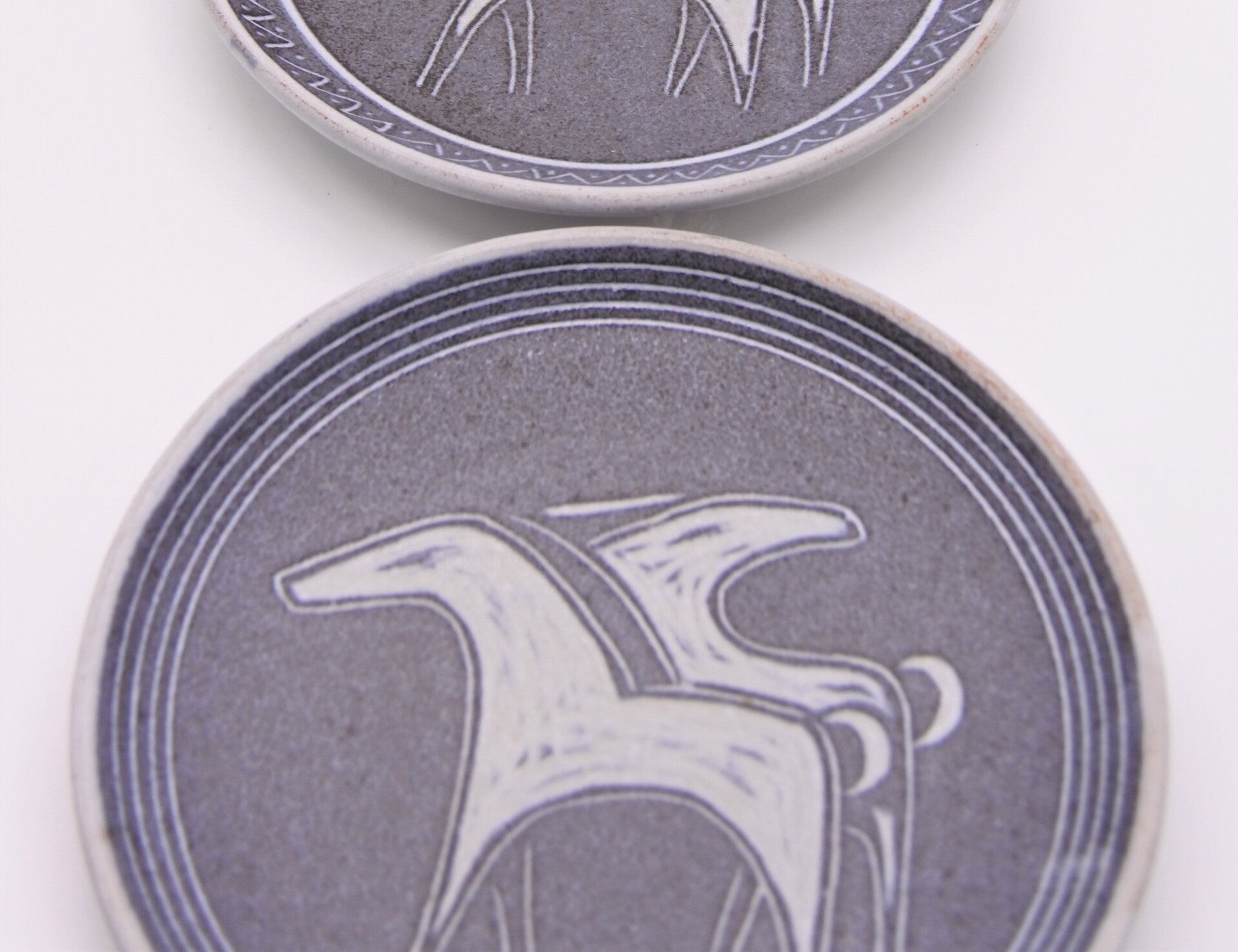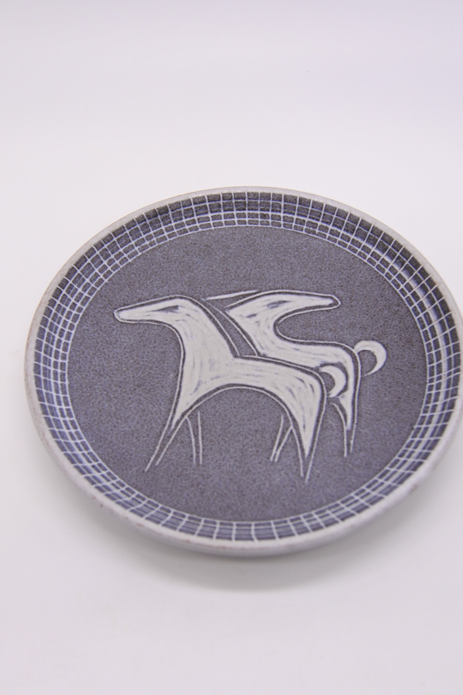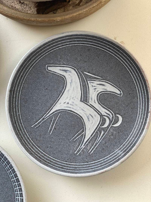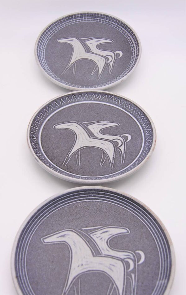 Leuke set mid century modern wandbordjes van keramiek in grijs met lichtgrijs design. Het design lijkt gelijk maar de rand is bij alle 3 de bordjes net even anders, leuk!