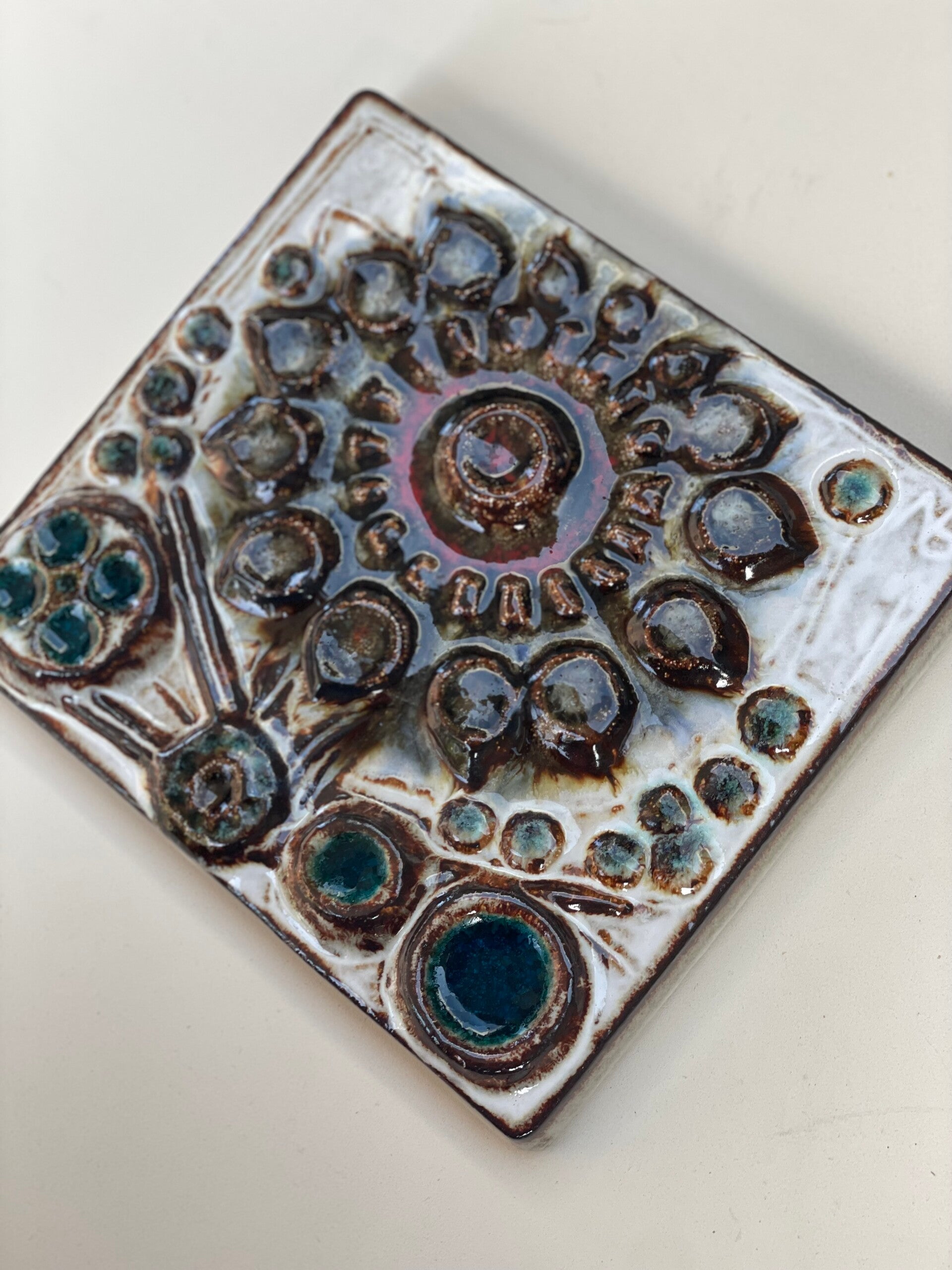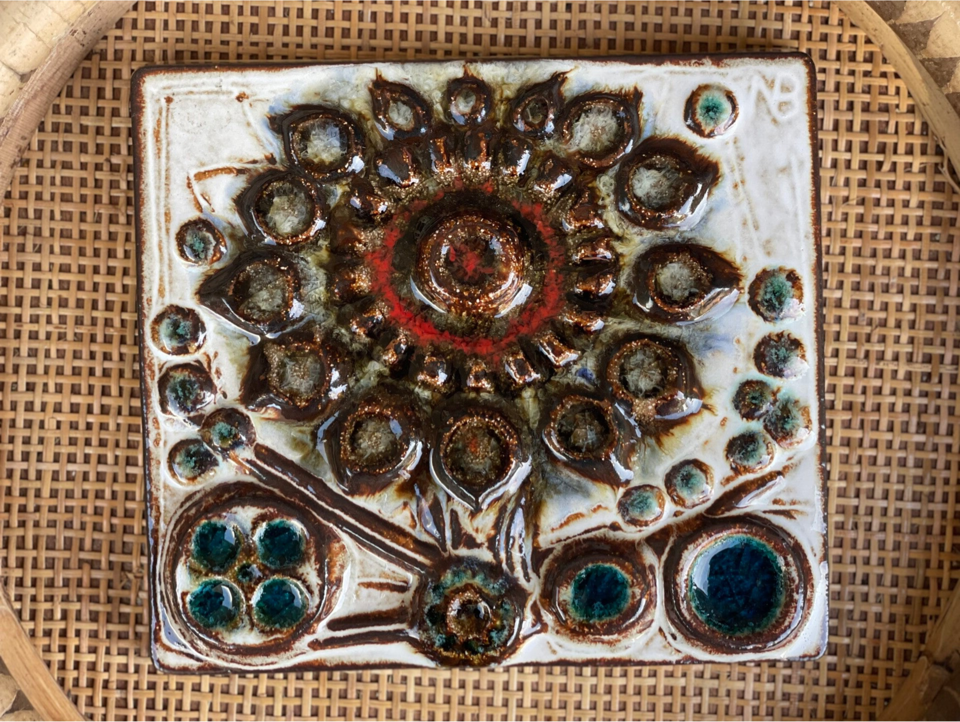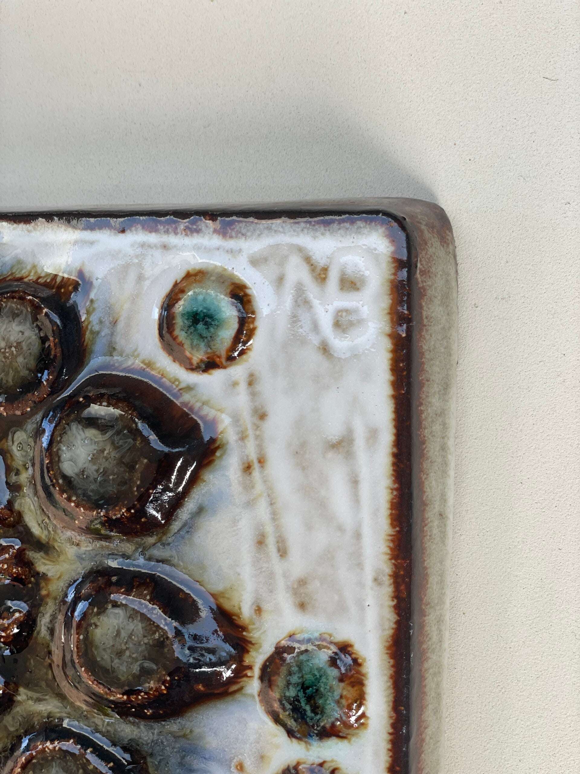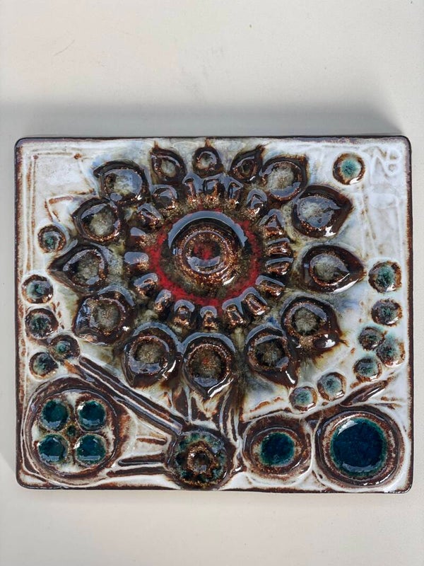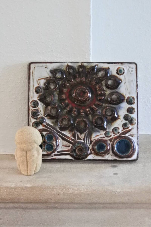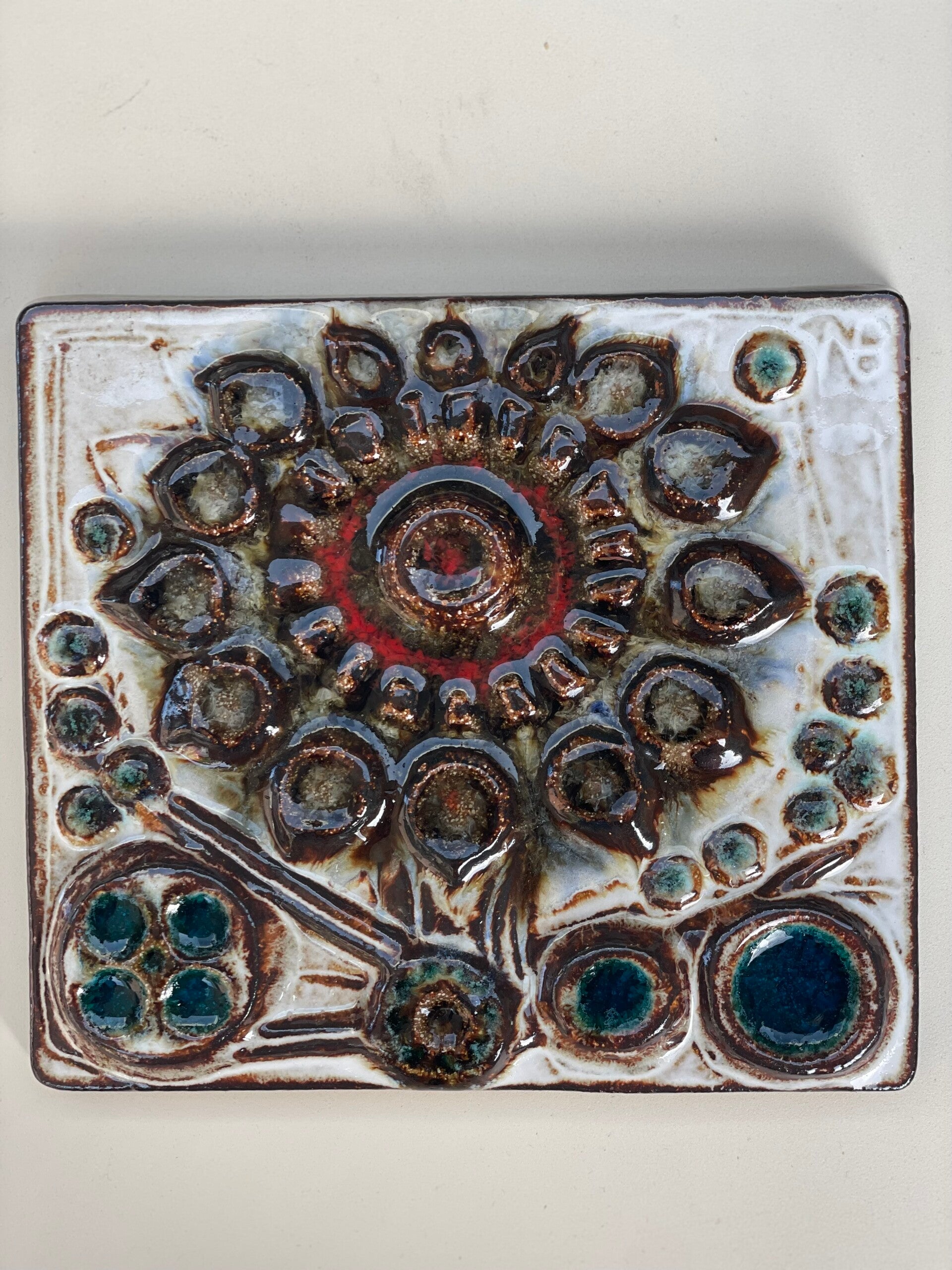 Fantastische reliëf plaquette gemaakt in geglazuurd steengoed door de Deense kunstenaar Noomi Backhausen voor Søholm in de jaren 60, genummerd.