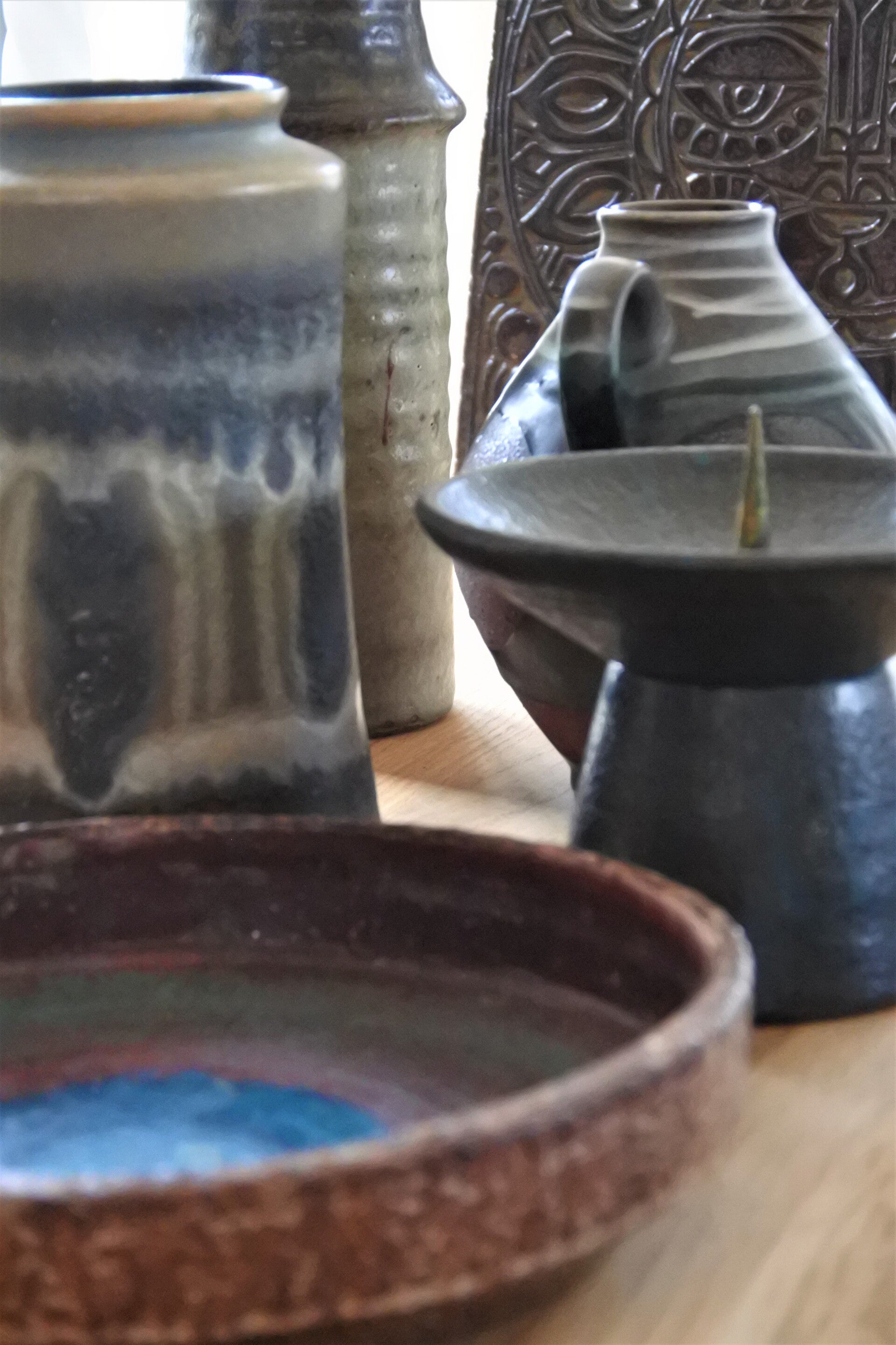 Deze prachtige schaal is een vintage exemplaar van Zaalberg Holland. Dit fraaie exemplaar uit de 60's heeft een stoere en robuuste buitenzijde en een prachtige meerkleurige binnenzijde in grijs, blauw en bordeaux rood.