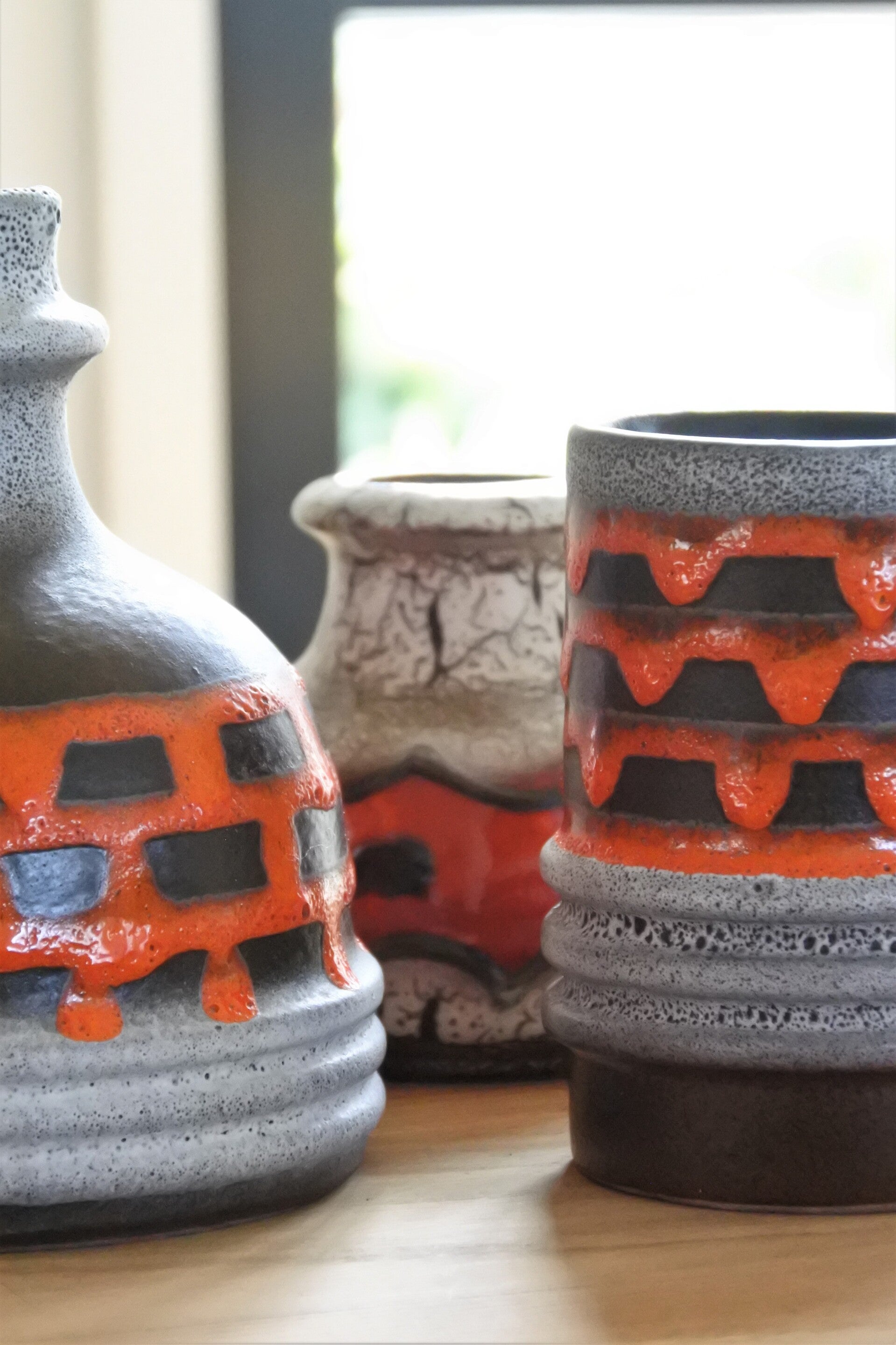Vintage Carstens Tönnieshof set van 2 bijzondere vazen in grijs met verschillende kleuren grijs nuance en een oranje - rode fat lava band rondom.