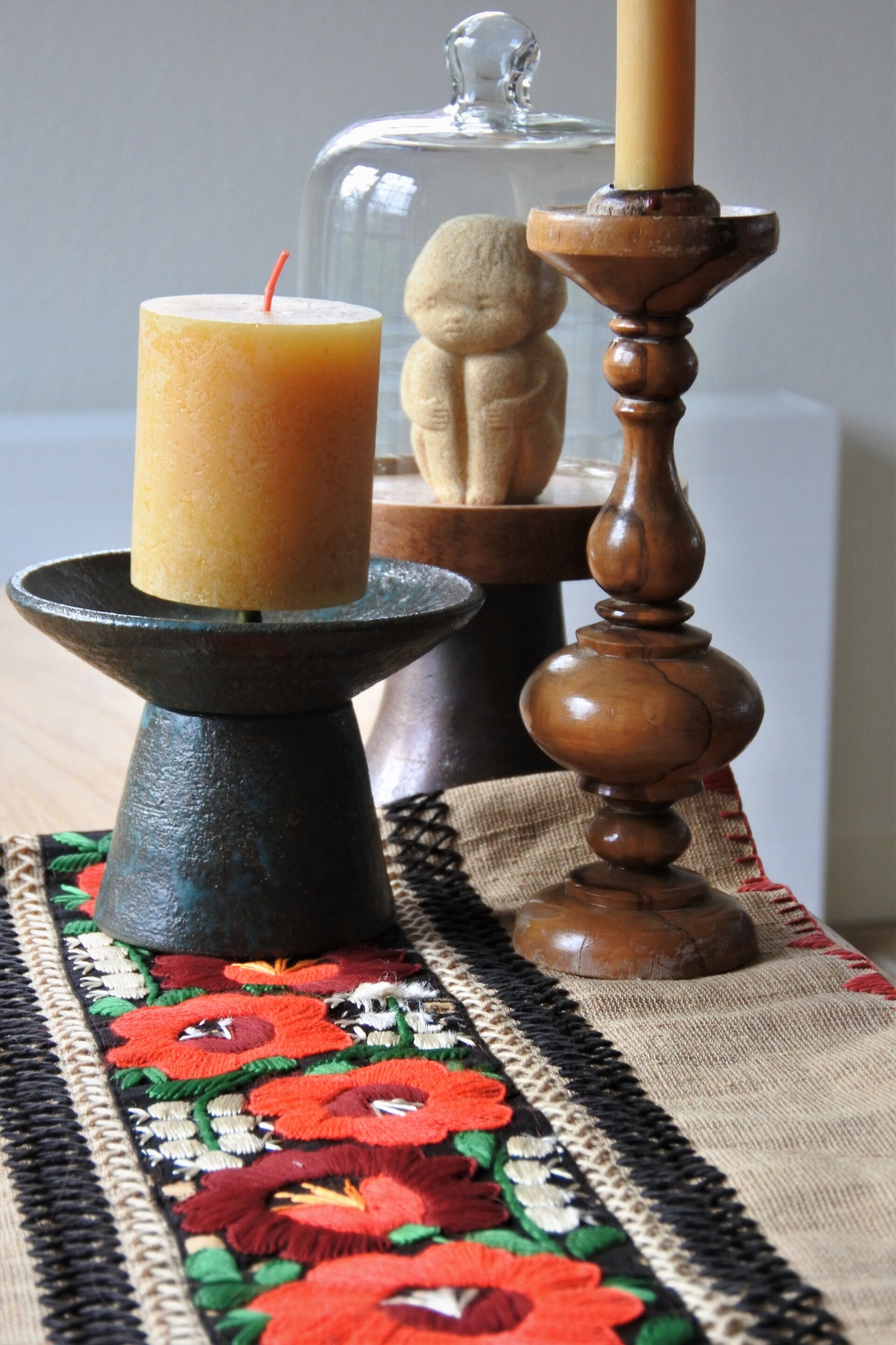 Leuke vintage tafelloper van jute met prachtig gedetailleerde geborduurde bloemen in herhalend patroon in heldere kleuren.