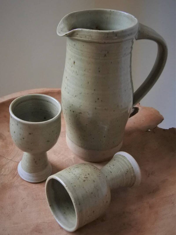 Vintage aardewerk schenkkan en wijnglazen in prachtig groen glazuur