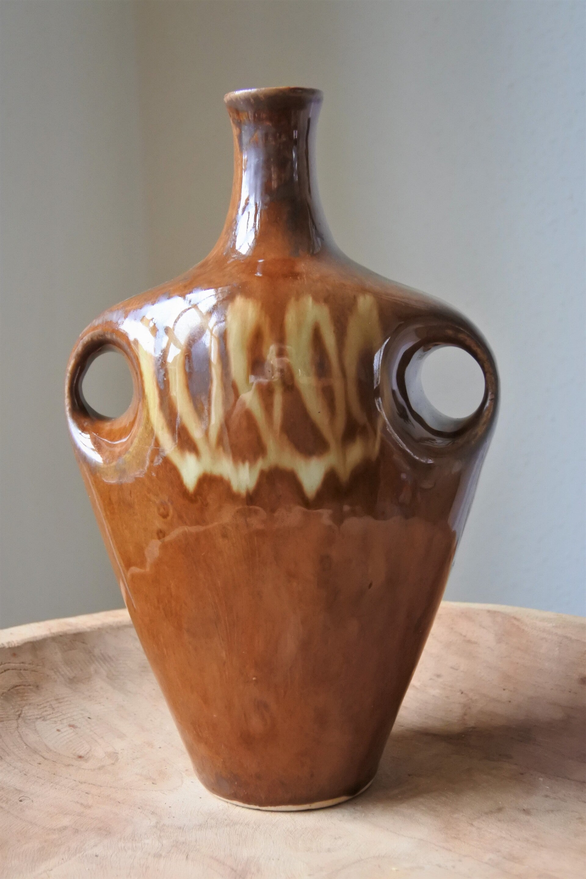 Vintage vaas in een mooie warme karamelkleur met sierlijke krullen in gele tint,2 oortjes en een a-symetrisch halsje.