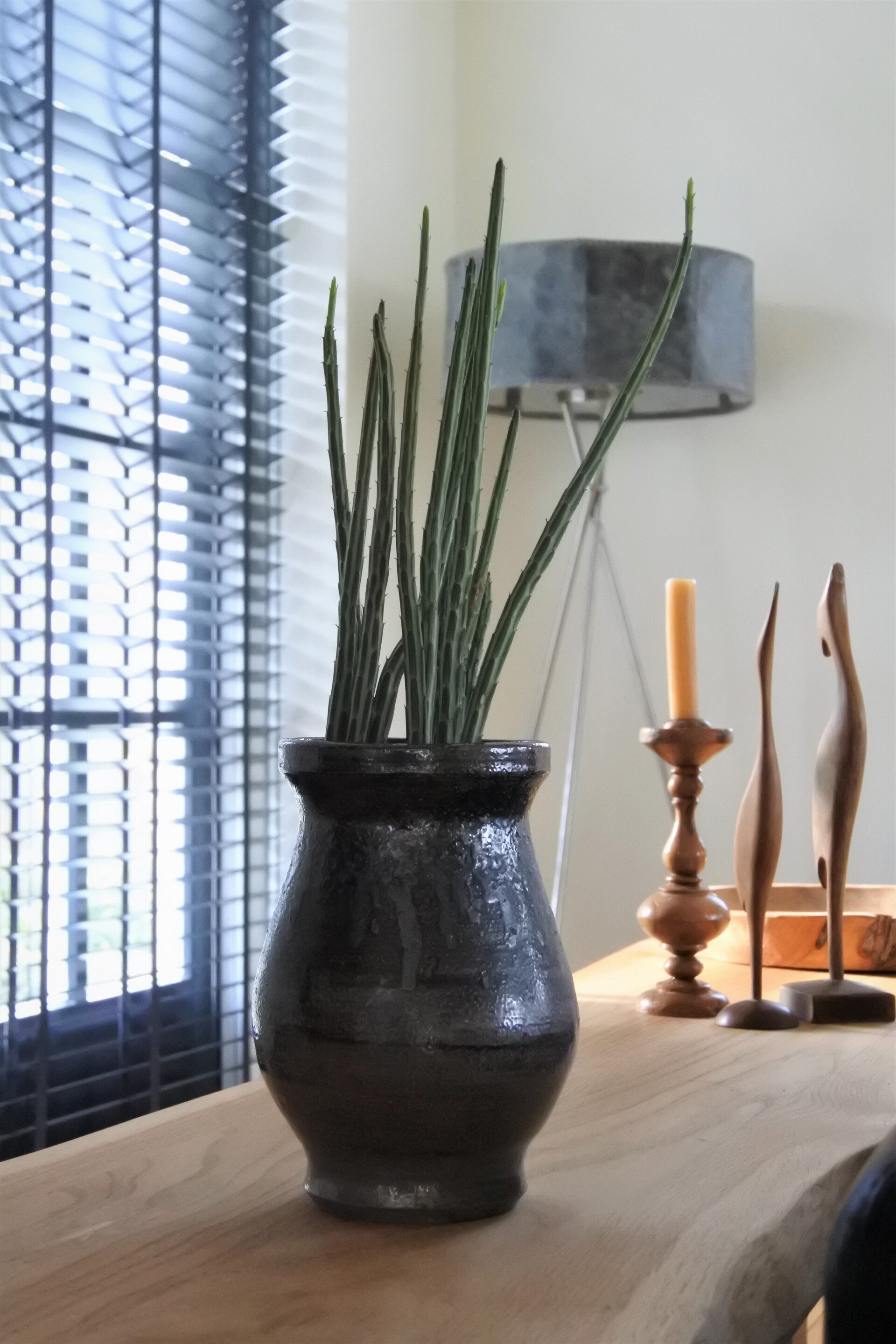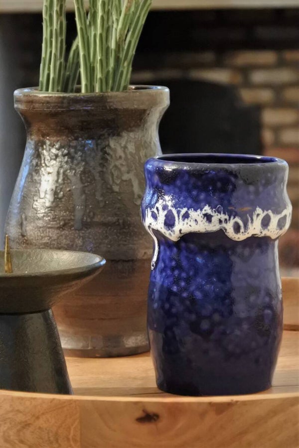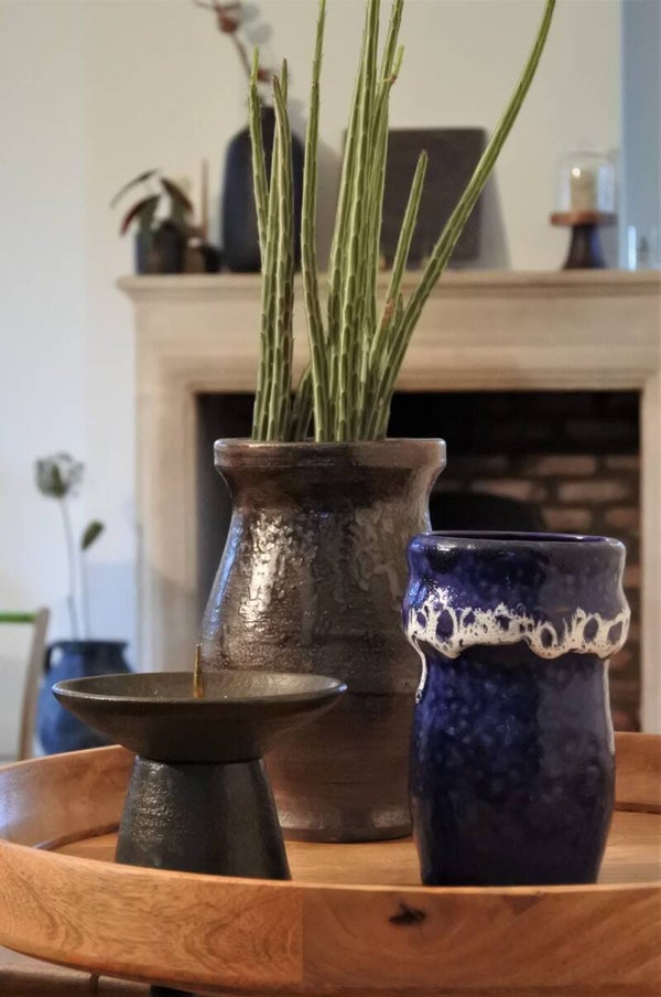 Vintage vaas uit het franse Thann in een donkere kleur met diverse kleur nuances en een stoere grovere structuur. Wij hebben er eens een leuke cactuspot ingezet in plaats van een bloemetje, ook gaaf! maar deze stoere jongen staat ook juist weer erg mooi met een modern boeket in lichtere kleuren. Dit is eigenlijk zo'n tijdloos modelletje dat nooit verveelt en makkelijk door combineert!