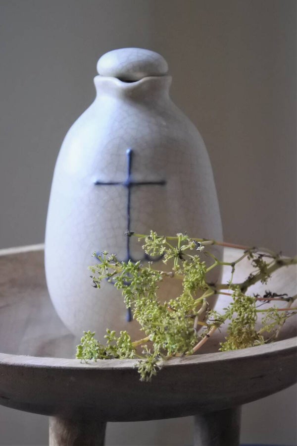 Vintage gecraqueleerd kruikvaasje met dekseltje in cremewit en een blauwe opdruk.