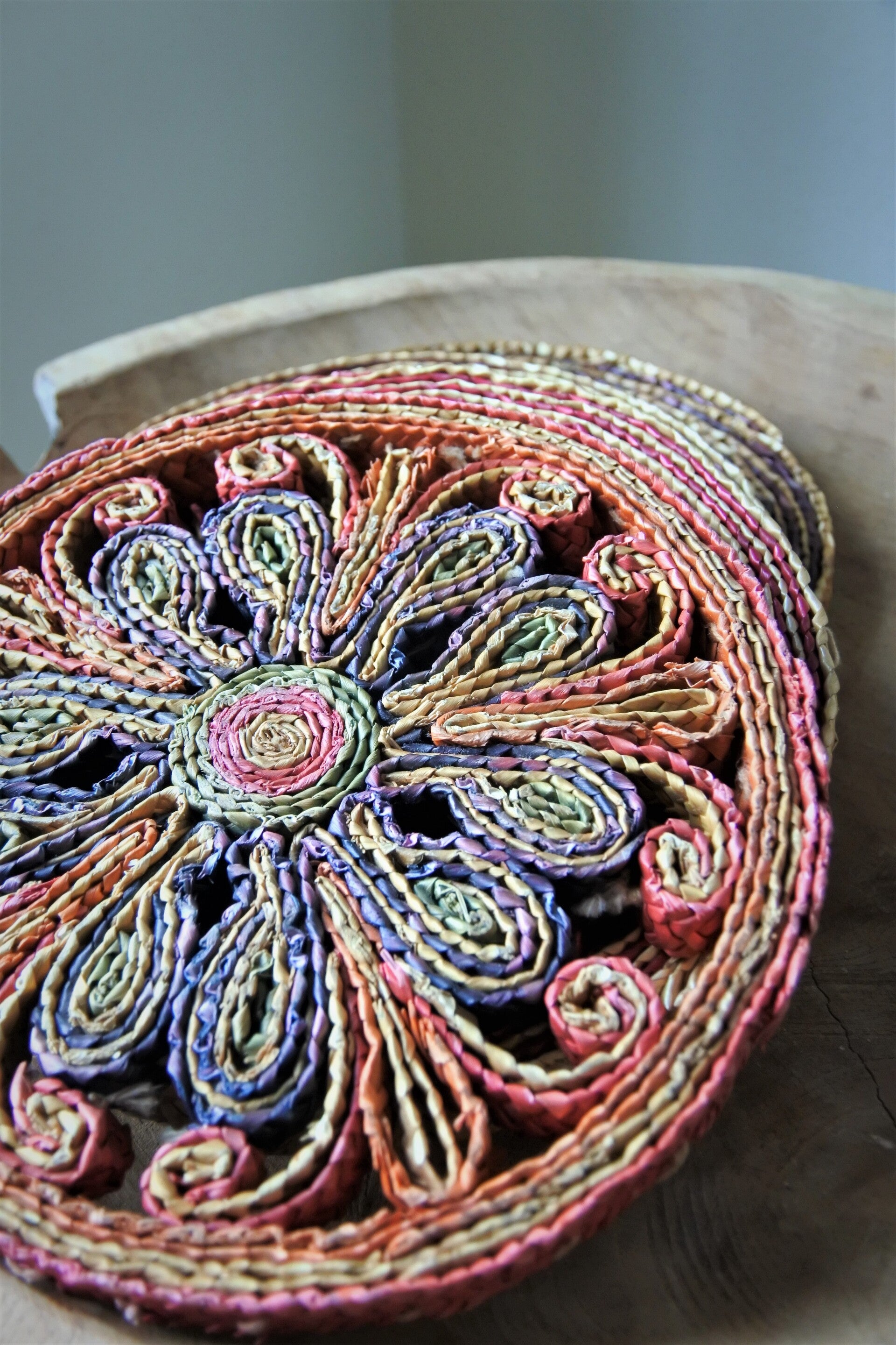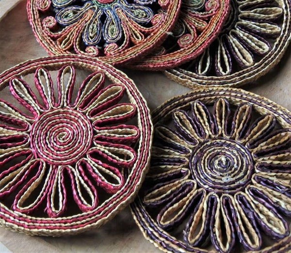 Vintage pannenonderzetters van Raffia (een rietachtig materiaal dat wordt gemaakt van de Raphiapalm uit Afrika) in 3 verschillende kleurstellingen met een leuk bloemenpatroon.