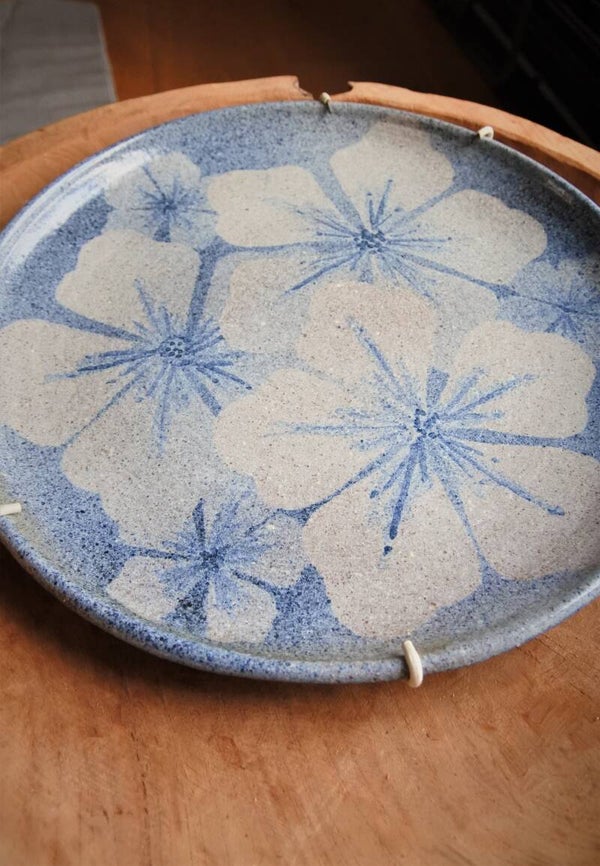 Vintage wandbord in lichtblauw met lichte opdruk van lelies. Mooi als solo item aan je muur maar nog veel leuker in een collage van borden of.. wat jij maar wilt!
