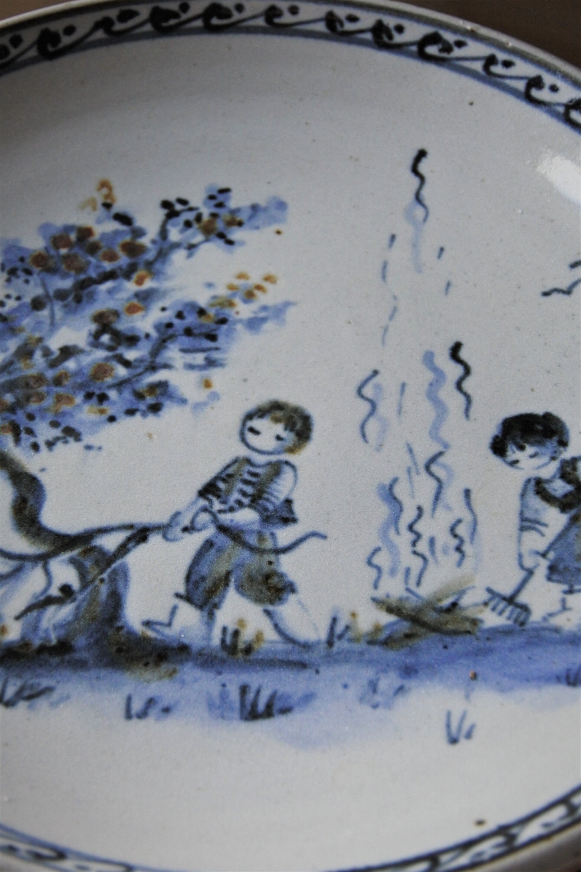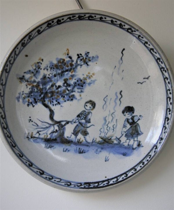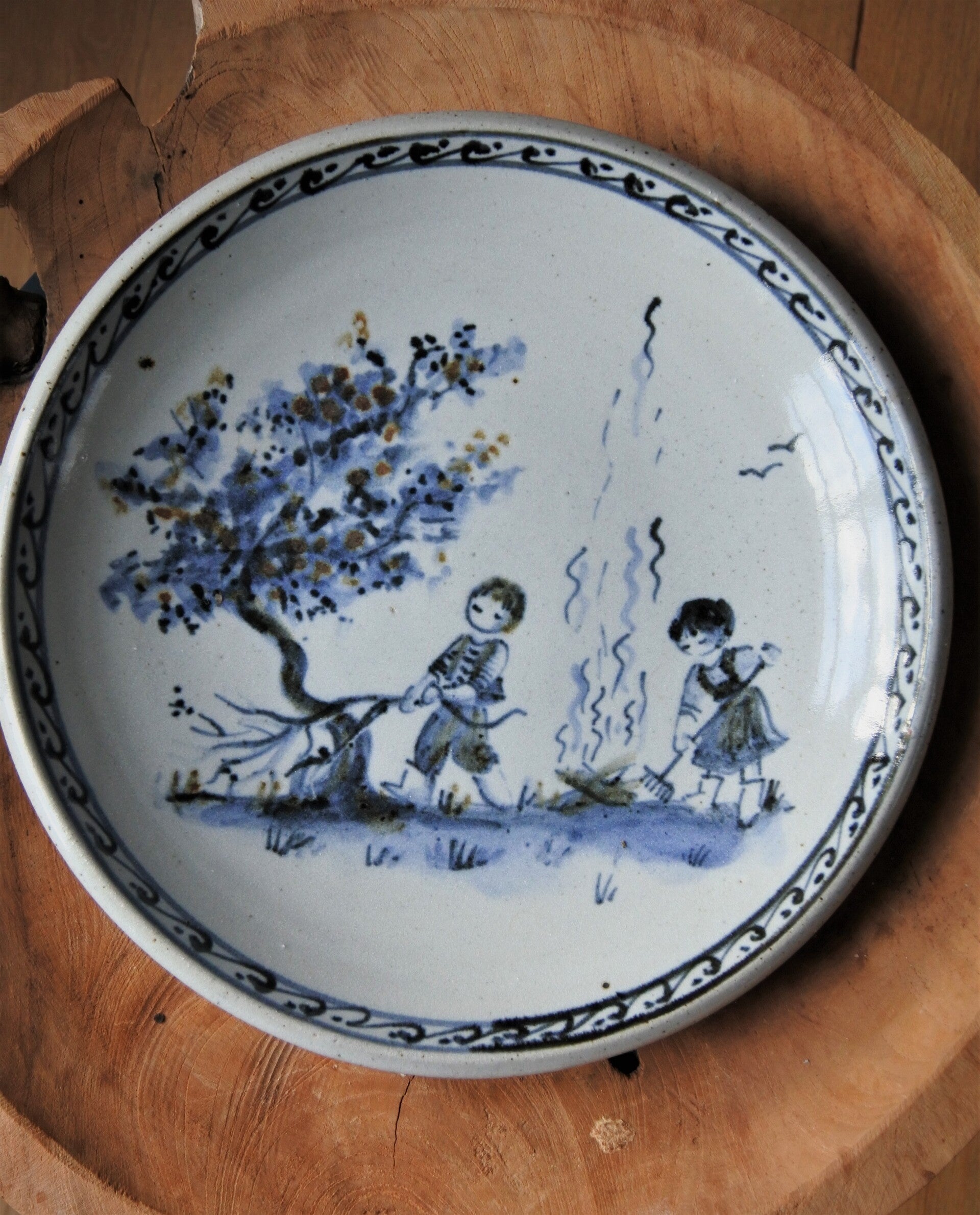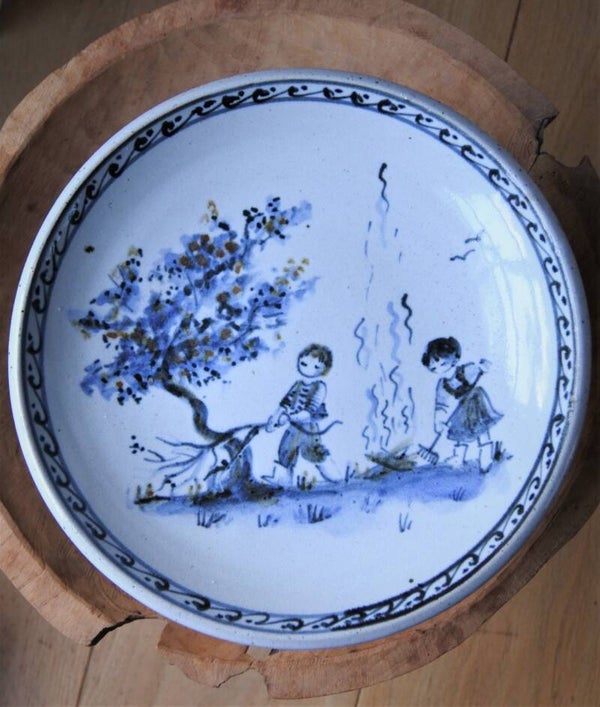 Vintage wandbord met scandinavische look. Het bord heeft een witte kleur met kleine spikkeltjes, een blauwe omlijsting en een lieve afbeelding van een man en vrouw.