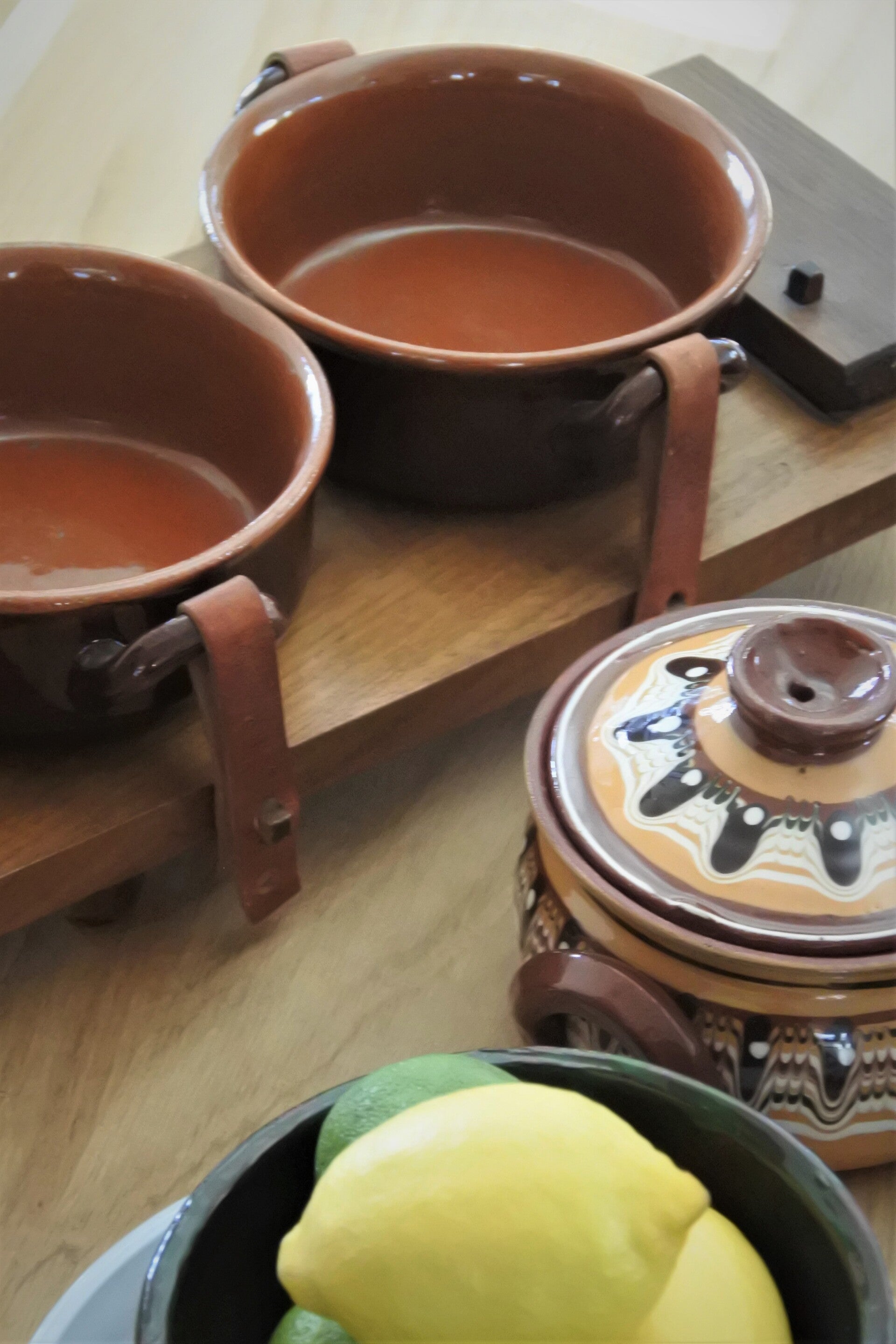 Fulgenzi Italy houten tray met 2 aardewerk Vulcania kommen