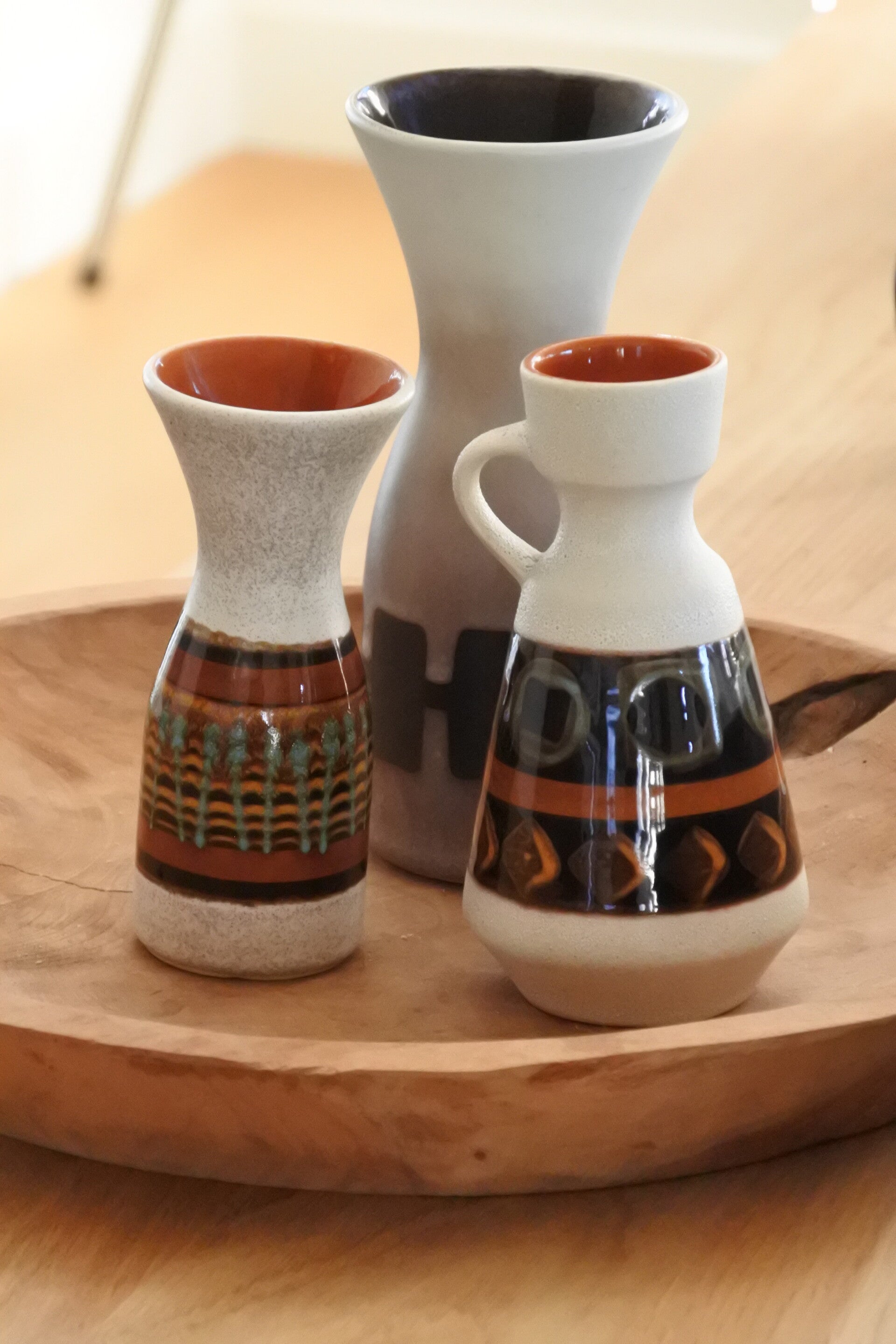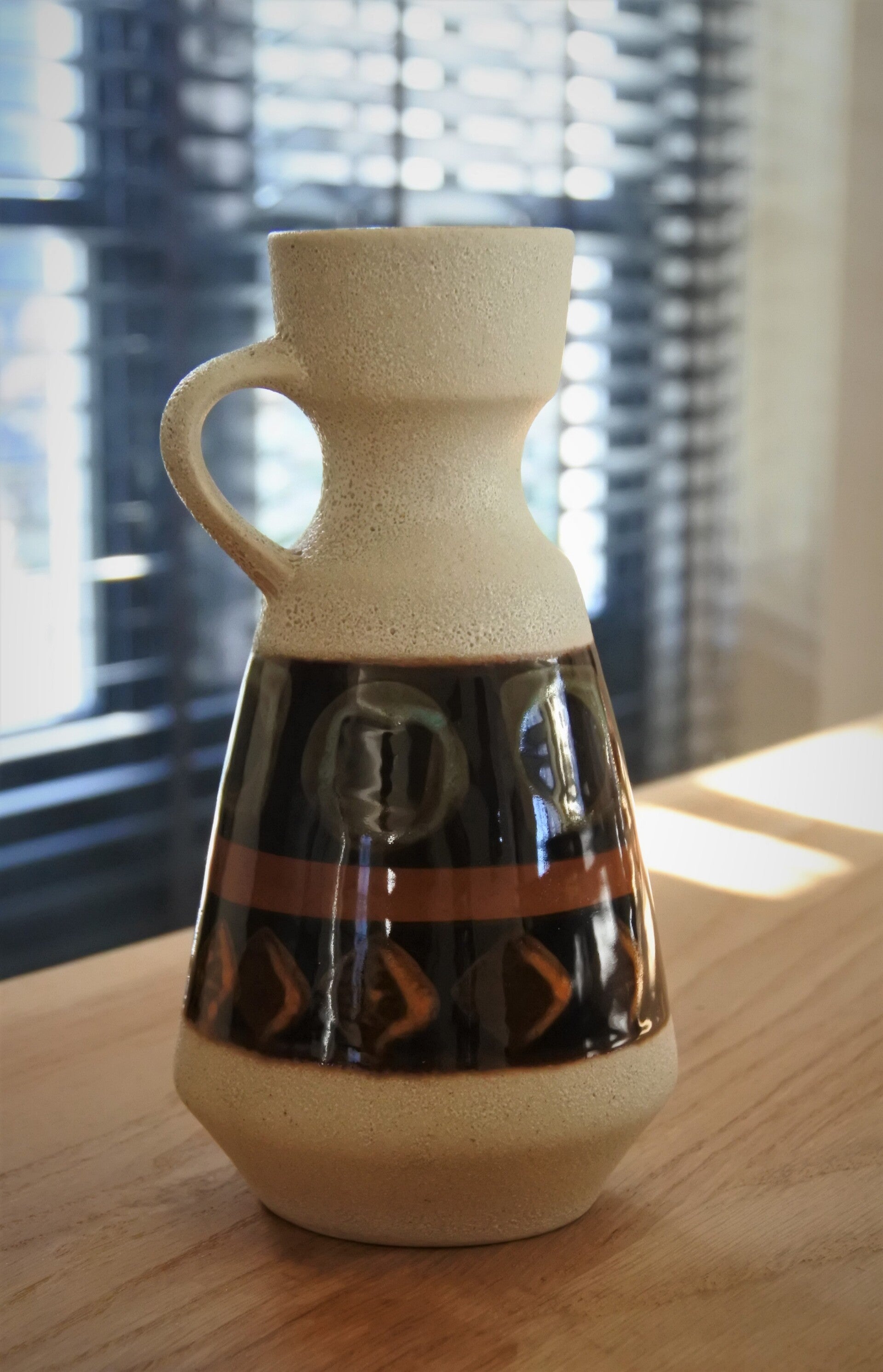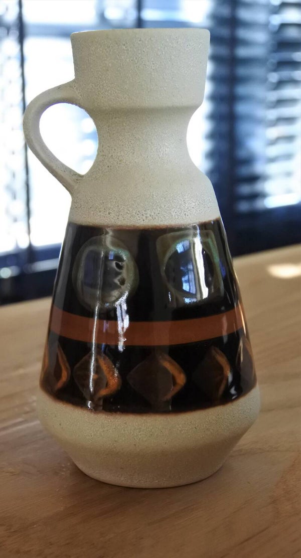 Vintage Dümler & Breiden vaas uit de 70's in wit met kunstig patroon opdruk rondom in bruin, blauw & groen.