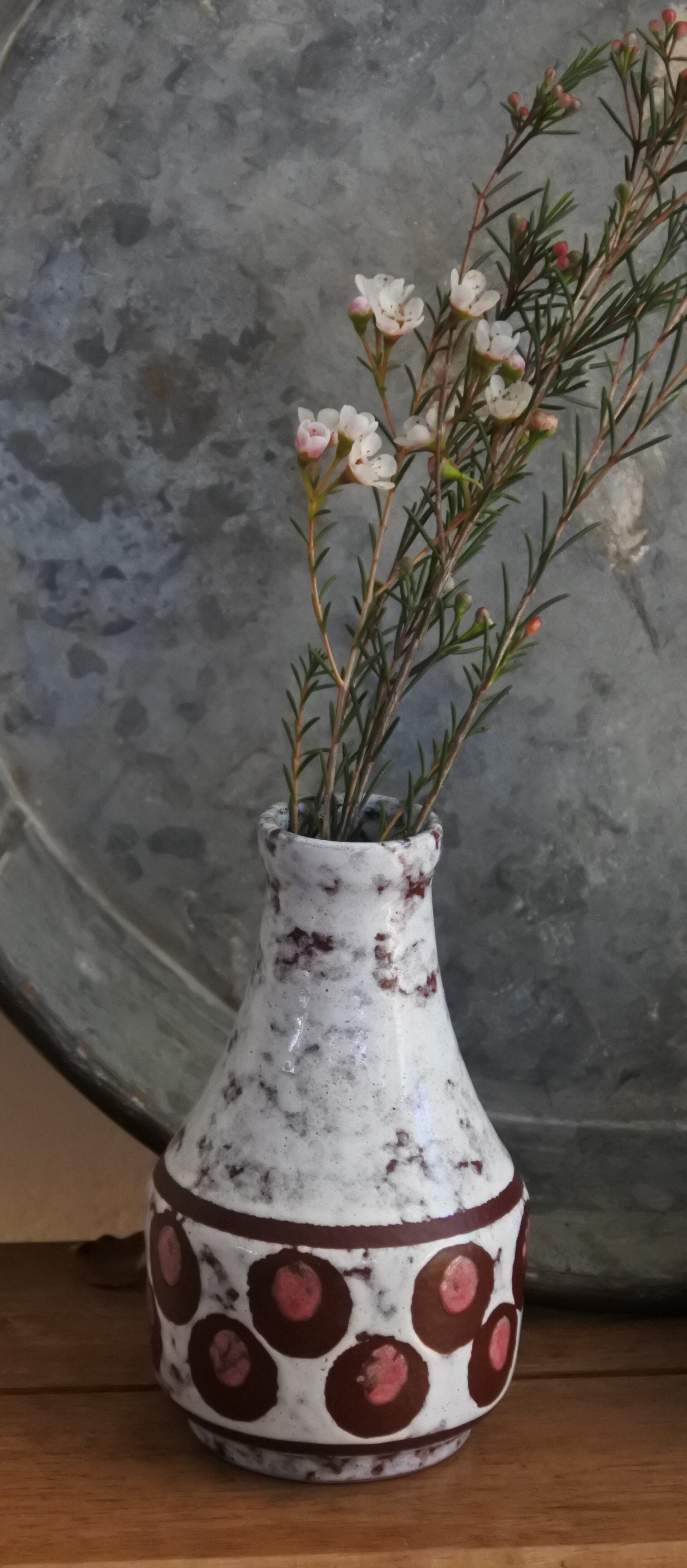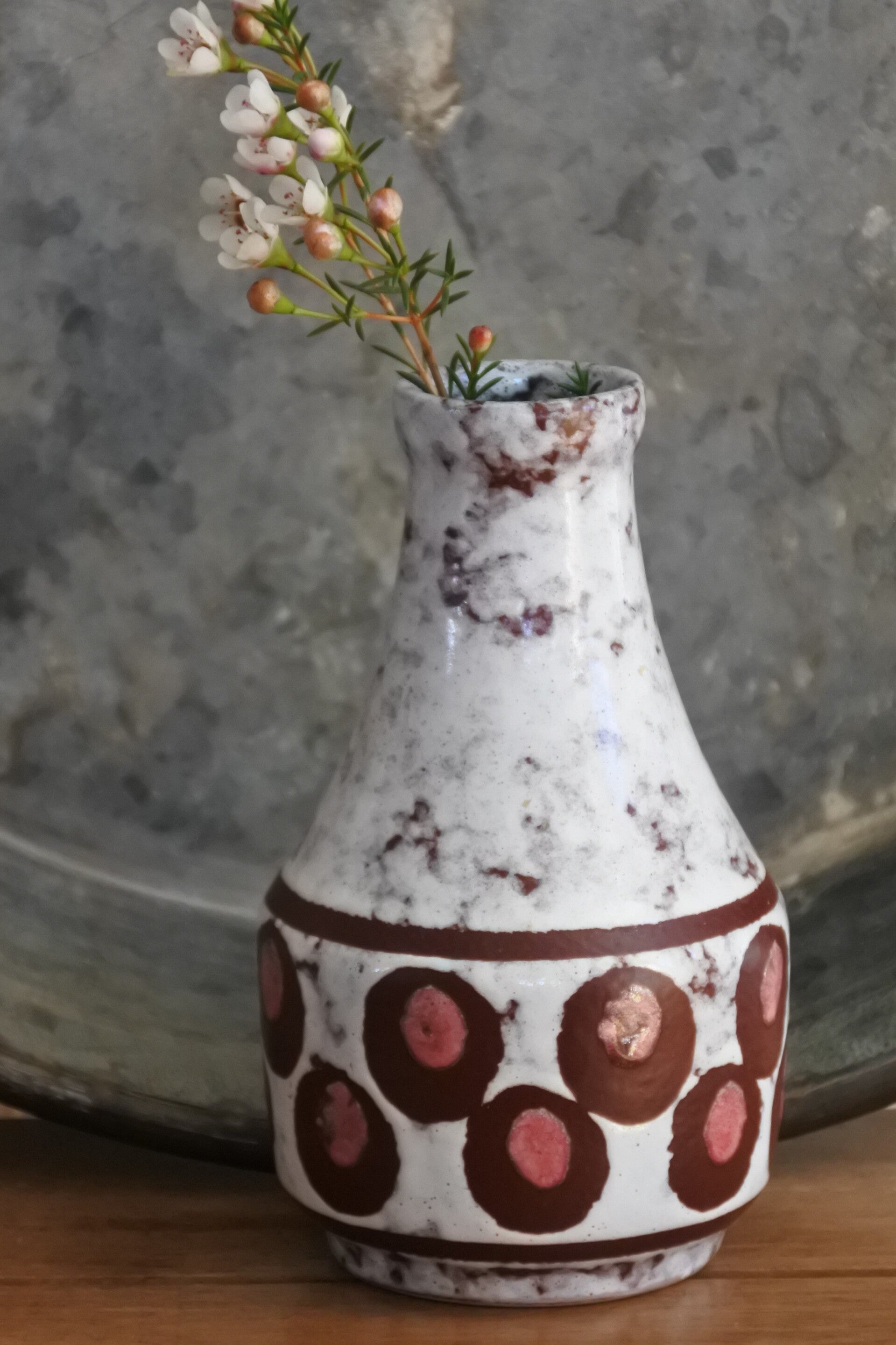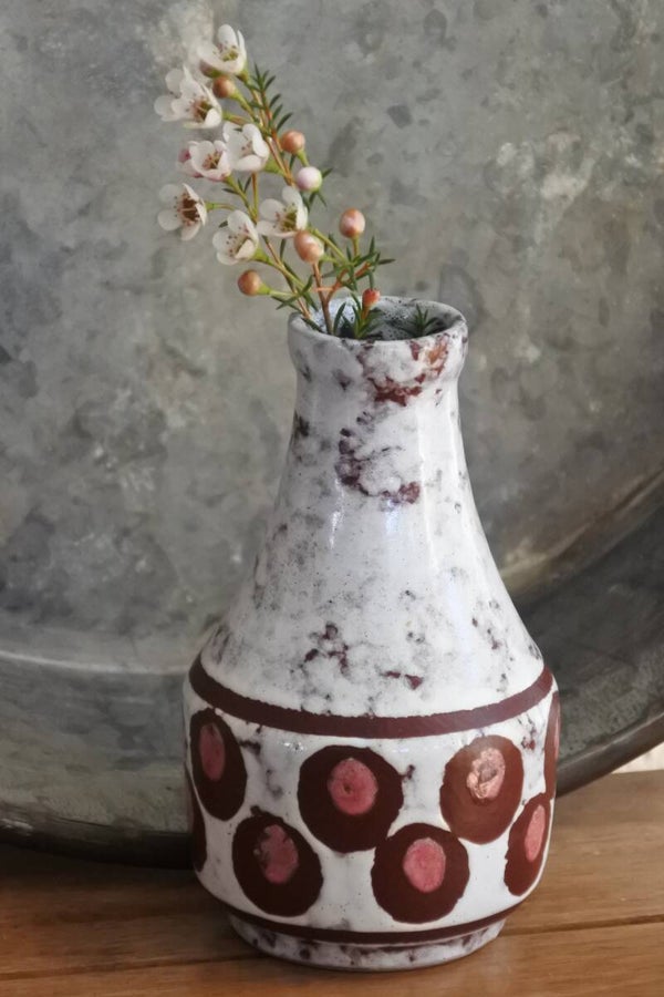 Vintage Strehla mid century 60's vaasje uit Oost Duitland in wit glazuur met aubergine en oudroze kleurig decor van circels en stippen.