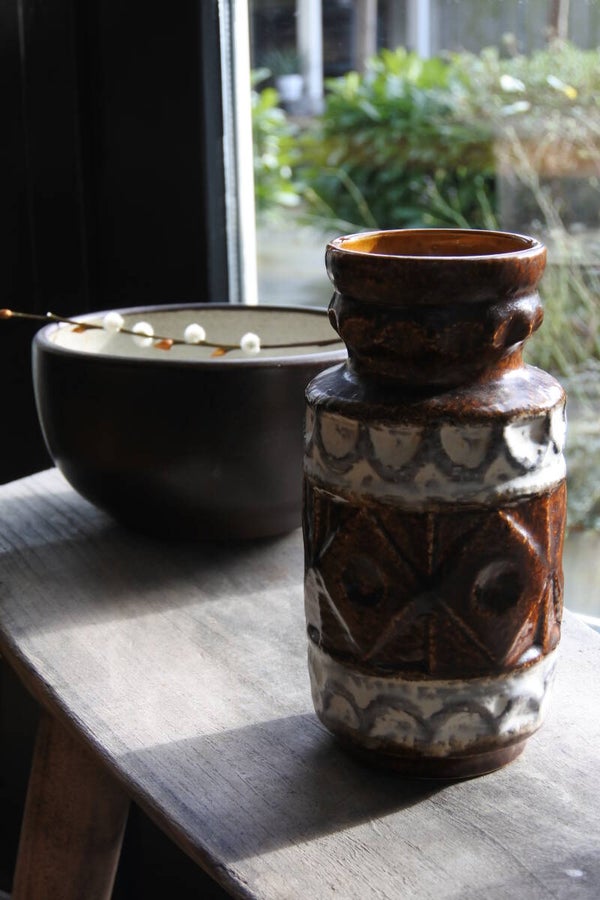 Deze West Germany vaas is van Bay, is 20 cm hoog en heeft een mooie warme koffiekleur met lichtere accenten in wit en lichtgrijs. De vaas heeft een mooi motiefpatroon rondom.
