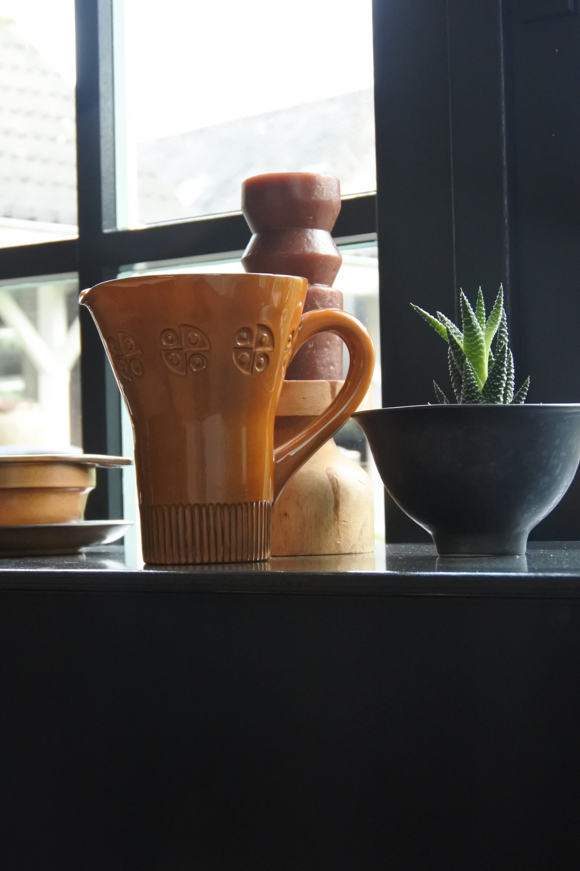 Vintage karaf uit (naar verluid) Denemarken. De kan heeft een mooie glans, een prachtige caramelkleur en logo opdruk rondom.