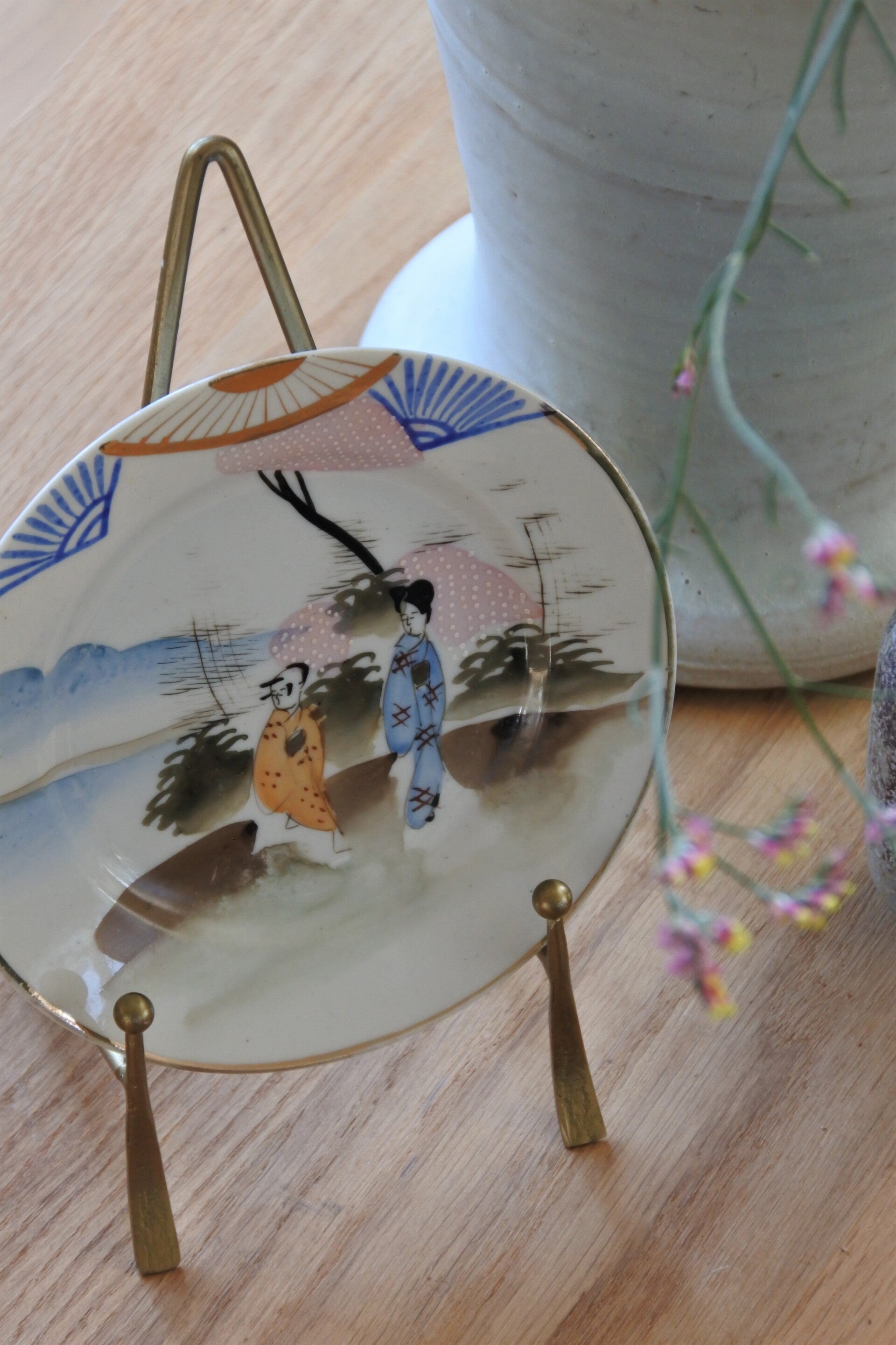 Een prachtig bordje met goudkleurige rand en kleurijke tekening van een oosters tafereel. De kleur goud lijkt er wel op te zijn gelegd wat het bordje met recht een echt sierbordje maakt. Te mooi om te gebruiken als je het ons vraagt!