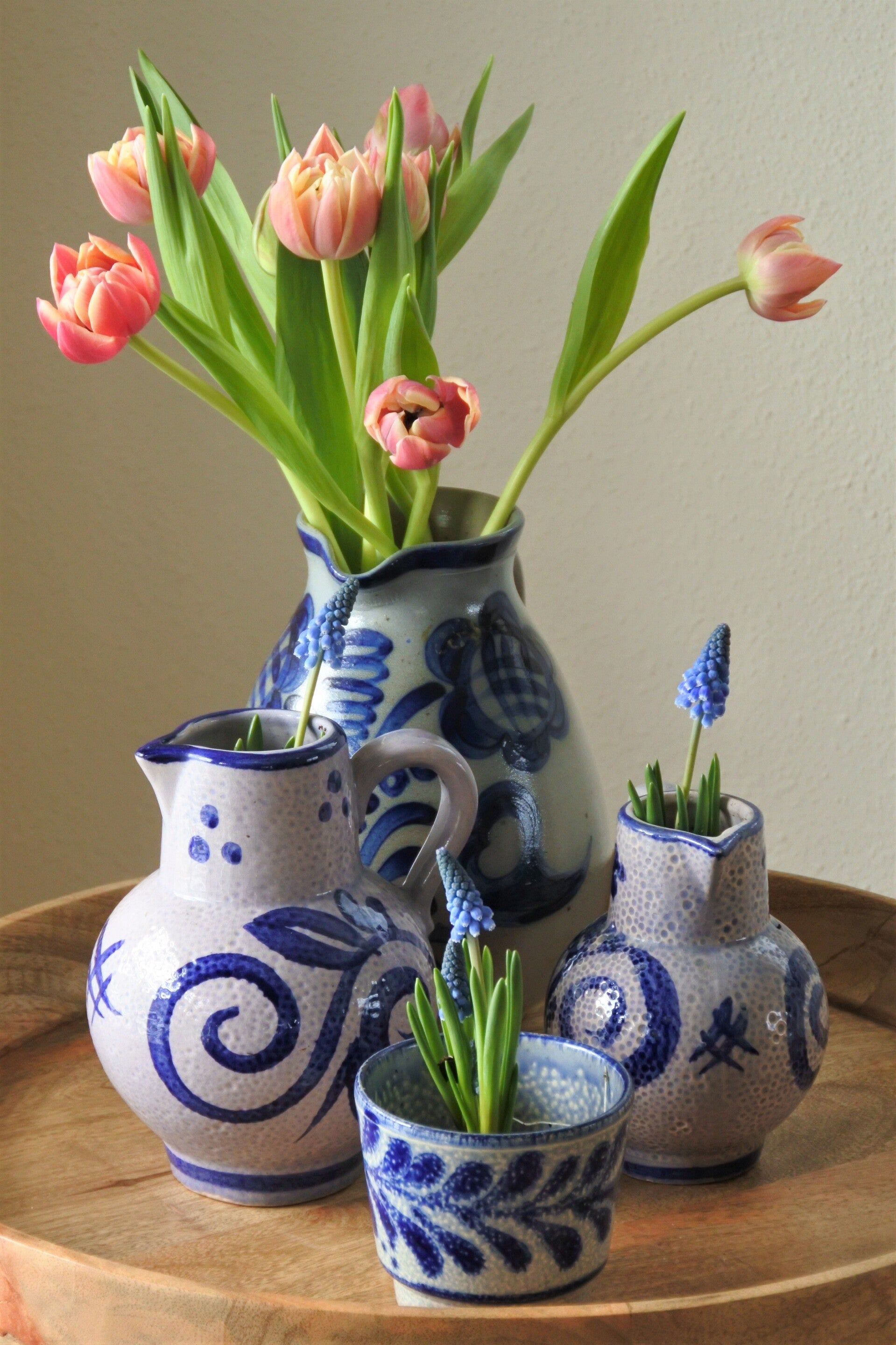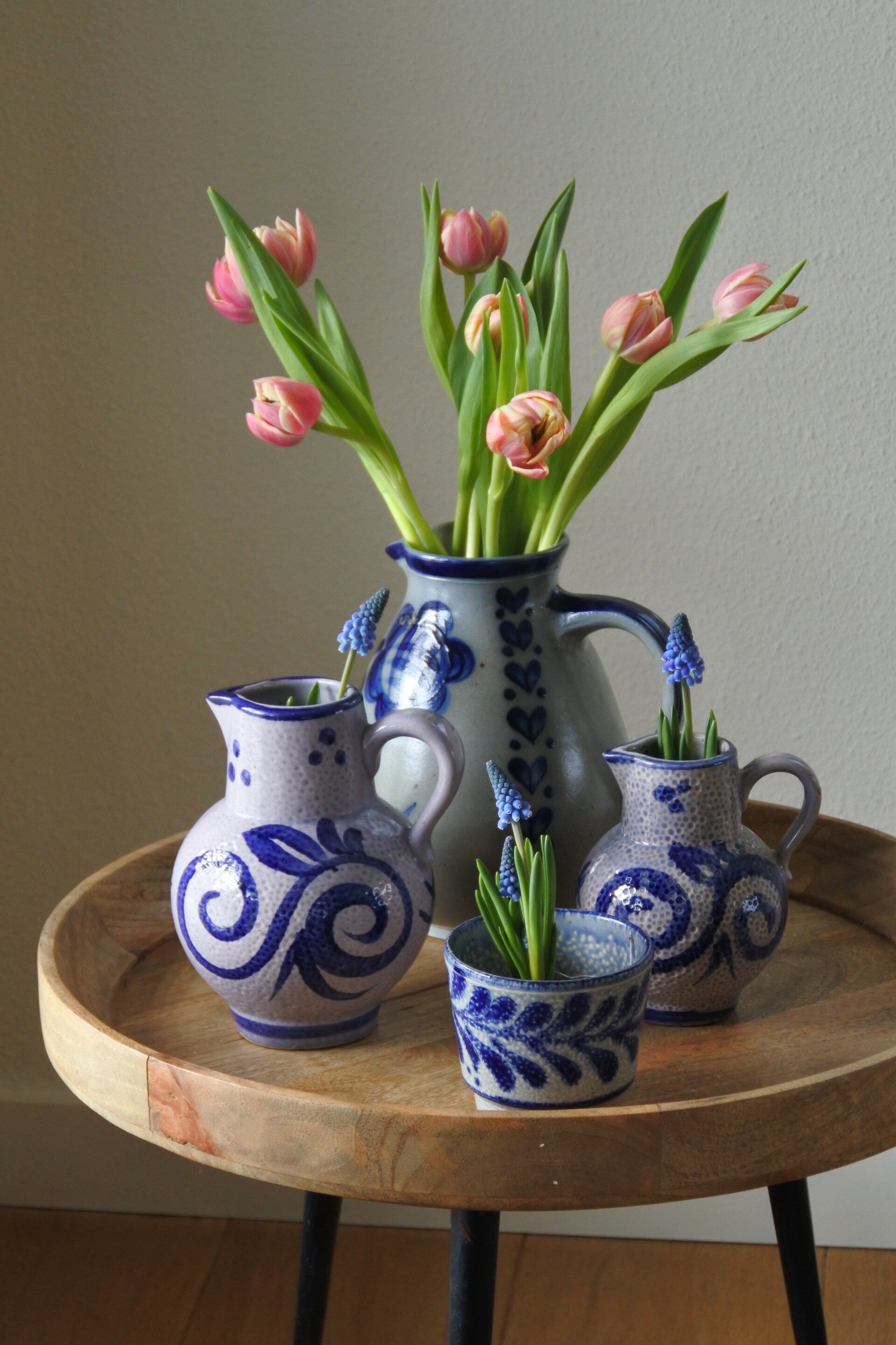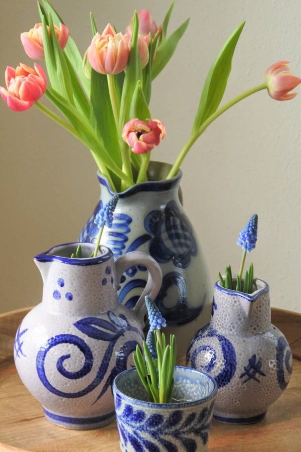 Prachtige klassieke kruikvaas in grijs met diepblauwe tekening rondom.