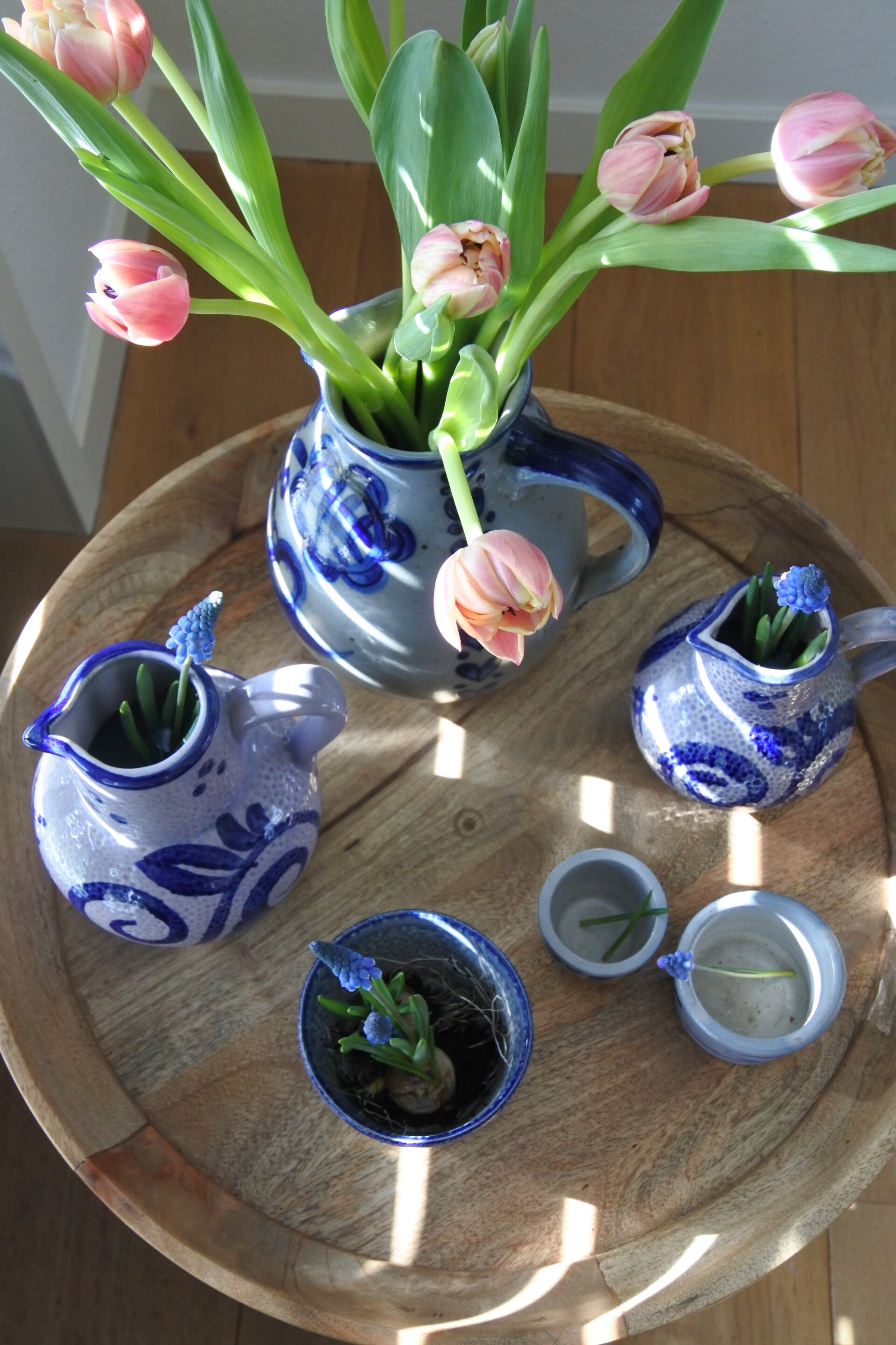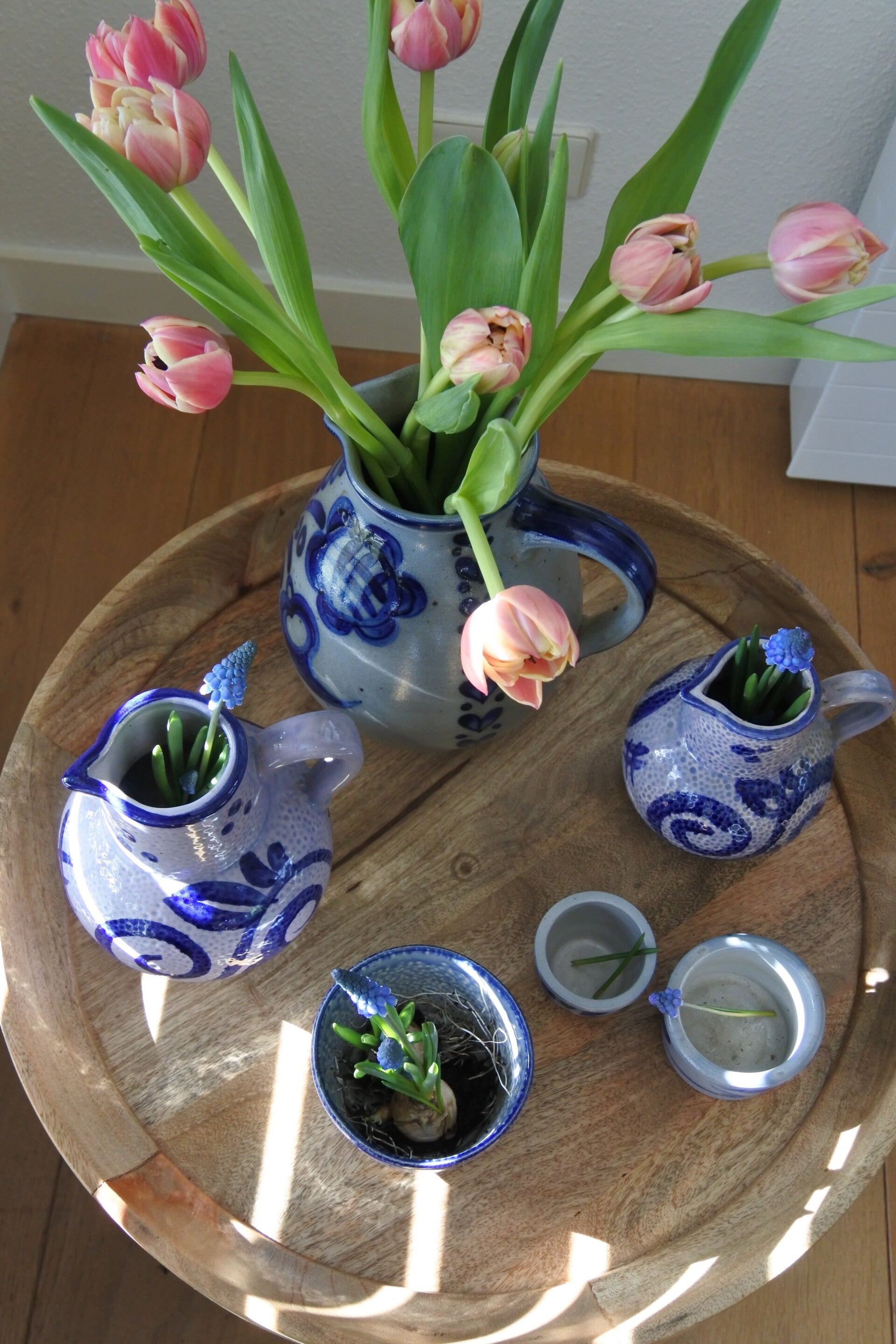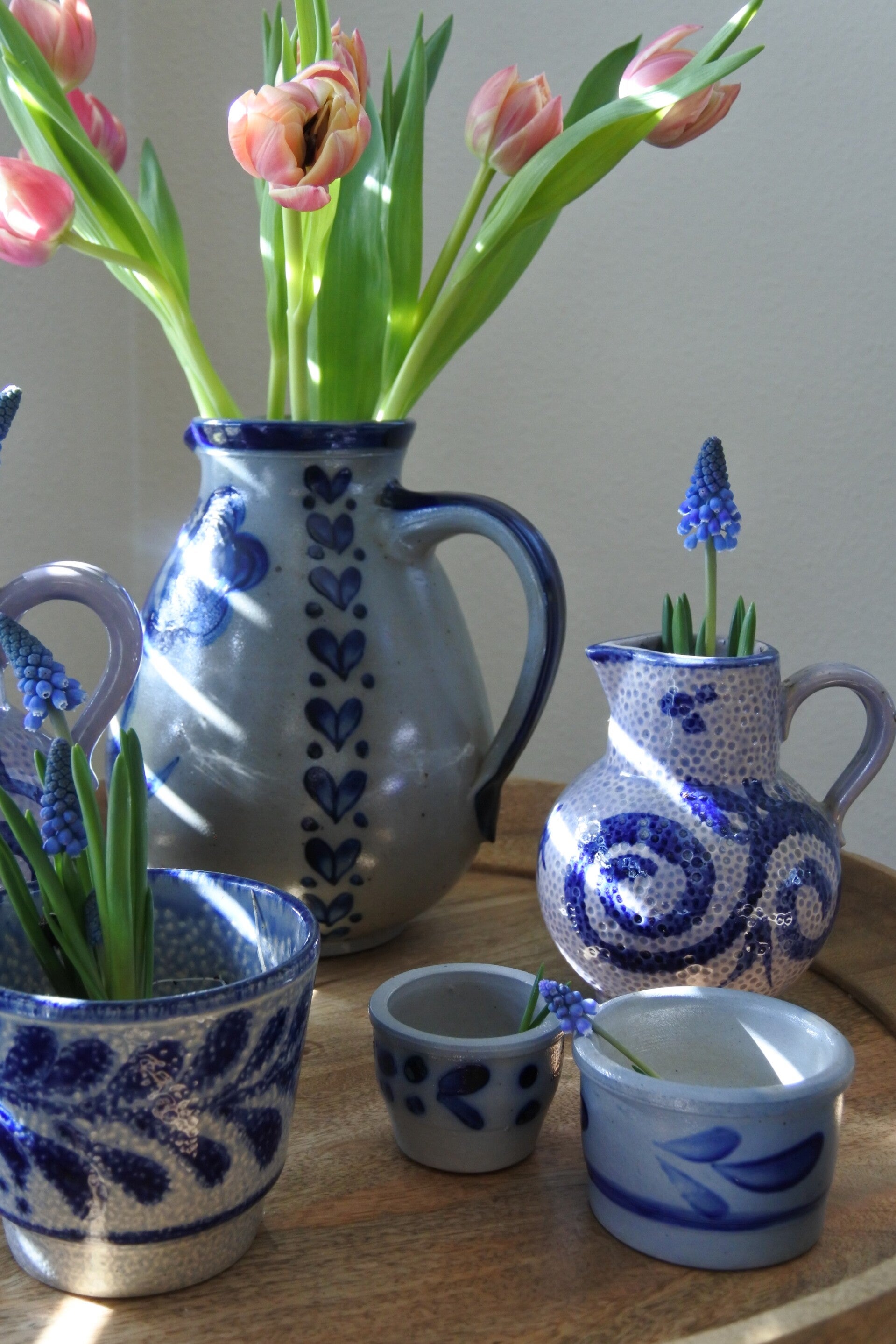 Prachtige klassieke kruikvaas in grijs met diepblauwe tekening rondom.