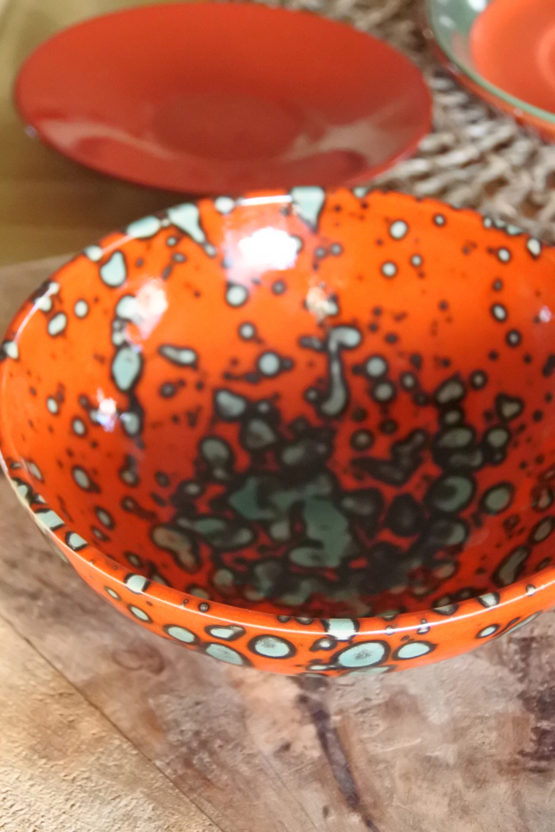 Mooi vintage schaaltje in een frisse oranje-rode kleur met appeltjes groene spikkels all over.
