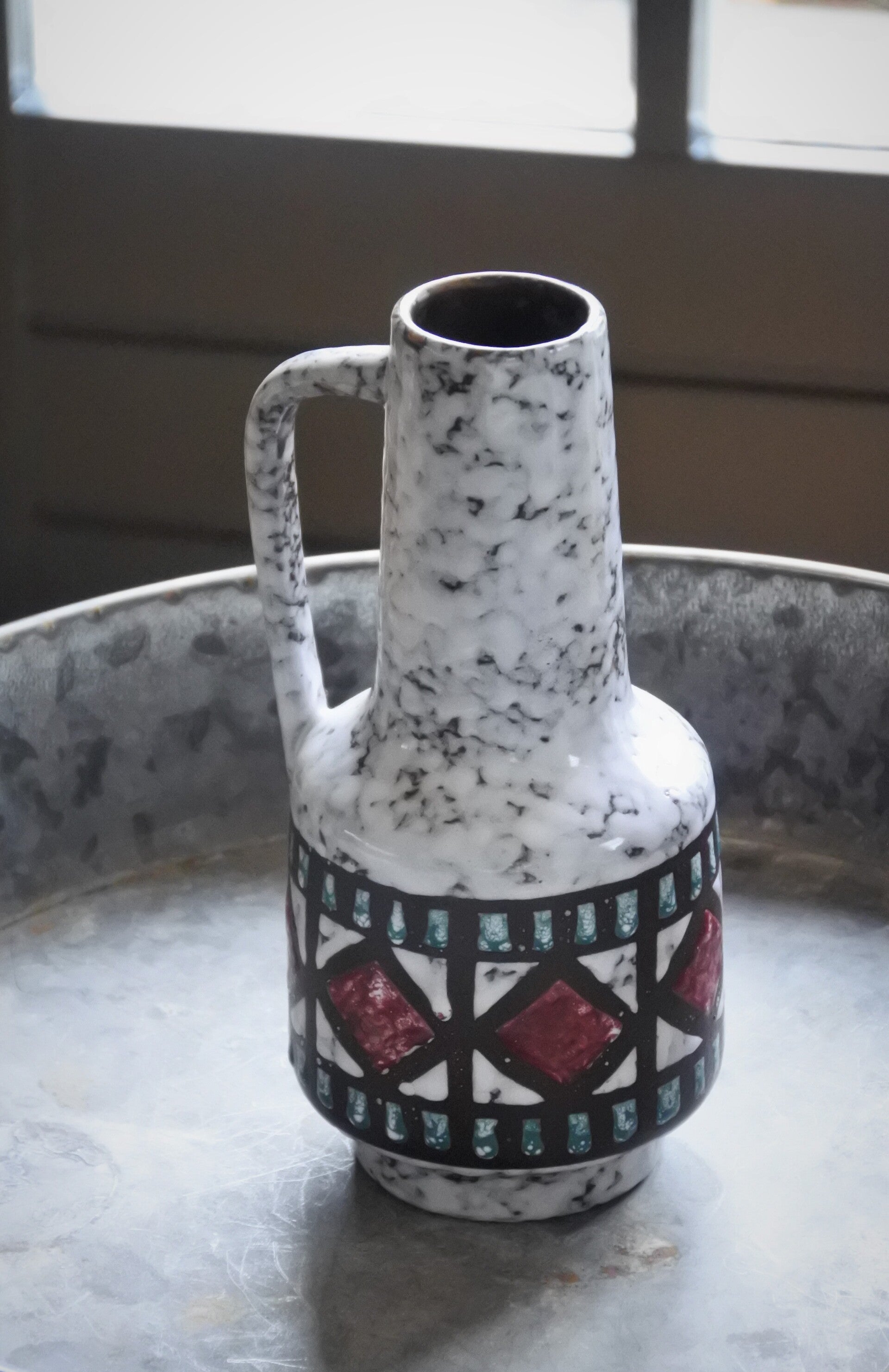 Deze Germany vaas van VEB Haldelsleben uit de 60's is een ware beauty te noemen met zijn gemarmerde look, prachtige kleuren en band met kleurige tekening in bordeaux en groen rondom.