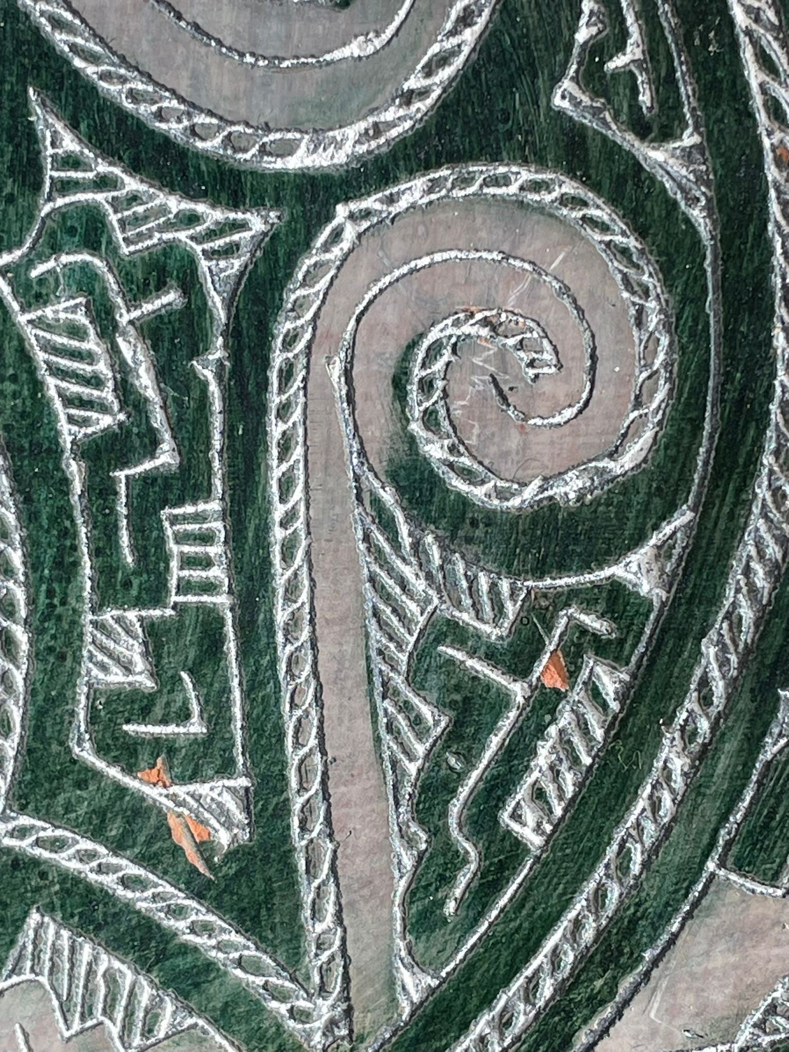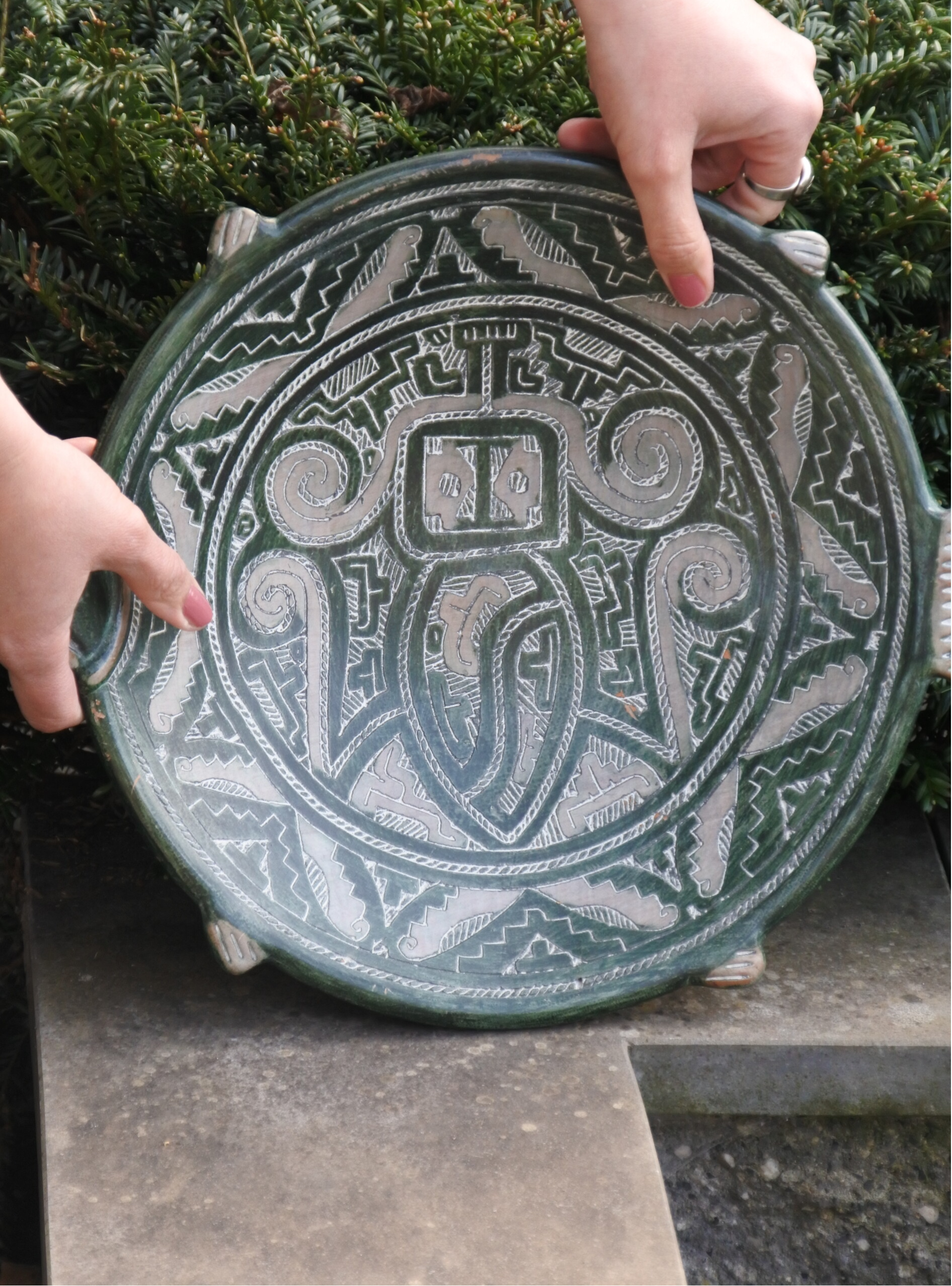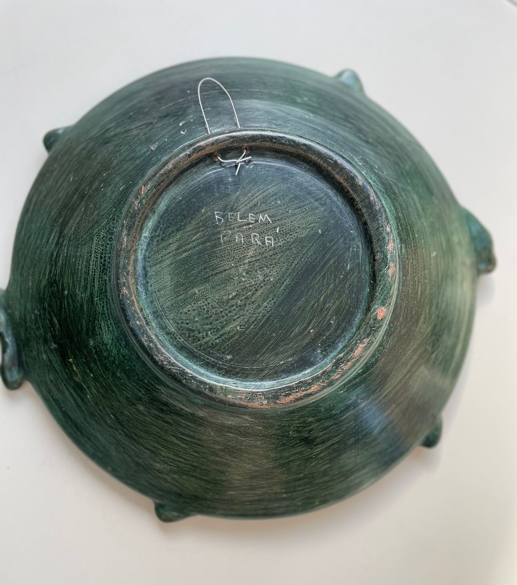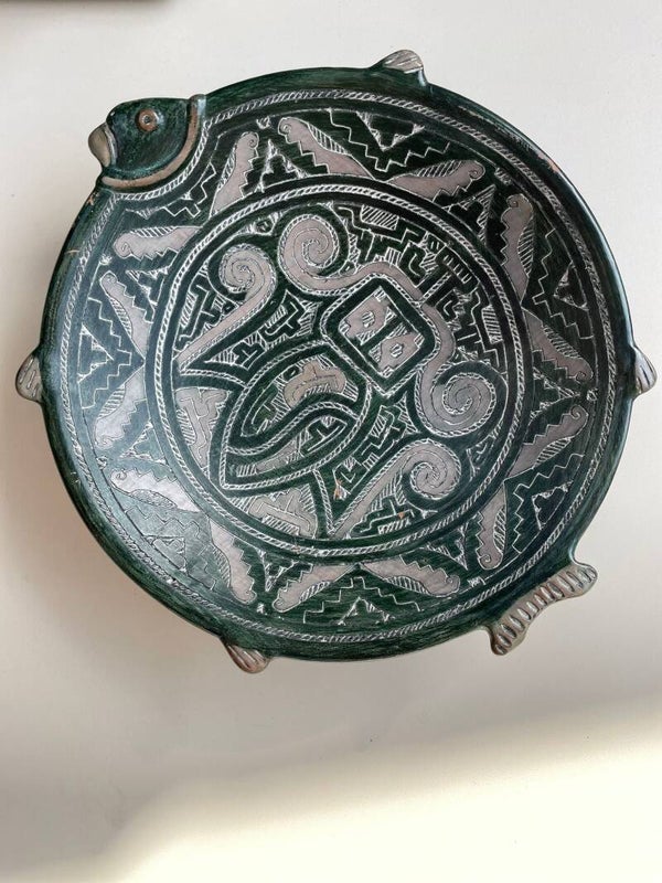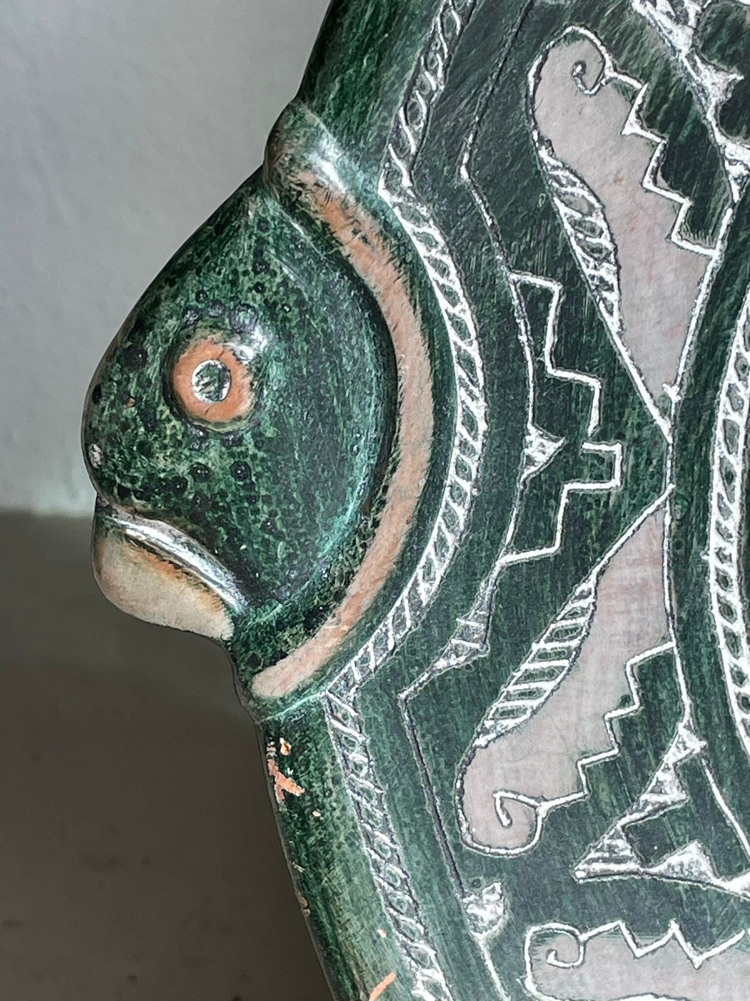 Prachtig wandbord van keramiek in een donkergroene kleur met zilvergrijze details in de vorm van een vis.