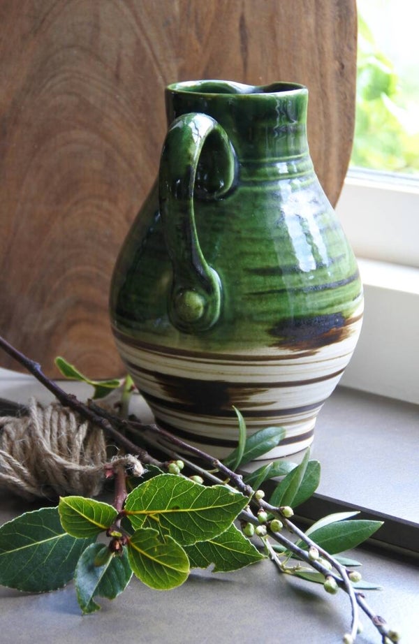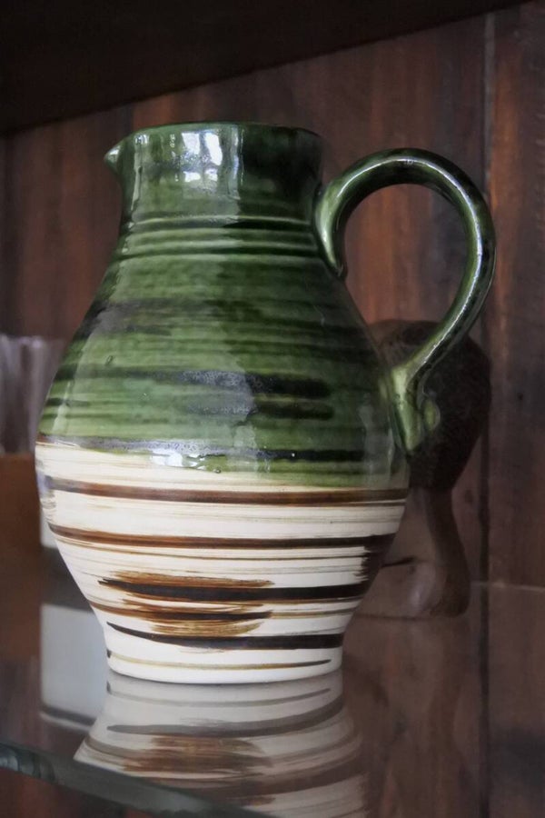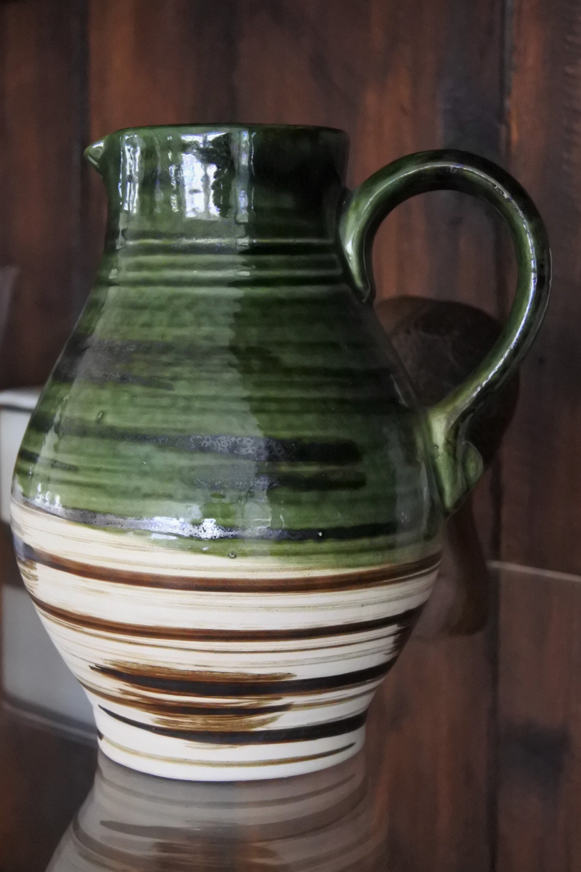 Prachtig vintage vaasje van Dümler & Breiden, West Germany. Deze vaas heeft een frisse grasgroene kleur, een roomwit kleurende onderkant en donkerbruine accenten.