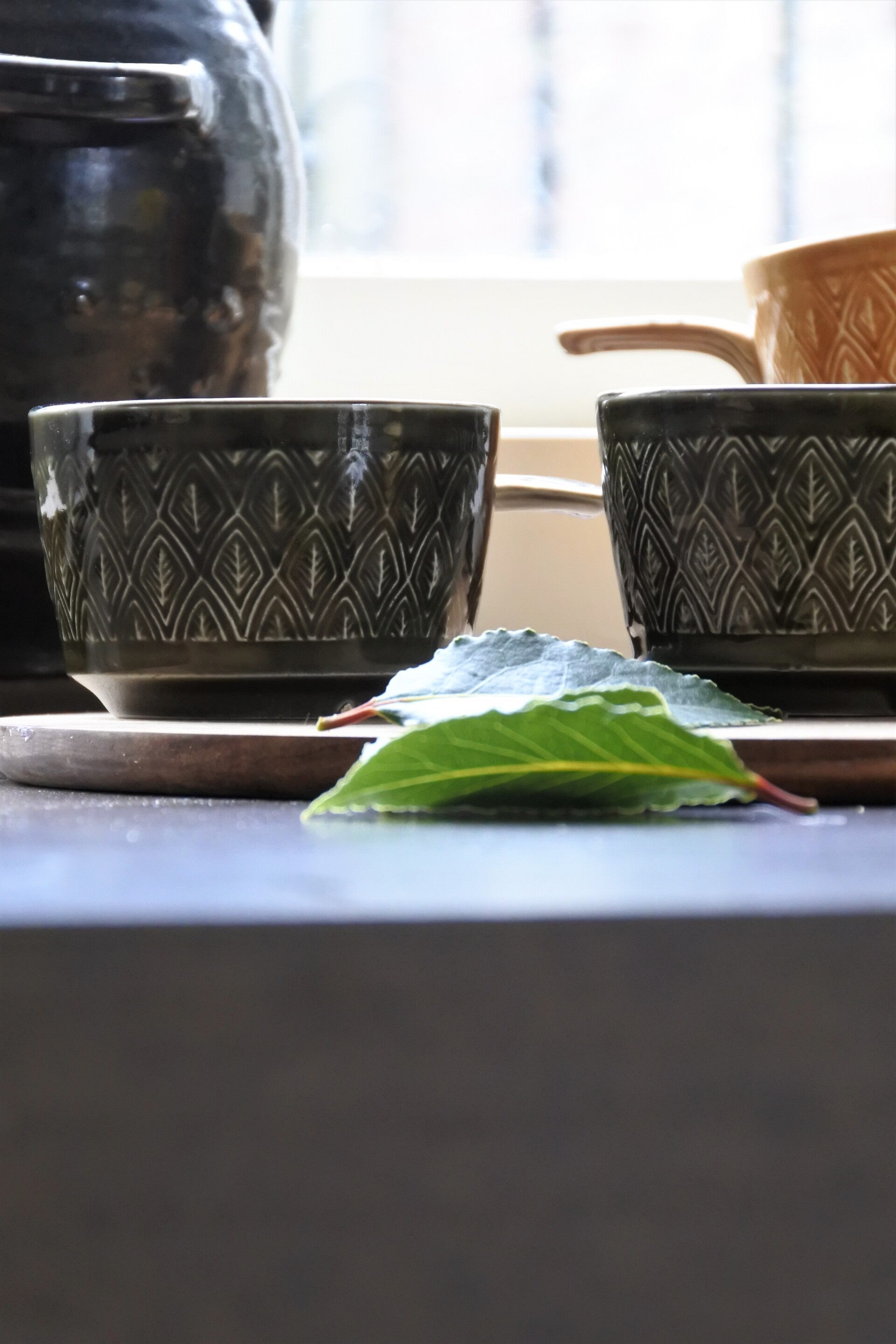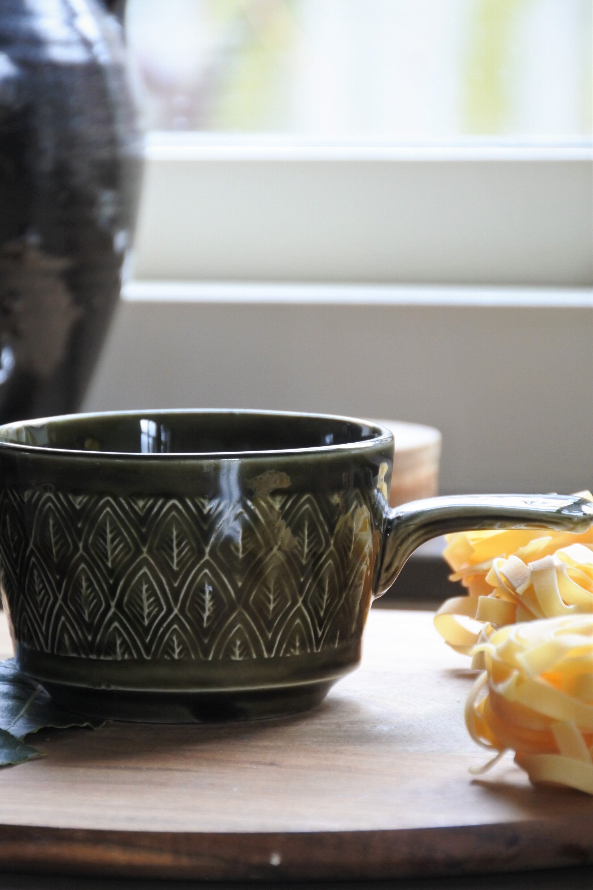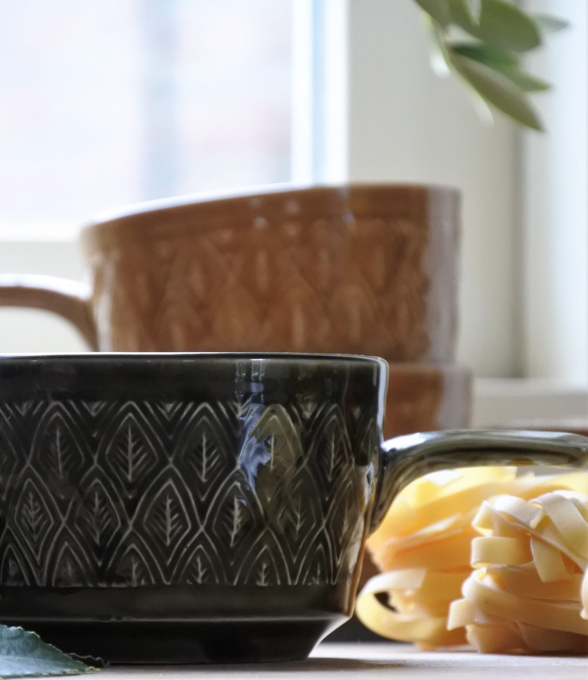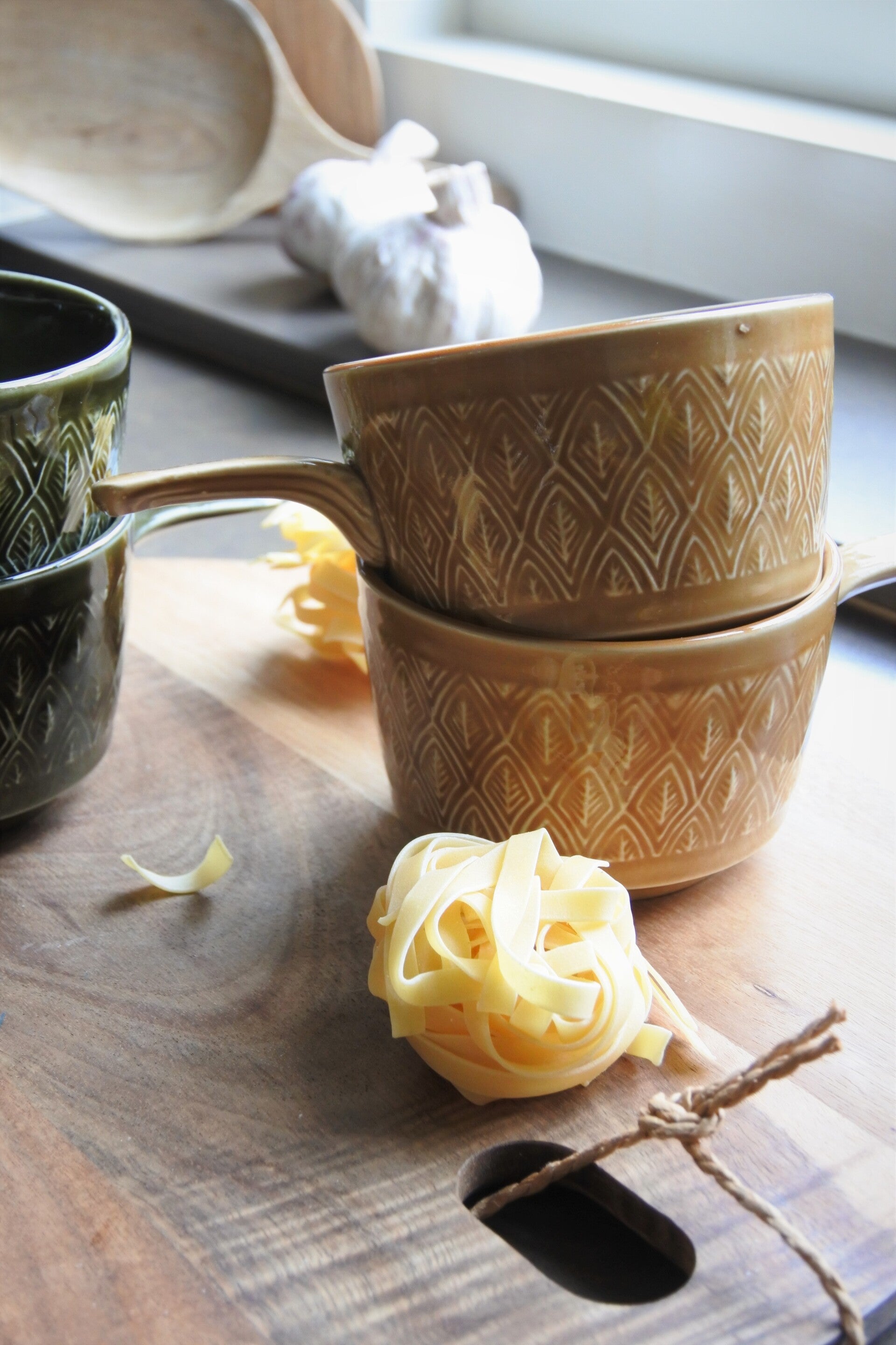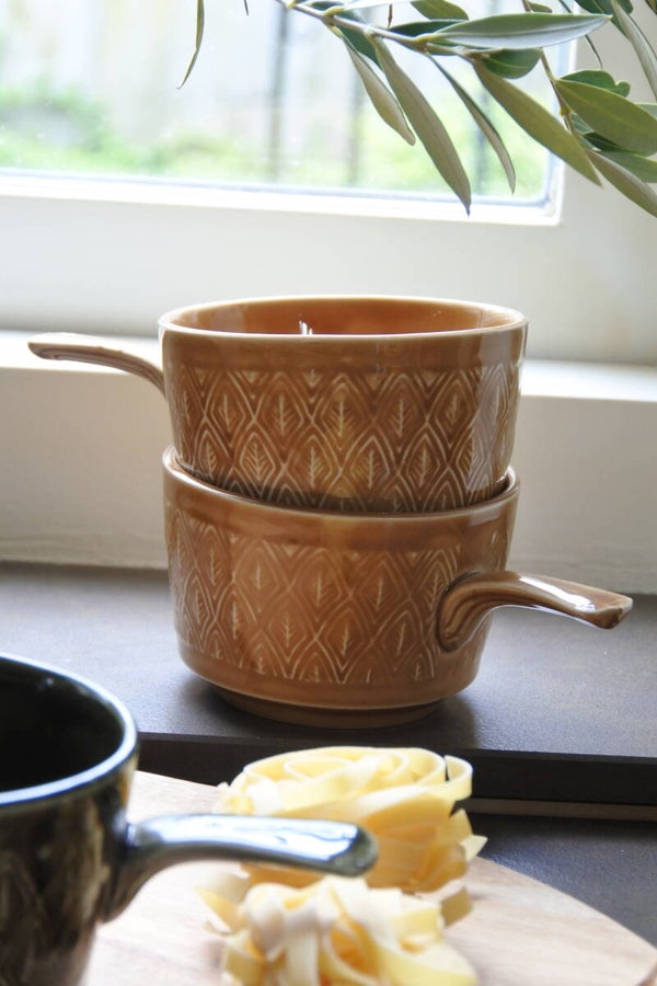 Mooie set soepkommen van Staffordshire England in 2 kleuren, groen en geel. De soepkommen hebben een mooi patroon en een handig steeltje. Ook erg leuk om als snackschaaltjes te gebruiken. De set verkopen we per 2.