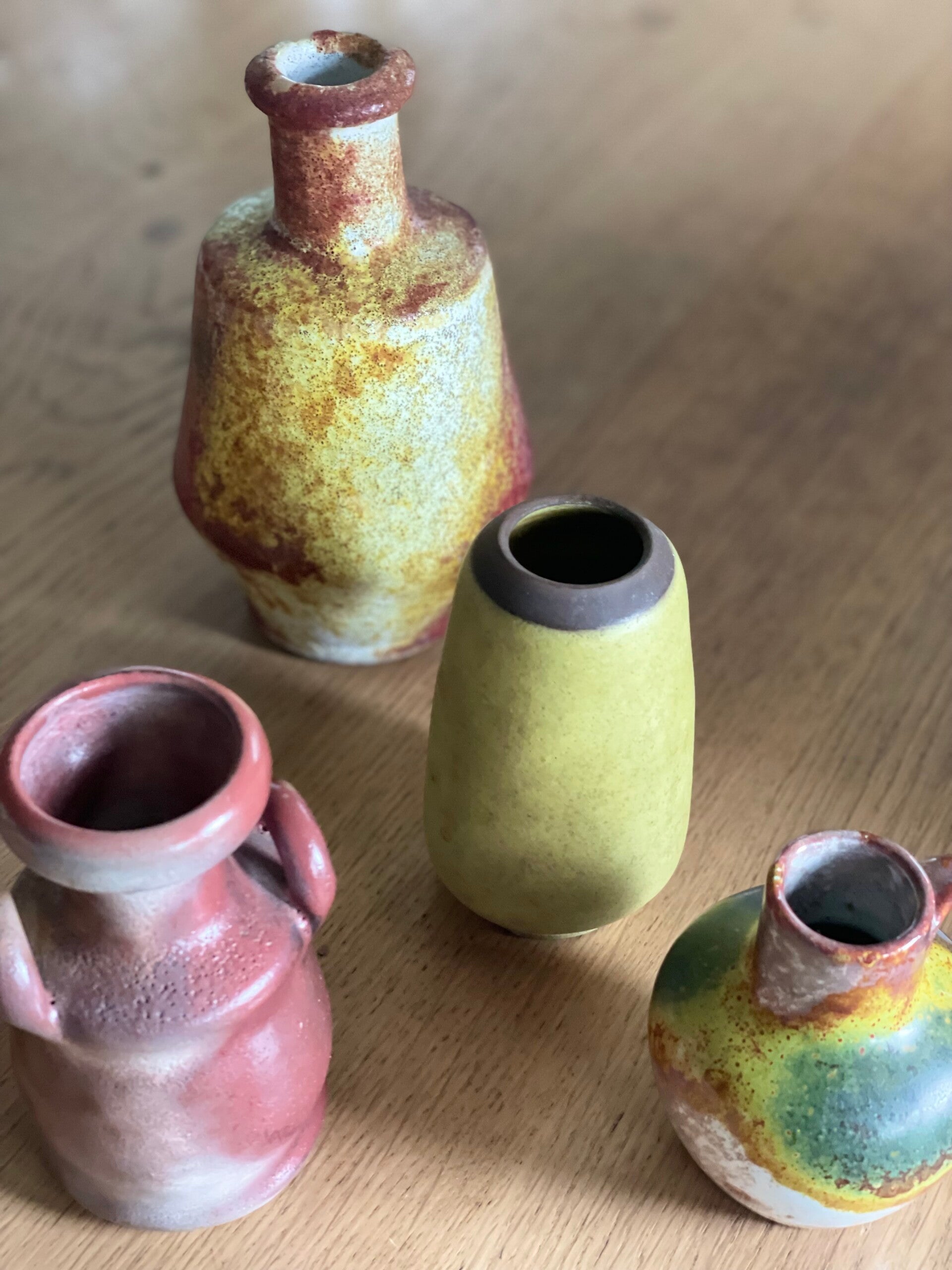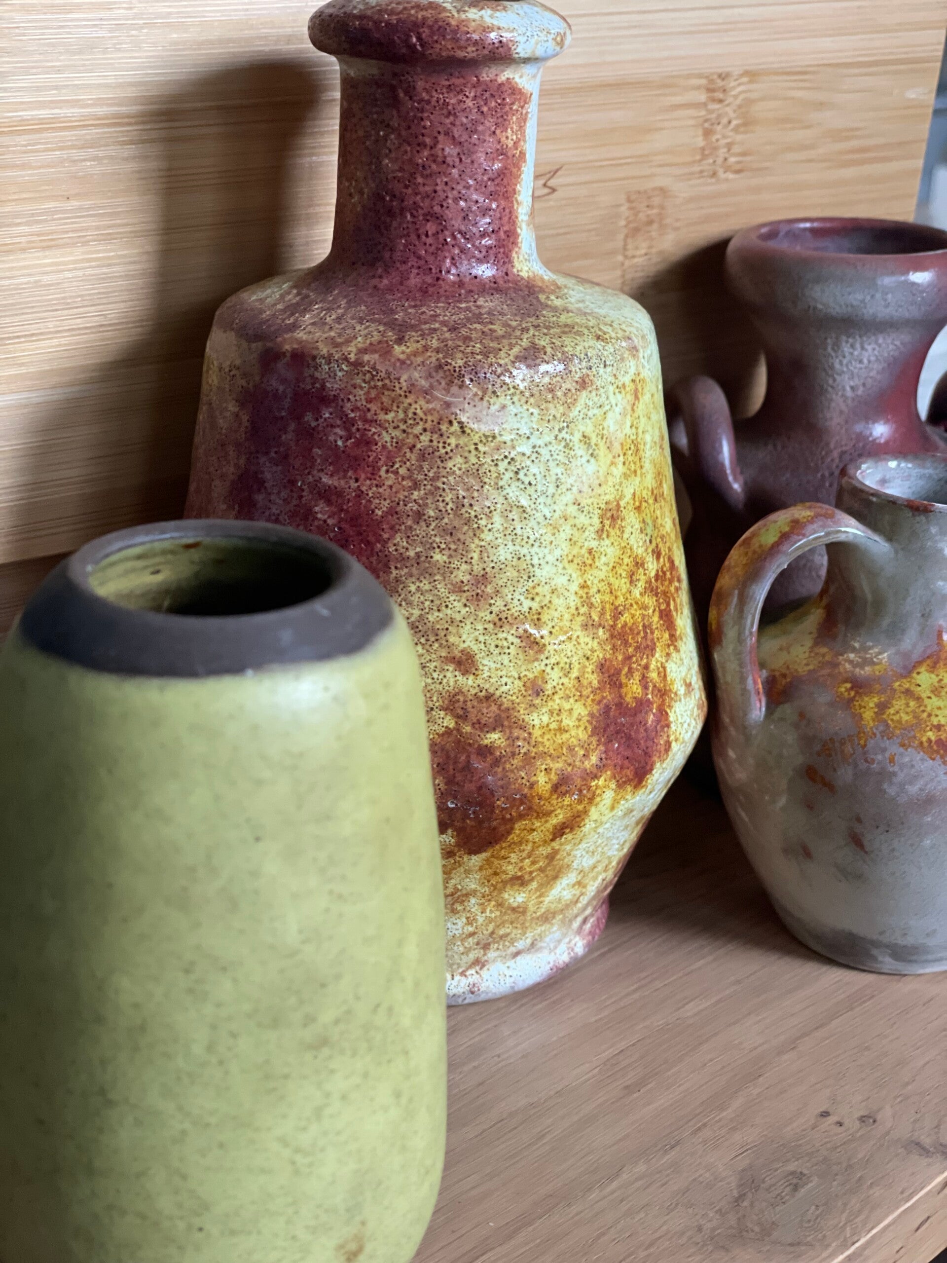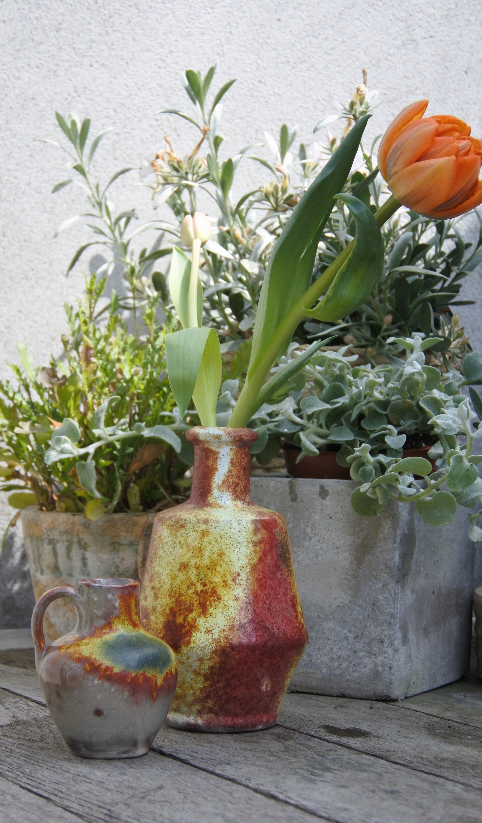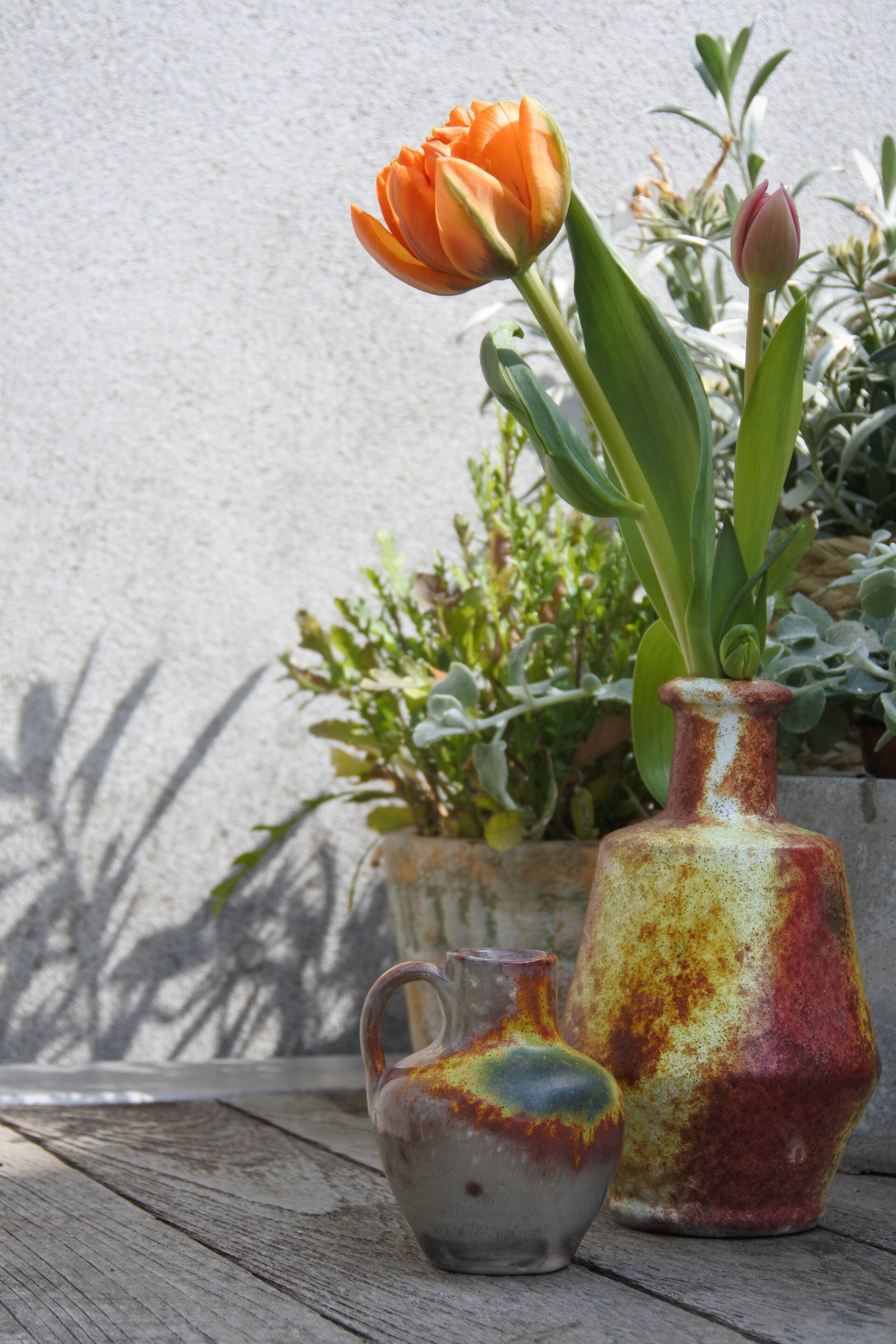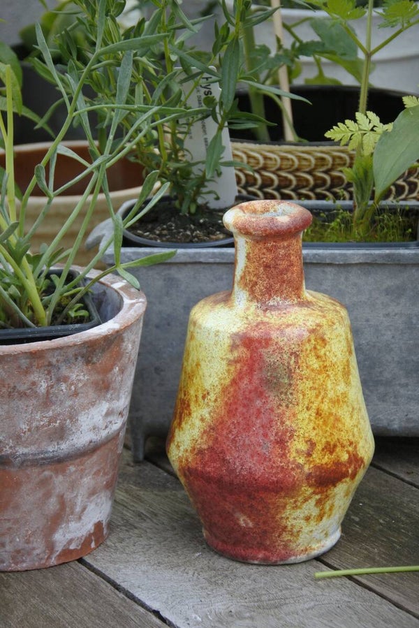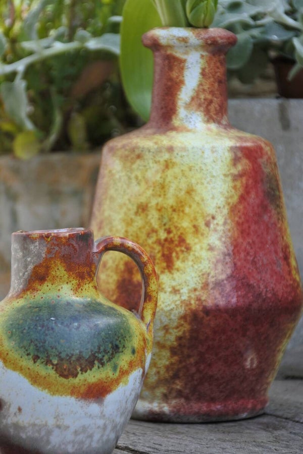 Mooi bewerkt vintage vaasje in warme zomerkleuren en een fijne bruisglazuur structuur.