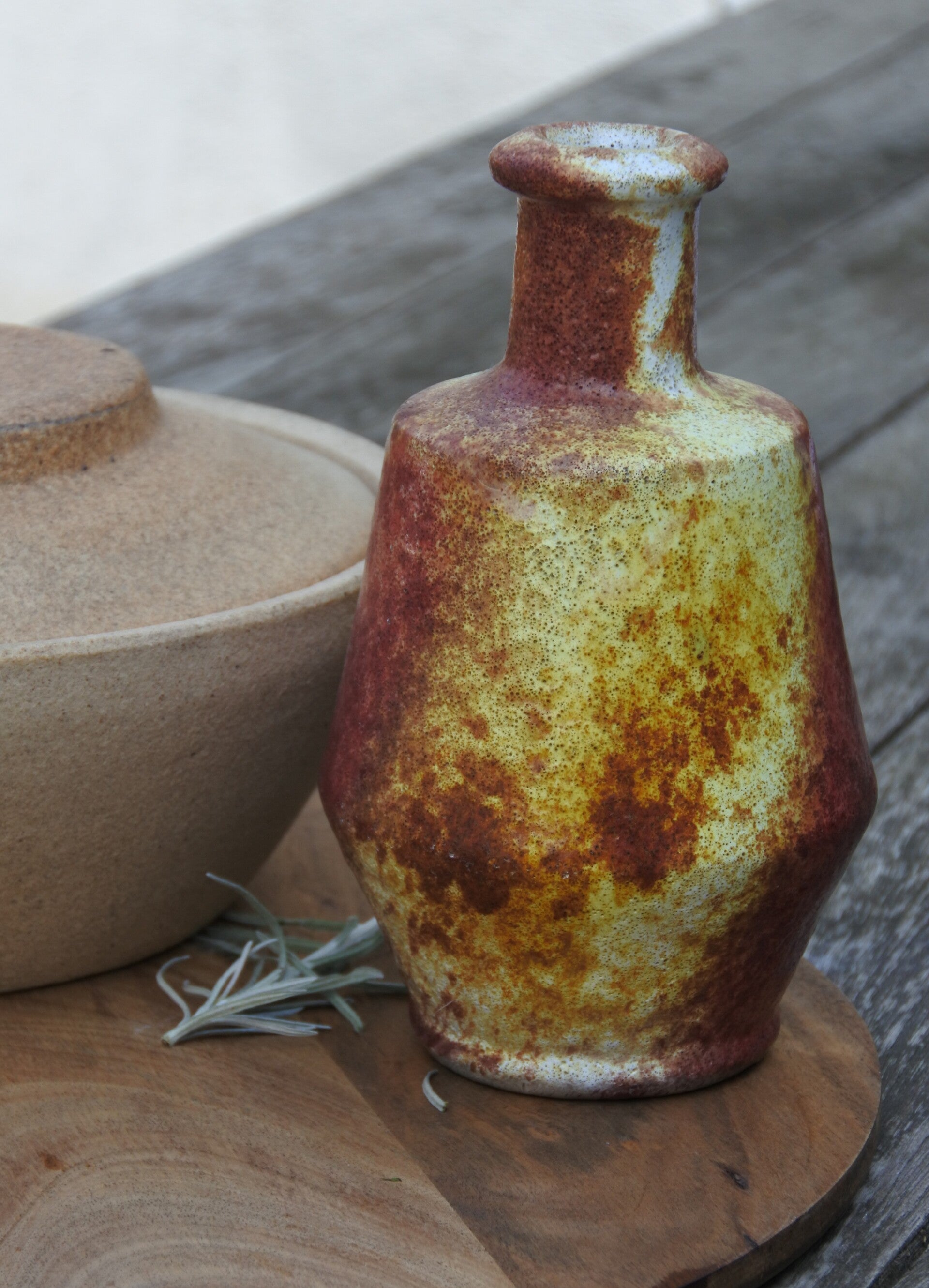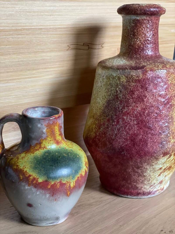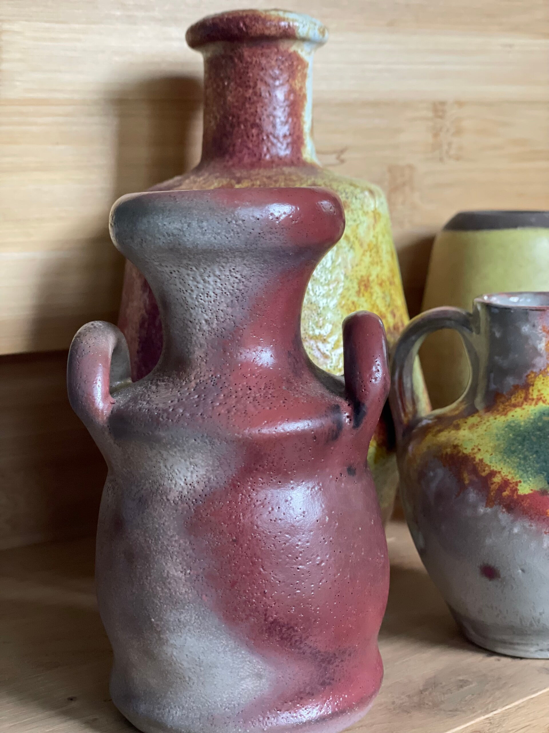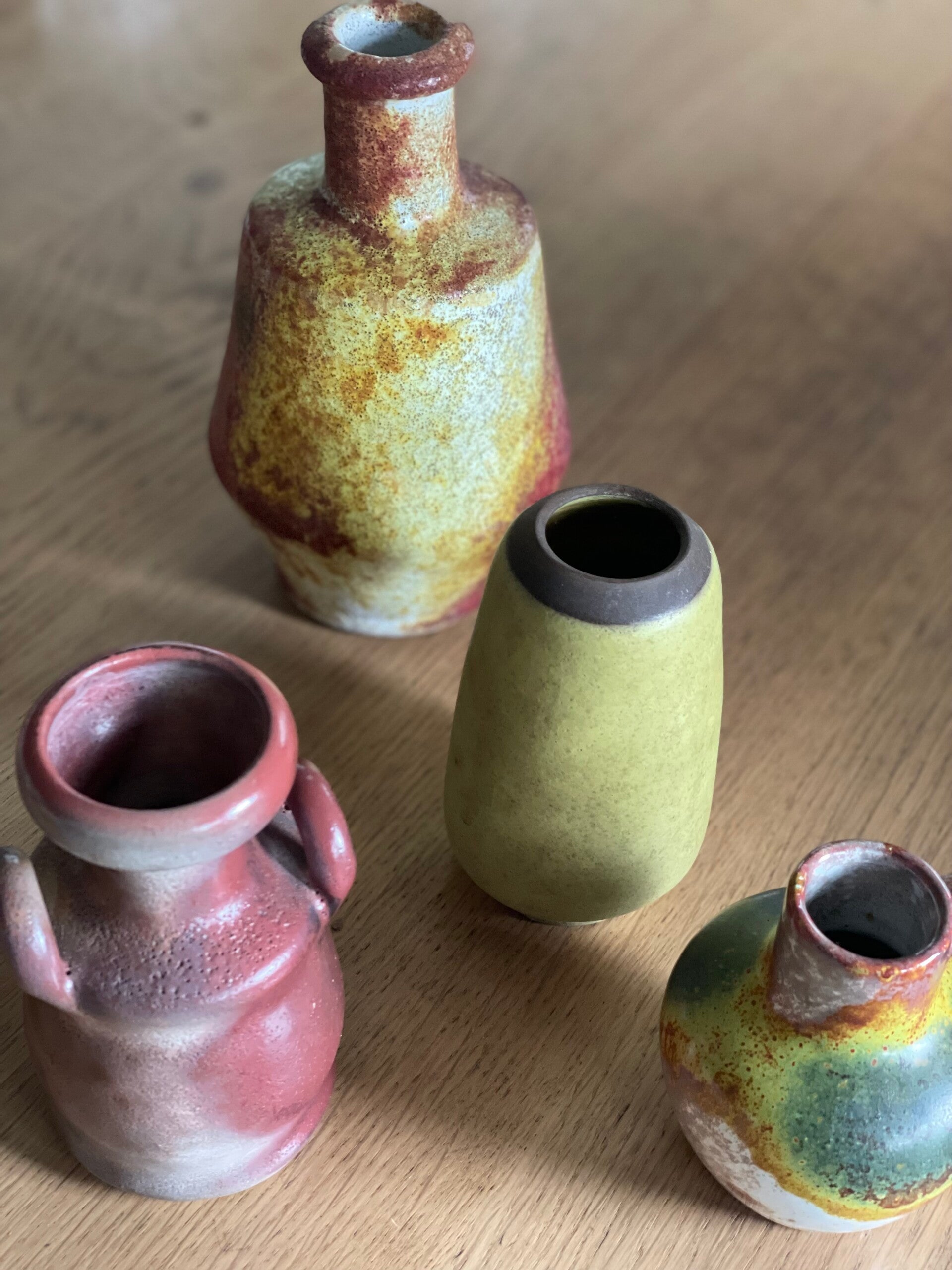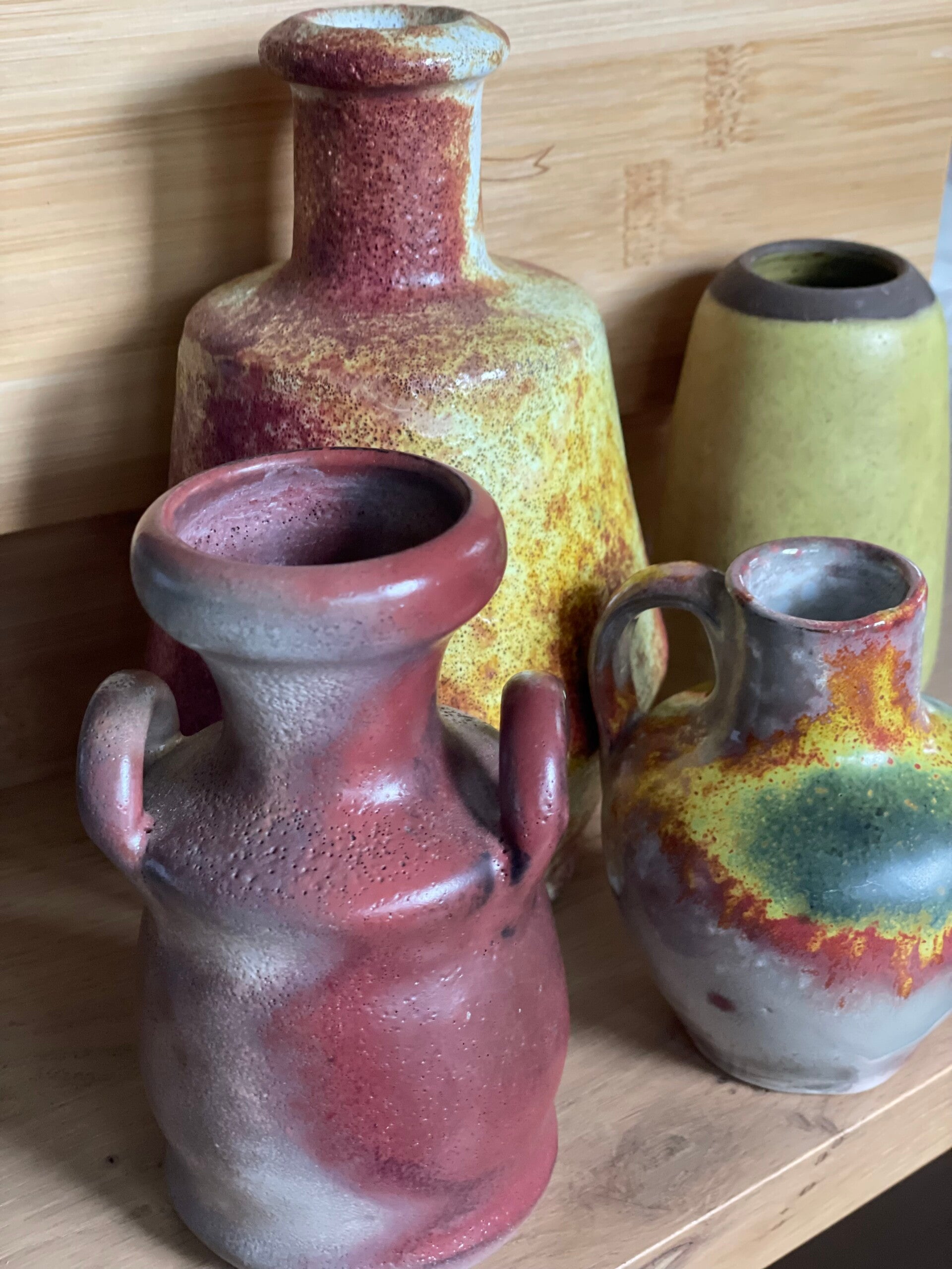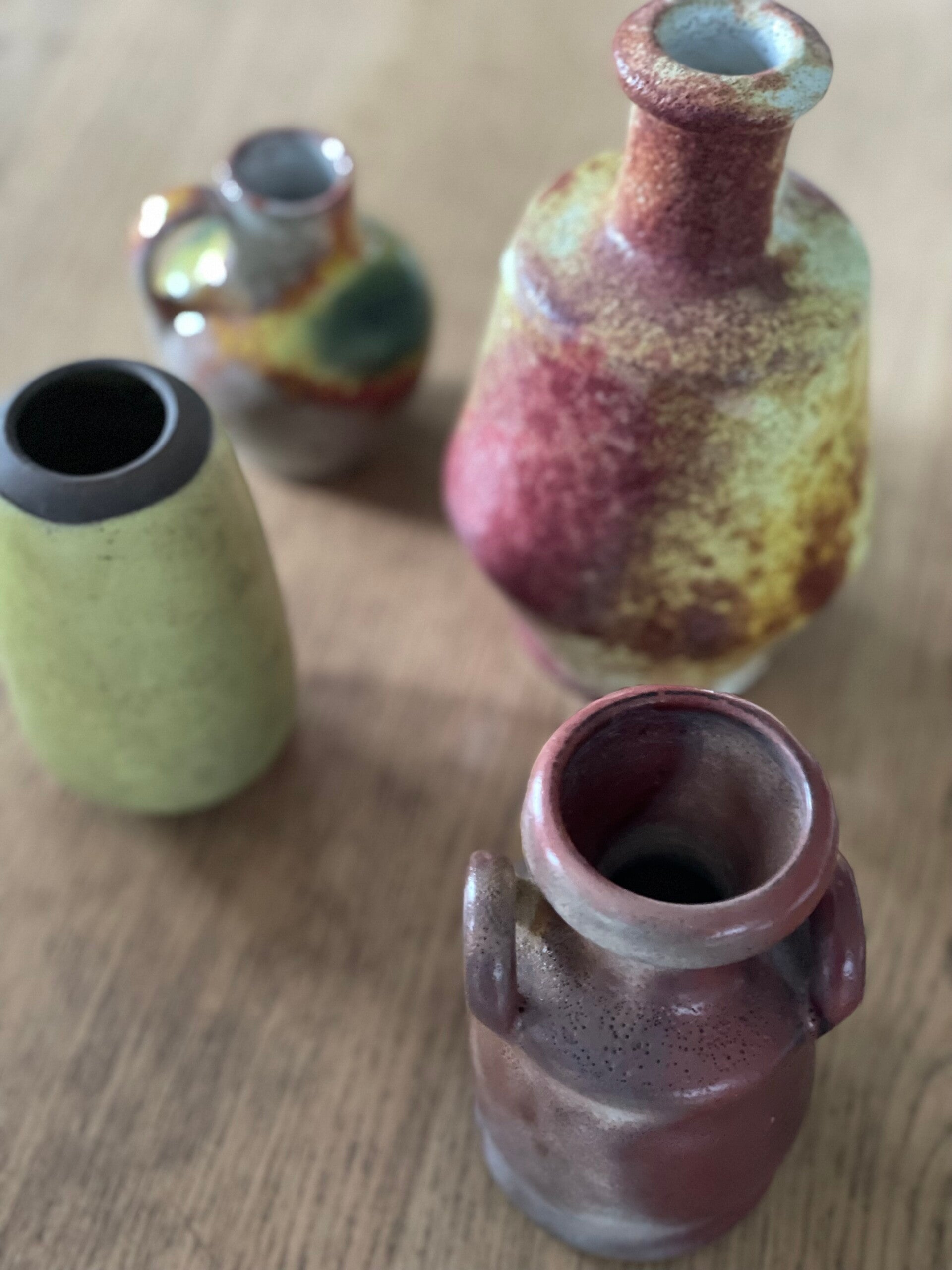 Mooi bewerkt vintage vaasje in warme zomerkleuren en een fijne bruisglazuur structuur.