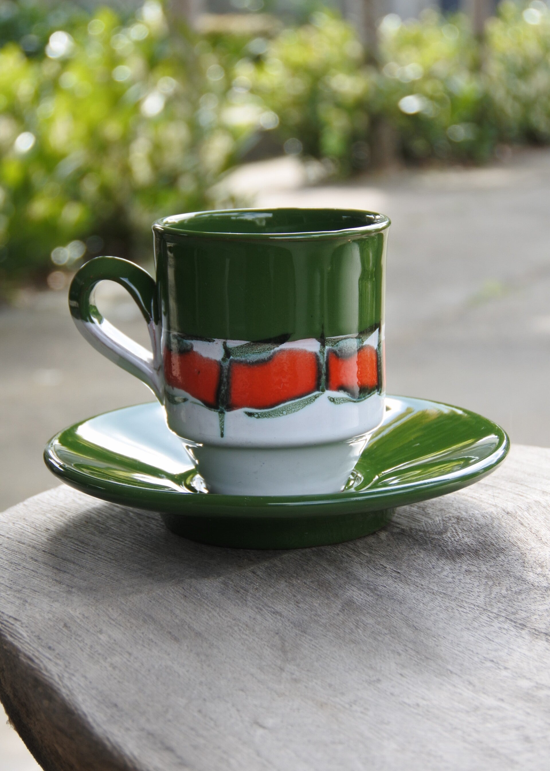Super leuke set van 2 vintage kop en schotels in fris grasgroene kleur met speciaal fat lava effect in wit en rood.