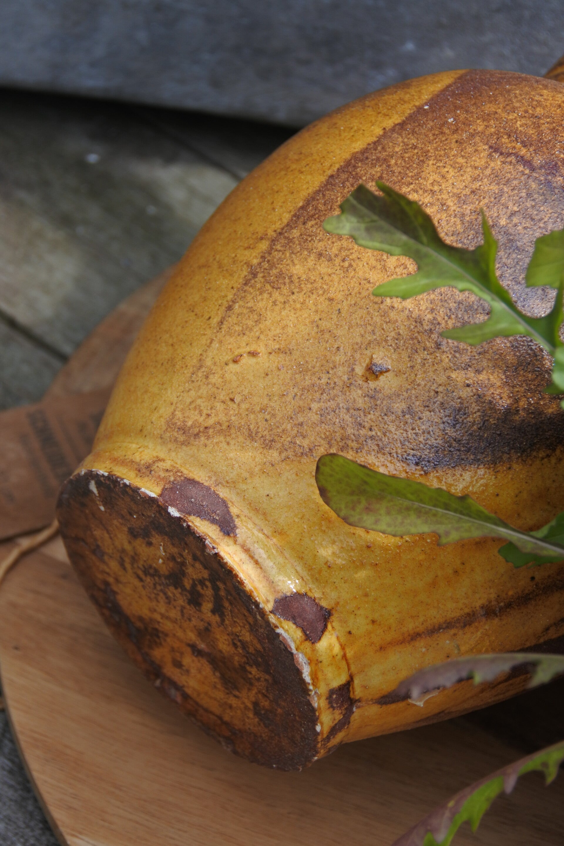 Vintage aardewerk karaf met mooi kleureffect in geel en mokkabruin
