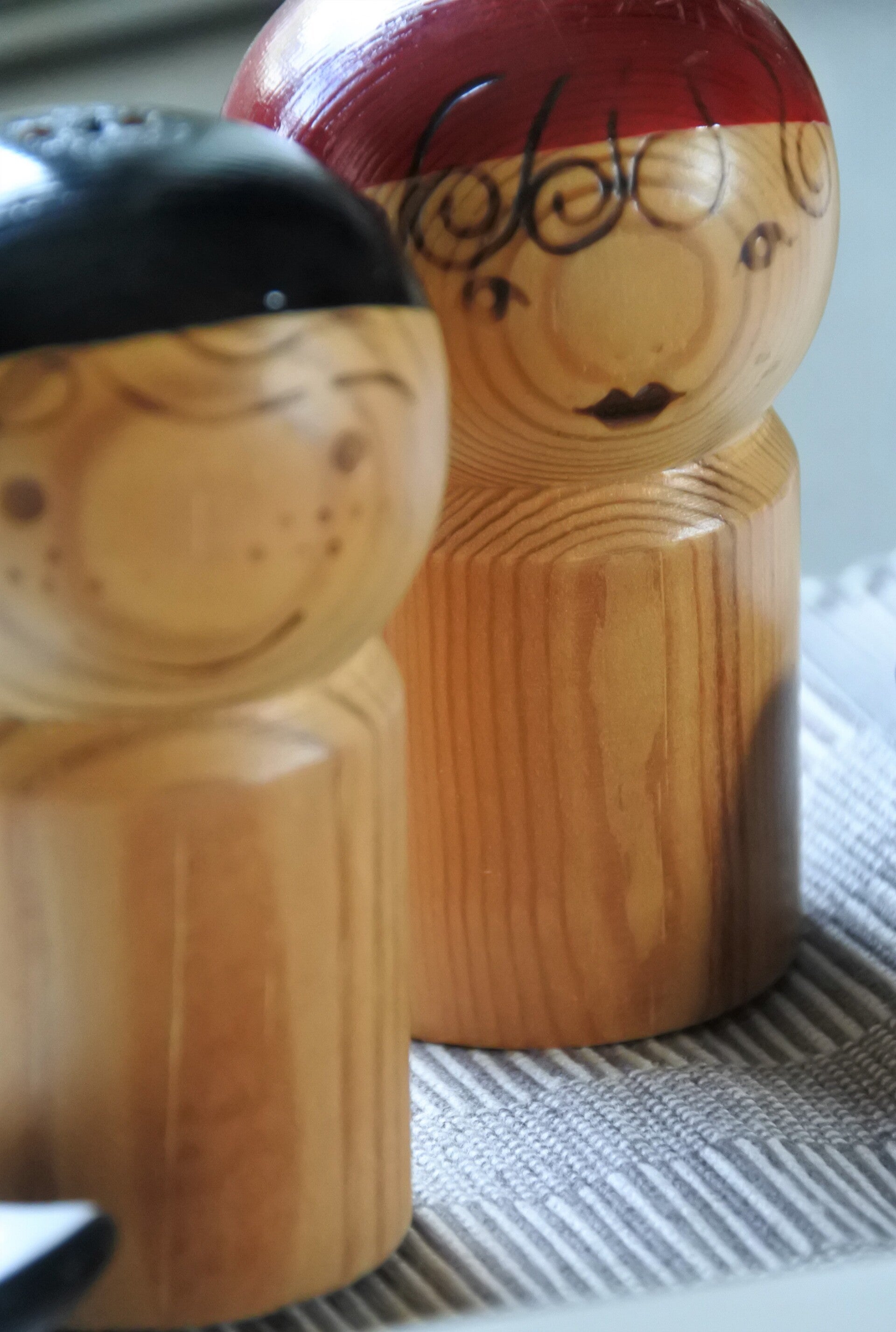 Vintage Aarikka Finland design peper en zout stel van hout met zwart en roodkleurig kopje. Houd je van scandinavisch design? dan is dit setje echt iets voor jou!