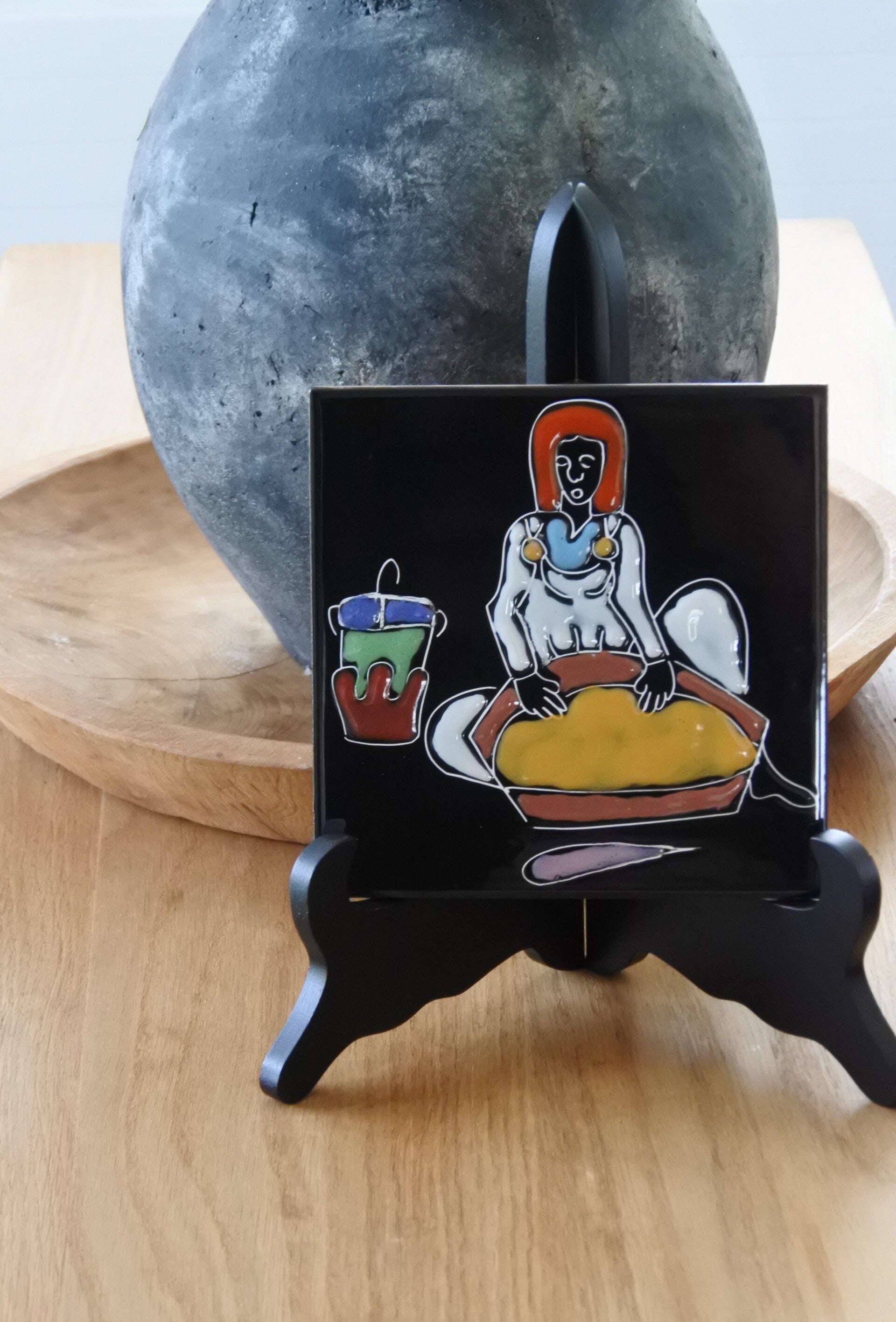 Je hebt wel eens van die spulletjes.. die wil je eigenlijk niet kwijt, zo ook in dit geval want.. wat een mooi tegeltje! zulke te gekke items kunnen we jullie natuurlijk niet onthouden dus hij mag iemand anders zijn huis gaan opfleuren! De tegel heeft een gladde structuur, een zwarte ondergrond en een leuke tekening waarbij de opliggende frisse kleuren bijna van het tegeltje lijken af te springen.