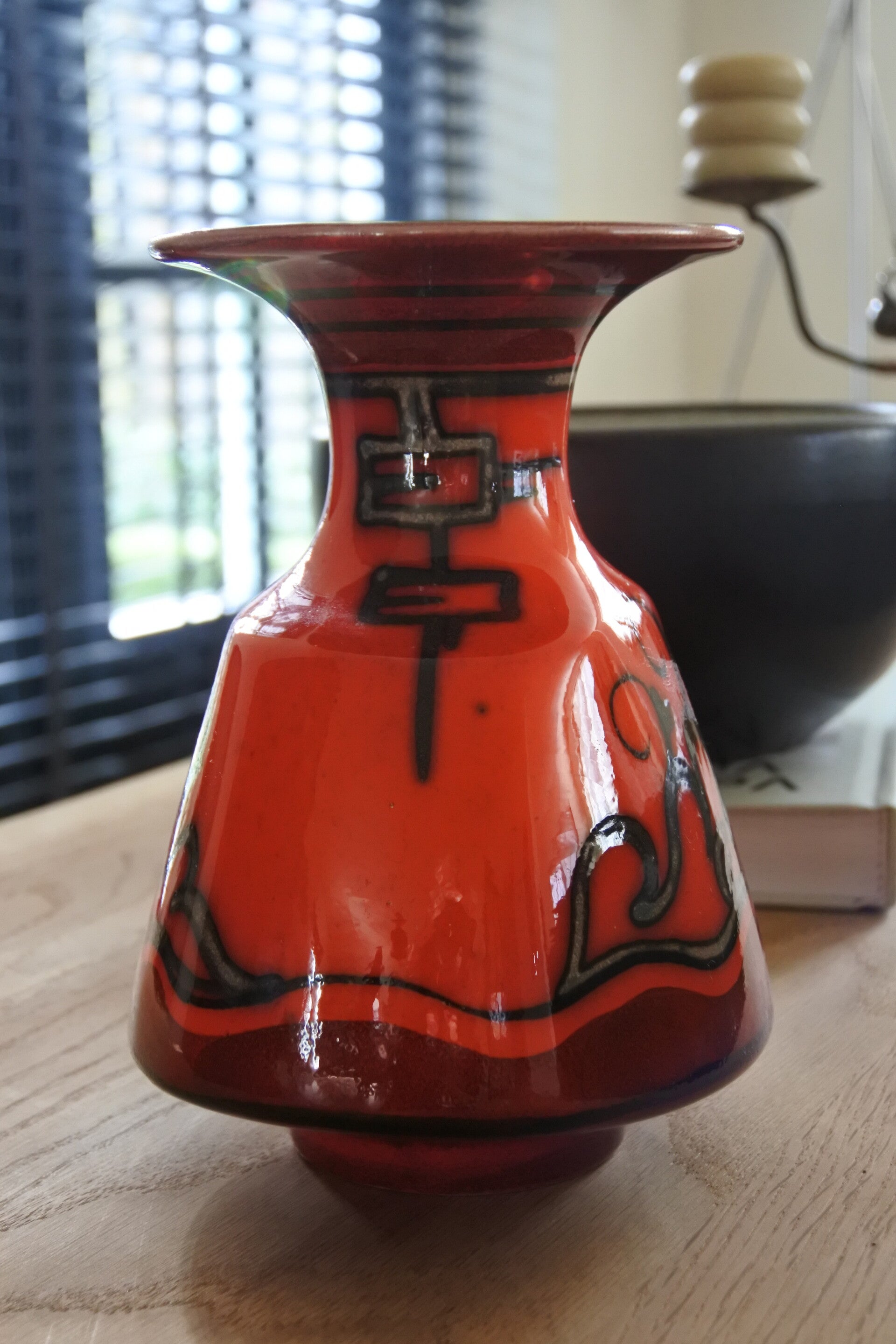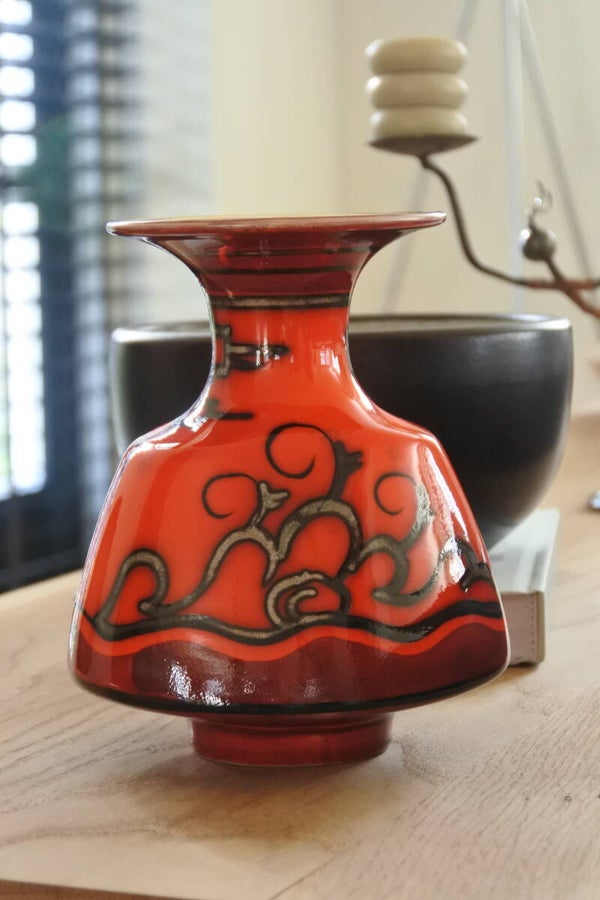 Prachtige vaas van Flora Gouda Holland uit de serie Tokio. deze mooie vaas heeft een fris rood-oranje kleur en een gele binnenzijde.