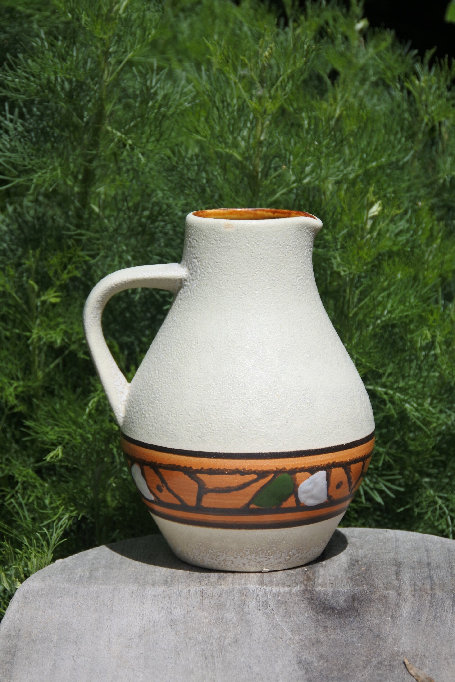 Deze leuke en toffe vaas betreft een West Germany bol (kruik)vaas met oor, een kleine structuurtje en leuke contrasterende band in oranje, groen en donkerbruin. De binnenzijde van de vaas heeft een warme oranje kleur. Dit is een leuk model wat je niet dagelijks tegenkomt!