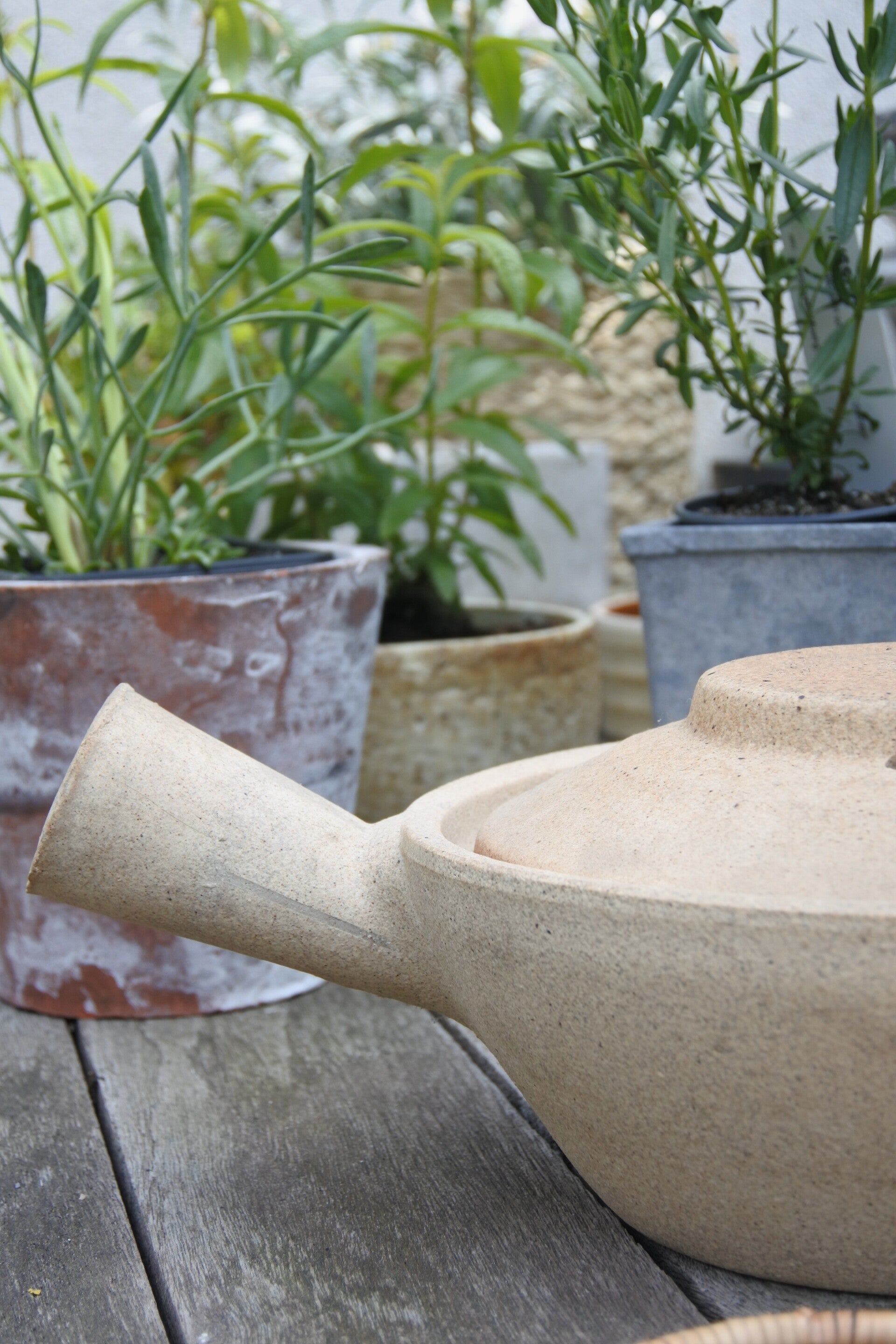 Leuke schaal van zandsteen met deksel en steel handvat.