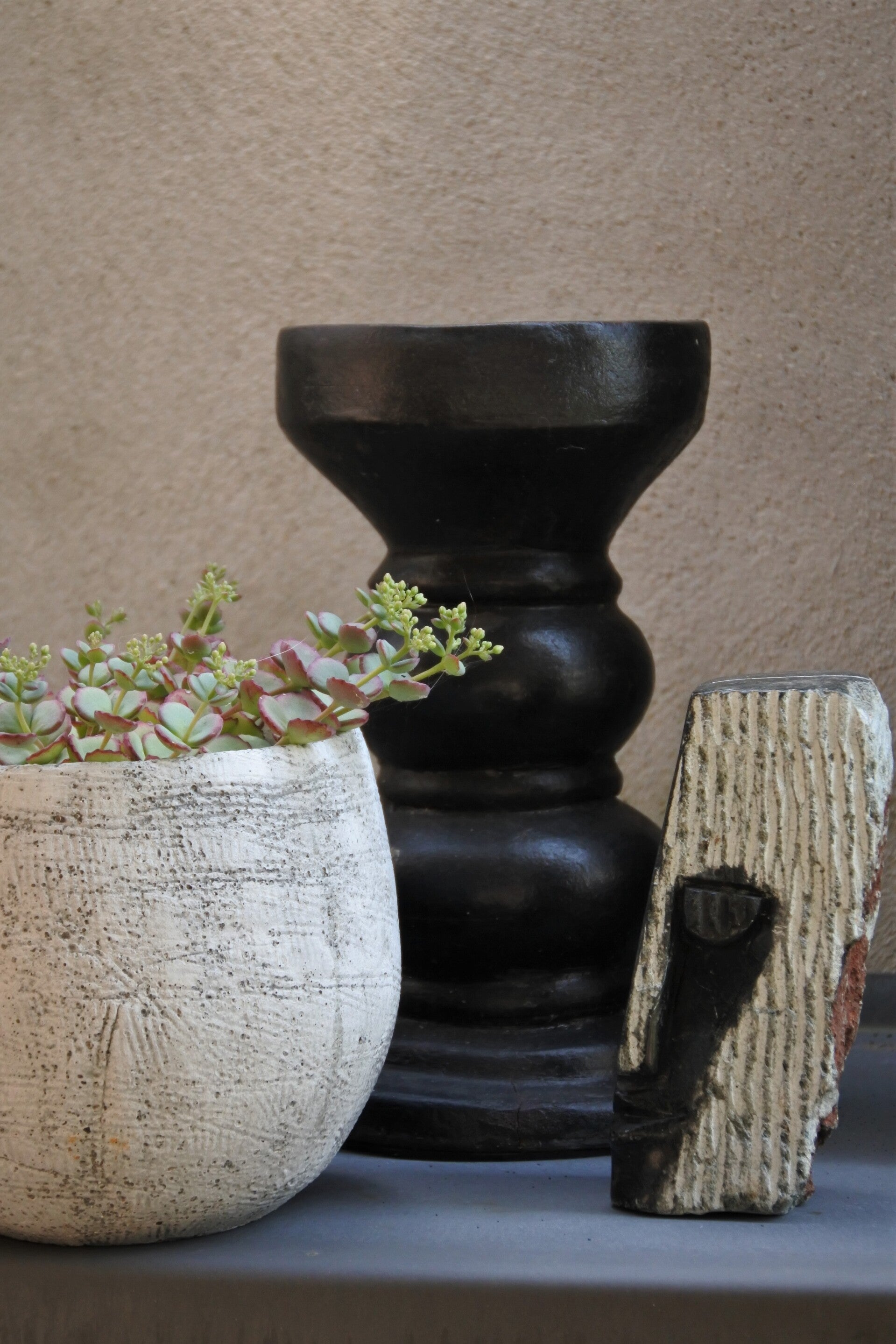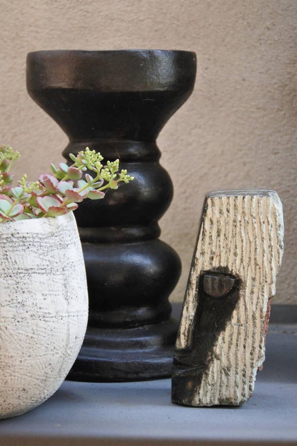 Prachtig beeld vervaardigd uit 1 stuk natuursteen in zwart-grijze kleur. Aan de bovenzijde is een hele smalle uitsparing gecreëerd ( zie foto).