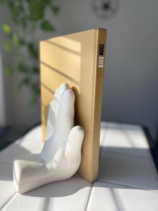 Leuke vintage boekensteun van wit porselein in de vorm van een hand. Aan de onderzijde zit een dopje zodat je de steun kunt vullen met zand.