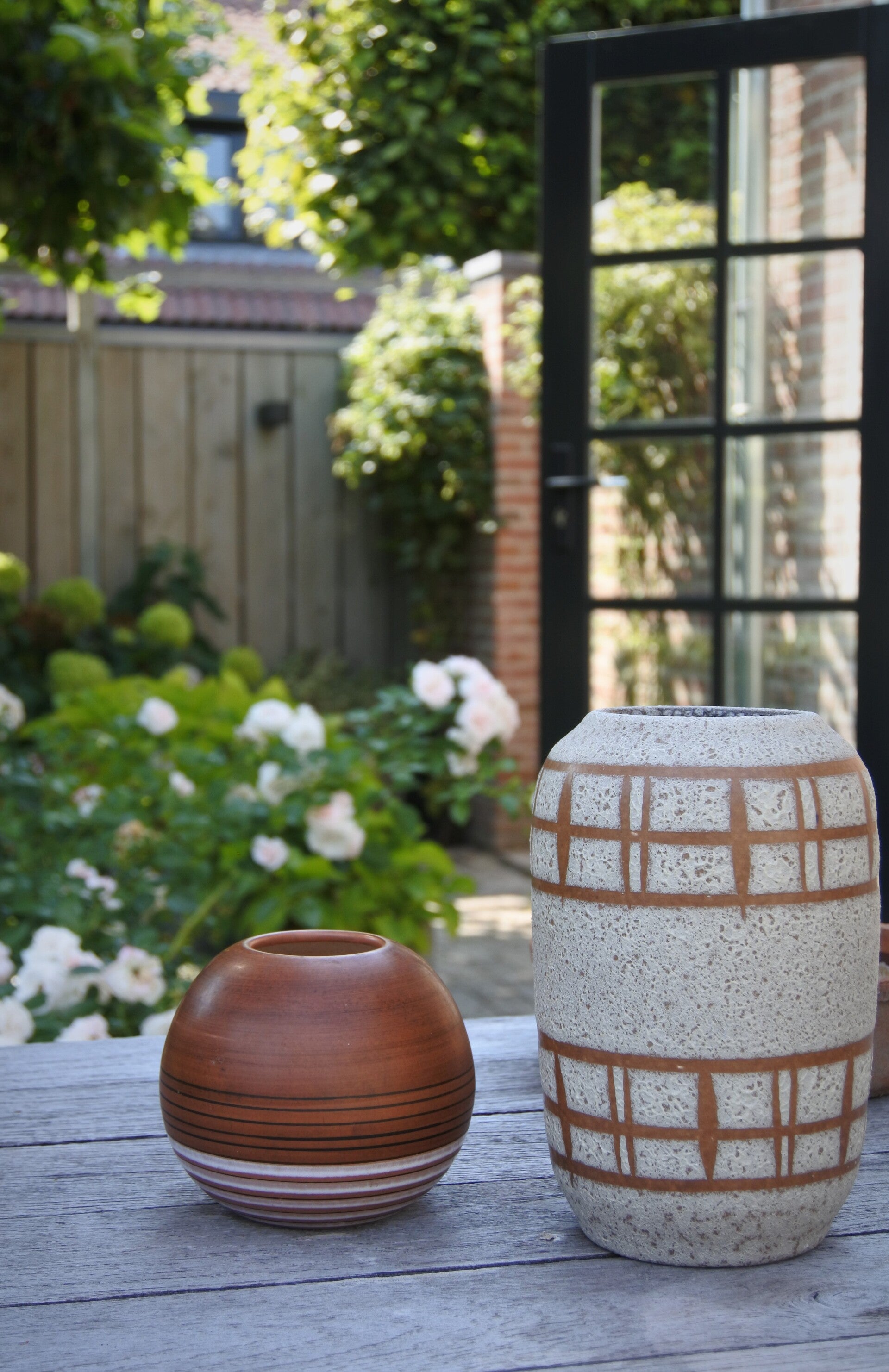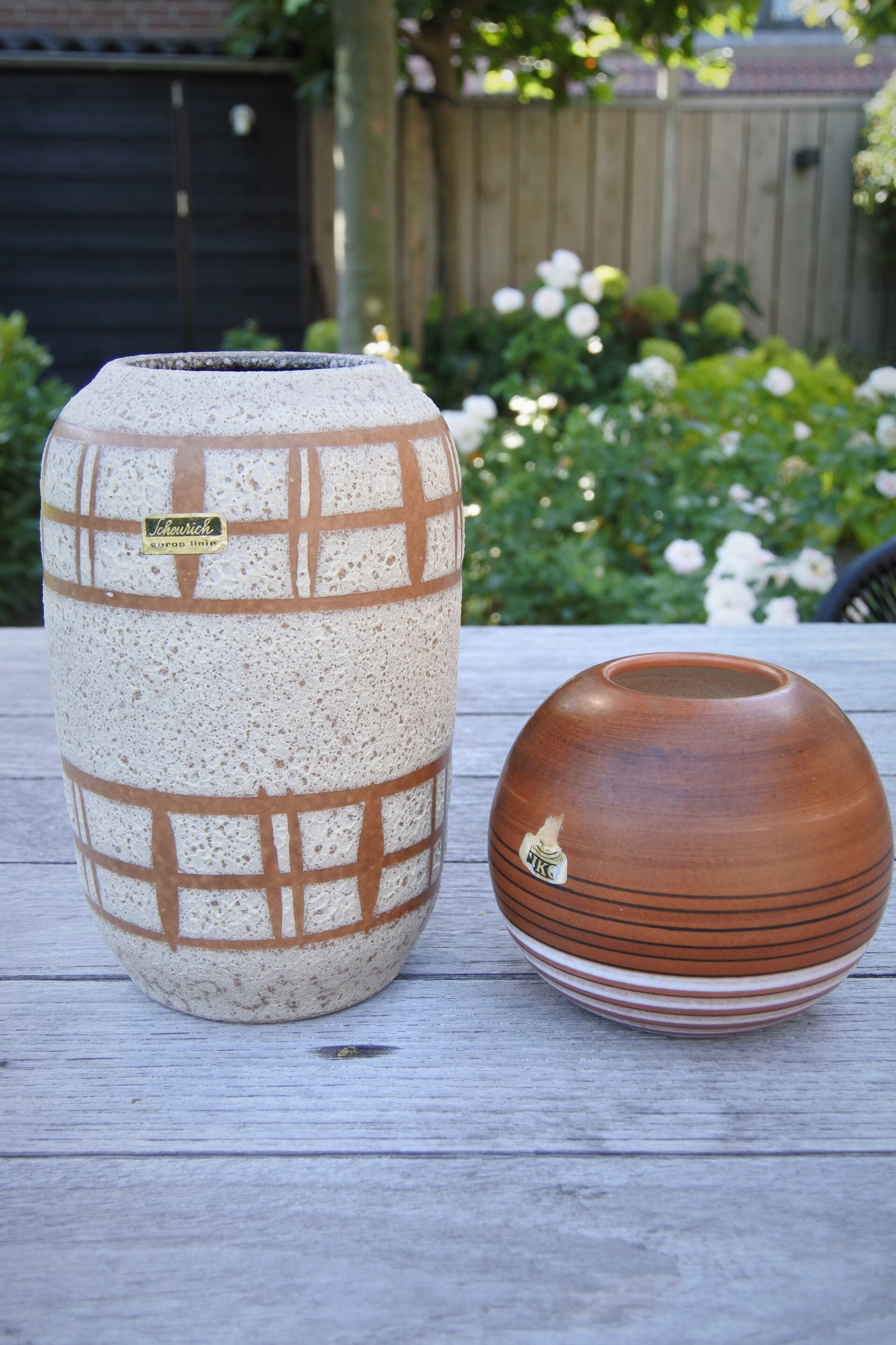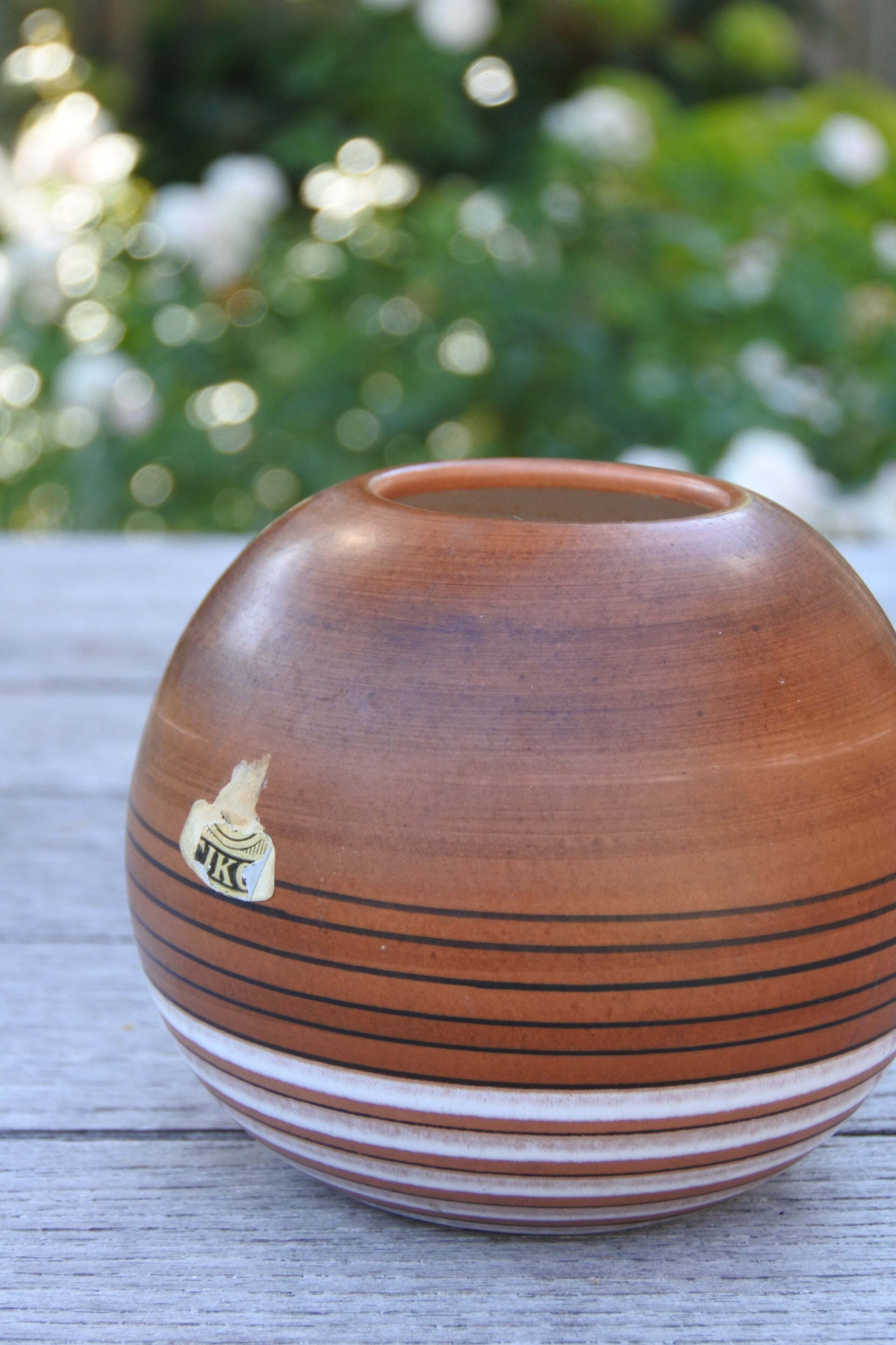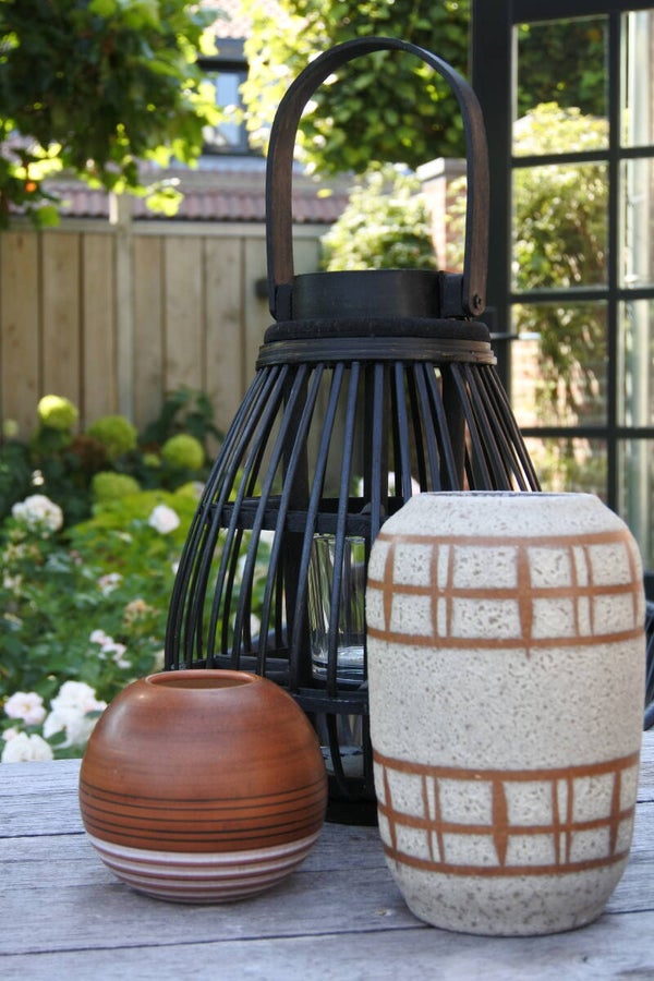 Prachtig mooi bolvaasje uit de 60's met teak decoratie en zwart witte horizontale strepen van hollands trots TIKO Gouda.