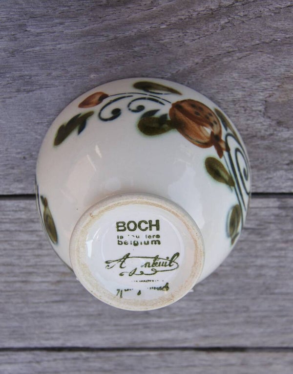 Prachtig vintage handbeschilderd schaaltje (ook wel spoelkom genoemd) van Boch Belgium uit de serie La Louviere, Argenteuil. Het historische bedrijf Boch produceerde dit opvallende ontwerp in de late jaren 1950 of 1960 in zijn fabriek in La Louviere, België.