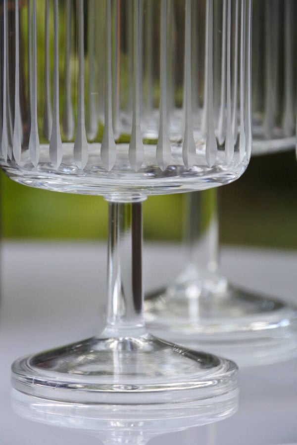 Prachtige vintage set van 4 mooie mid century modern glazen met in het glas gegraveerde verticale strepen.