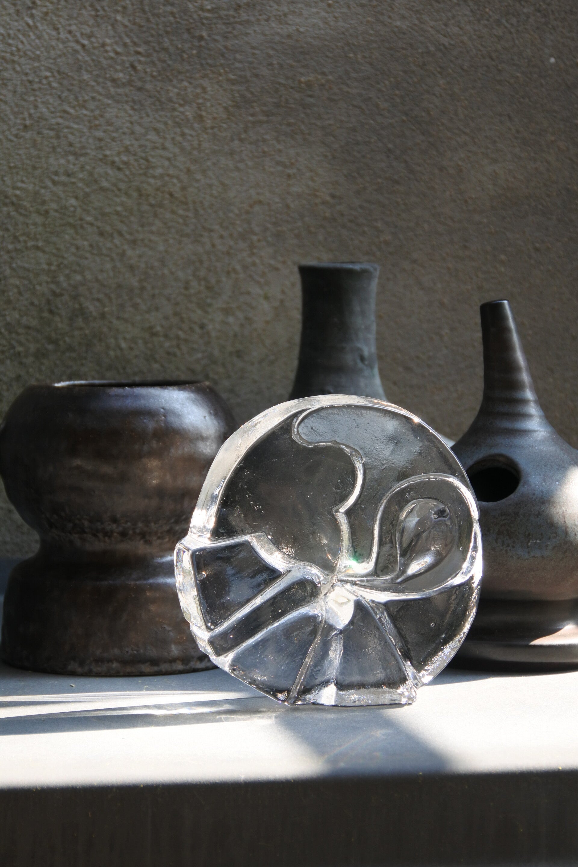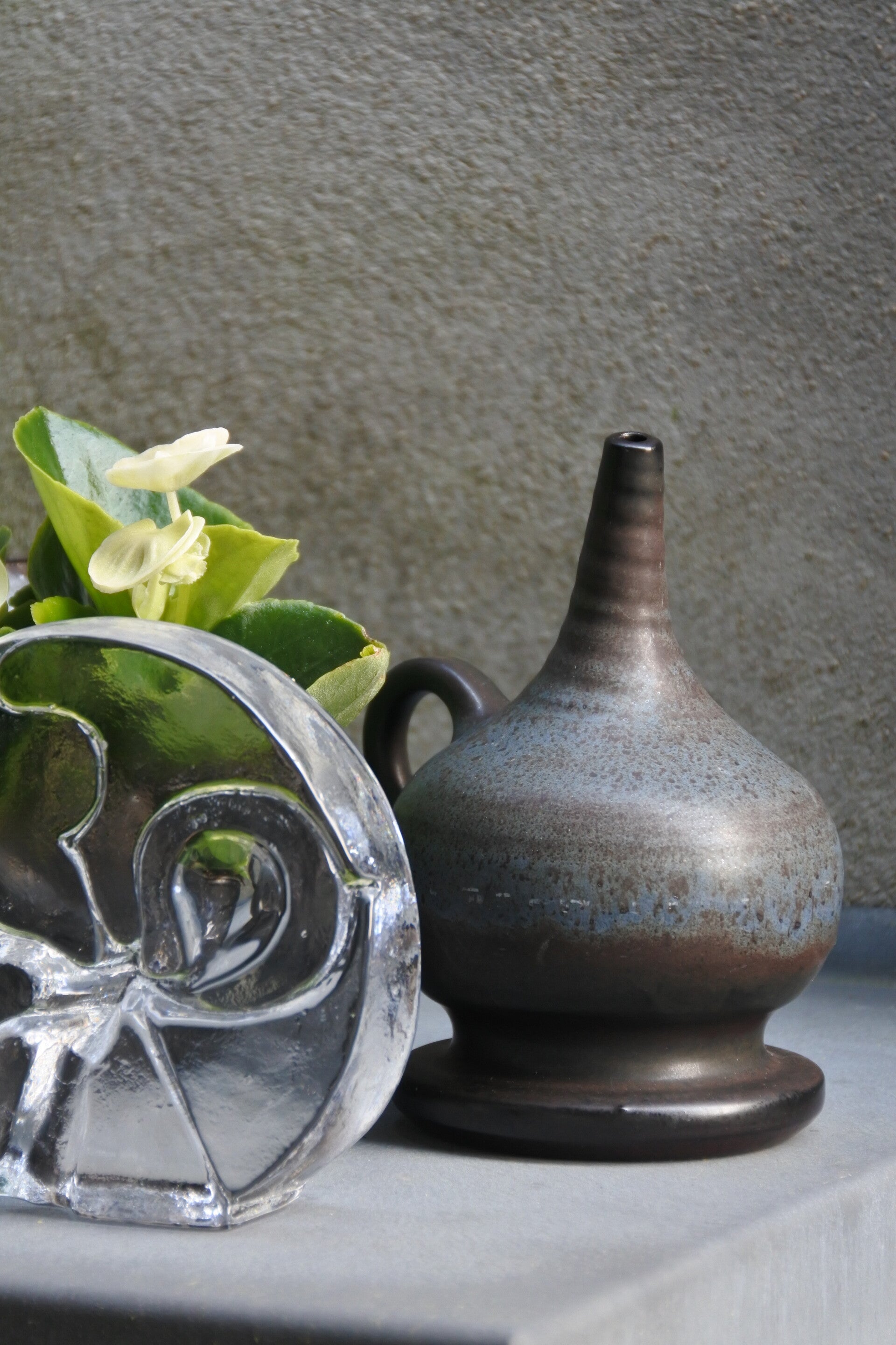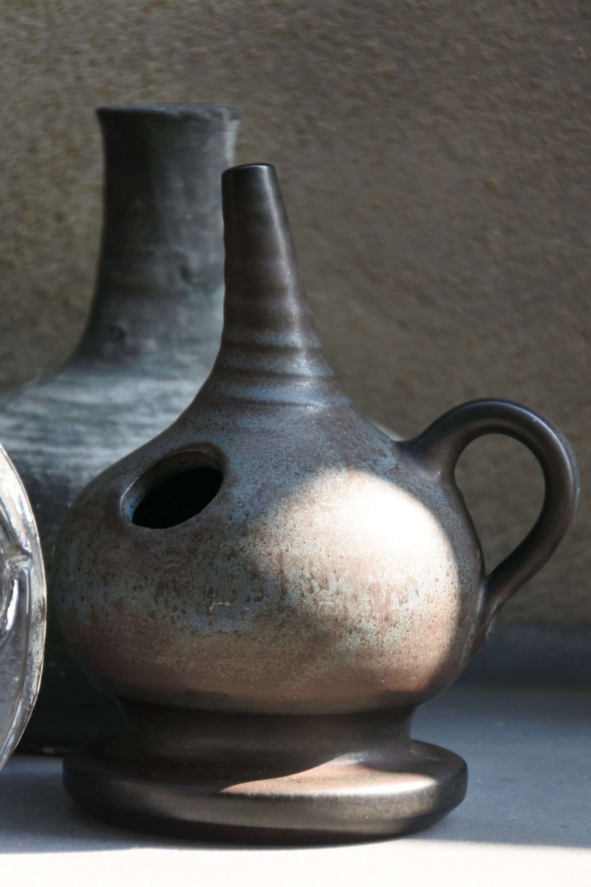 Mooi olielampje van steengoed met mooie kleurschakeringen van blauw naar grijs naar bruin.