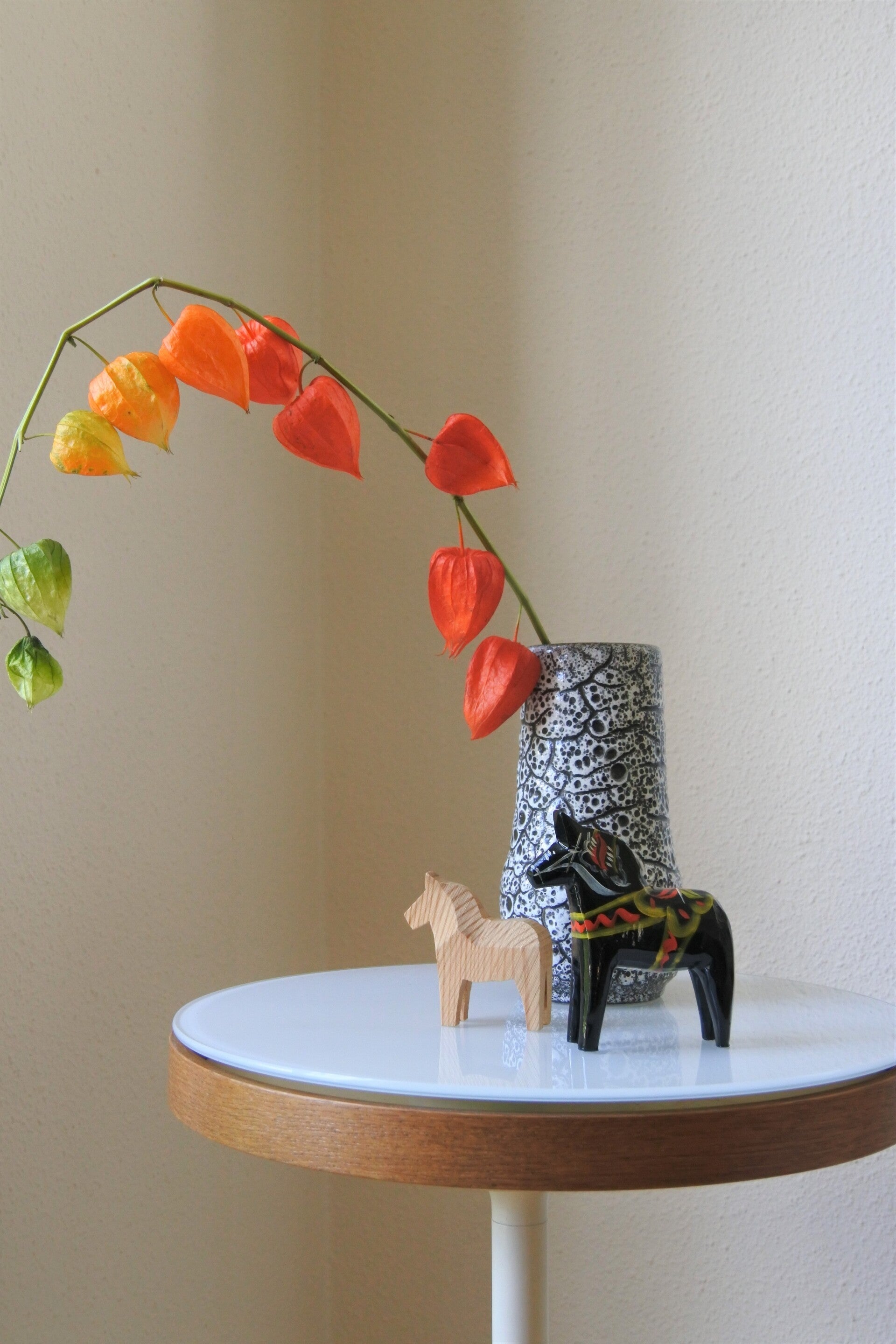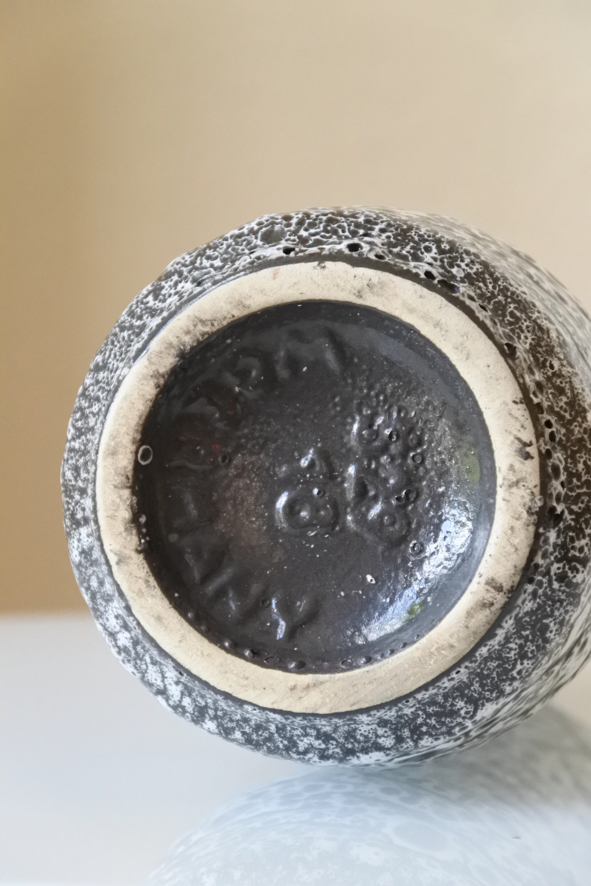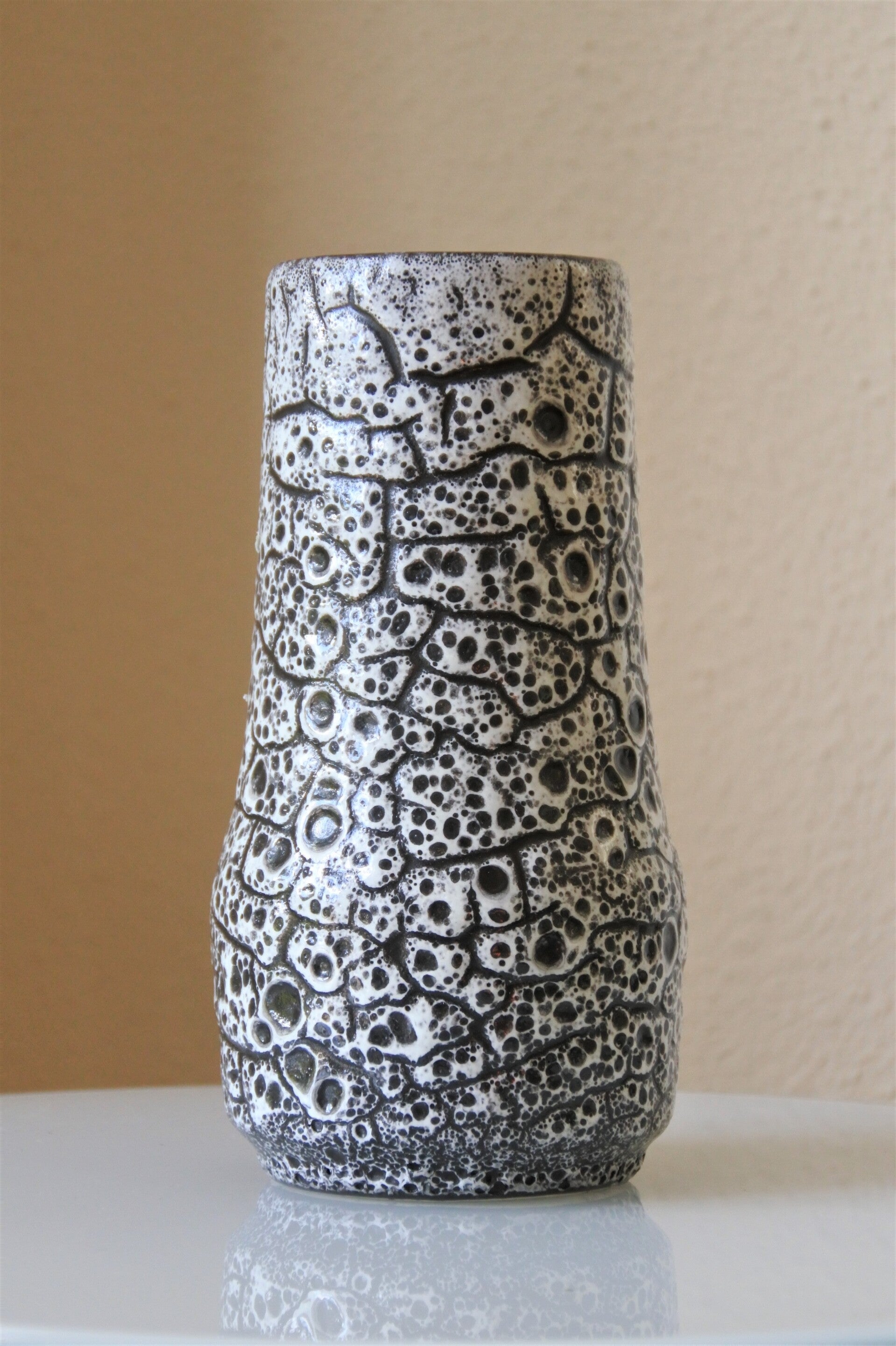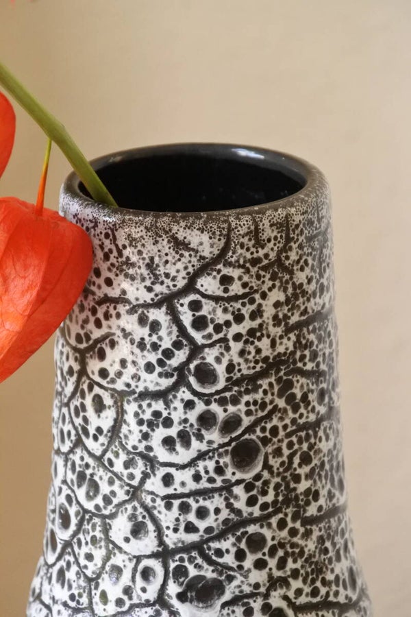 Deze bijzondere vaas van Scheurich heeft een prachtig wit craquele decor op een zwarte ondergrond.