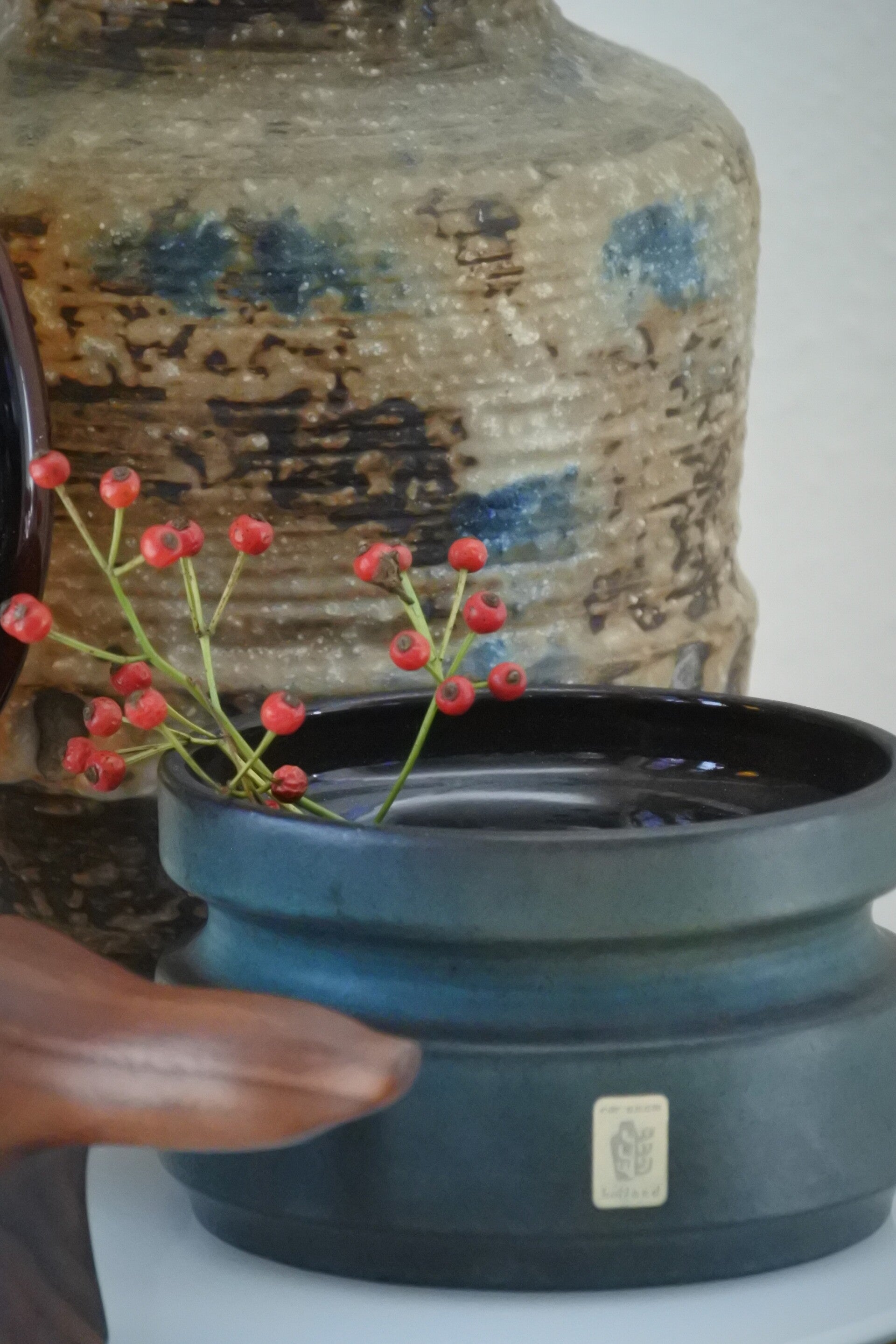 Prachtige sierschaal - pot van hollandse design meester Cor Unum in een prachtige diepe groene kleur met espressokleurige details. Het originele stickertje zit er nog op, echt een zeldzame vondst!