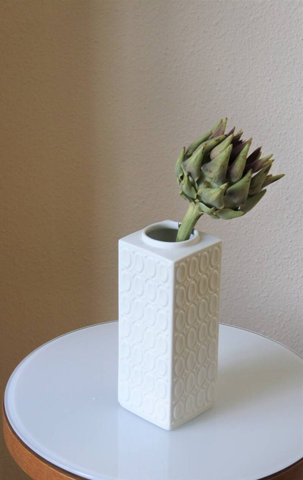Deze unieke witte porseleinen is van Bavaria Seltmann Weiden en ontworpen in de 70's. Deze vaas heeft een prachtig sereene look wat een tikje doet denken aan scandinavisch design maar toch een funky patroon design waar we zo dol op zijn bij West Germany vazen. Best of both worlds dus!