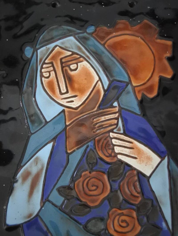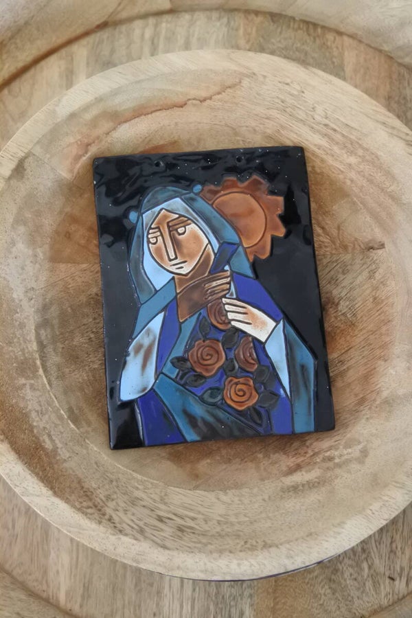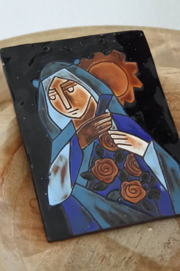 Dit lieve prachtige handgemaakte plaatje van geglazuurd keramiek is van Nederlands design trots Henk Potters van Pottenbakkerij Potters uit Oisterwijk. De achtergond is zwart met een afbeelding van Maria in blauw, geel, bruin en groen tinten.
