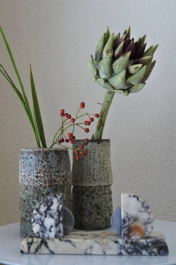 Mooie set van 2 vintage bruisglazuur vazen in zachte grijstonen met hier en daar een spatje blauw en paars. Stoer, robuust maar toch ook zachte kleuren.. de perfecte combinatie toch?